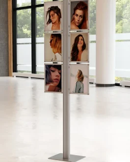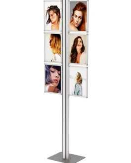 - - Anodowane aluminium stelaż aluminiowy. - Ramki A3 odpinane mocowane na spineczki, umożliwiające dopięcie lub odpięcie w razie potrzeby od stelaża. - Stabilna podstawa. - 6 ramek plakatowych A3 297 x 420mm - Polski produkt.