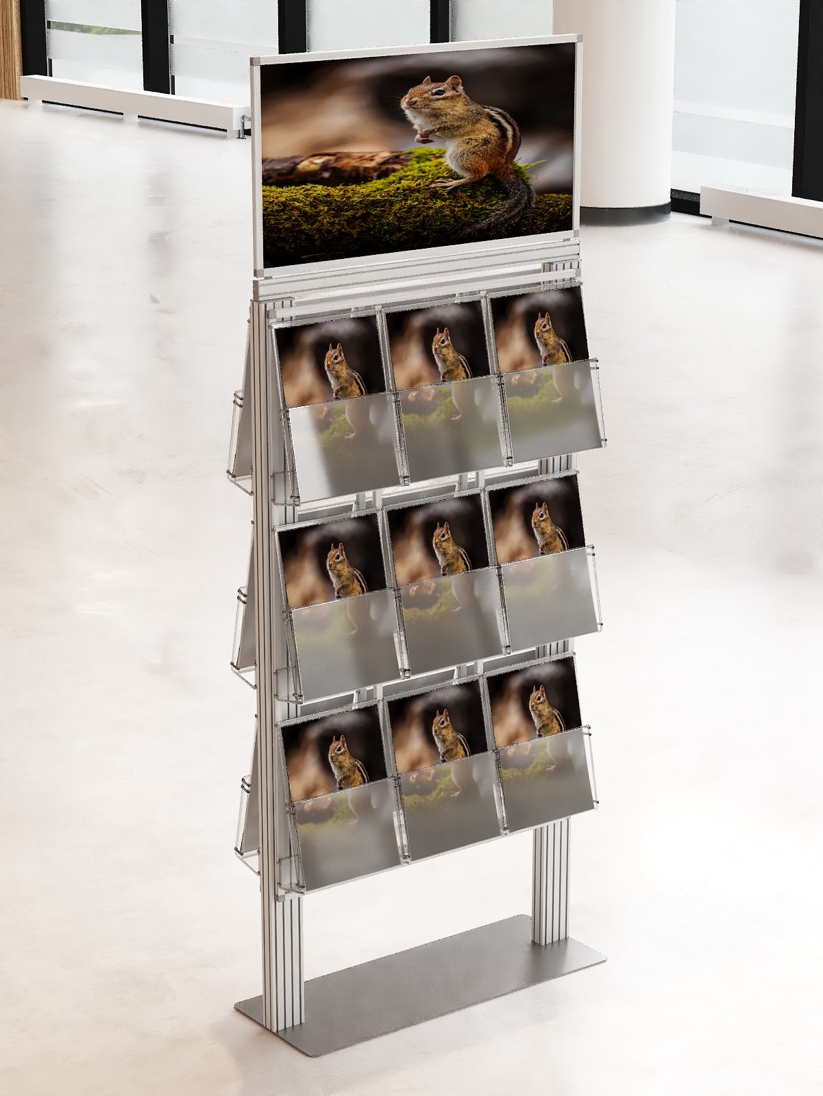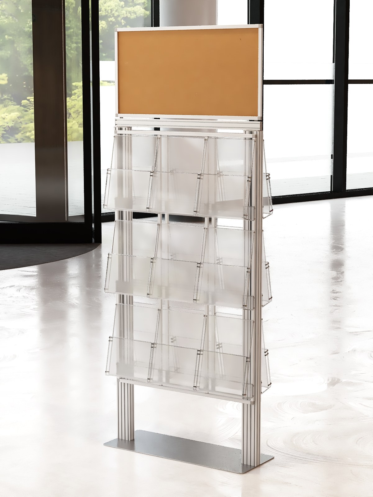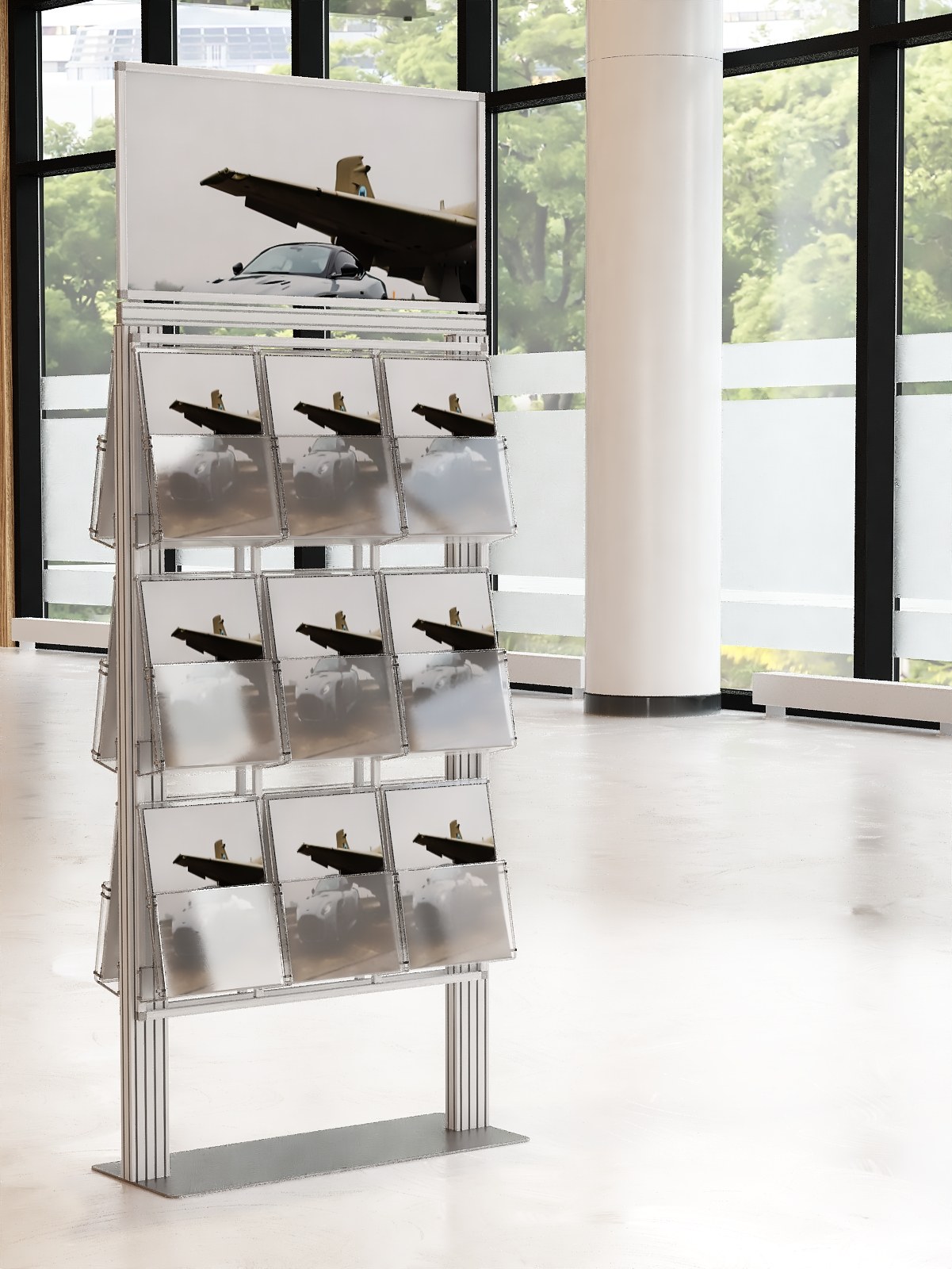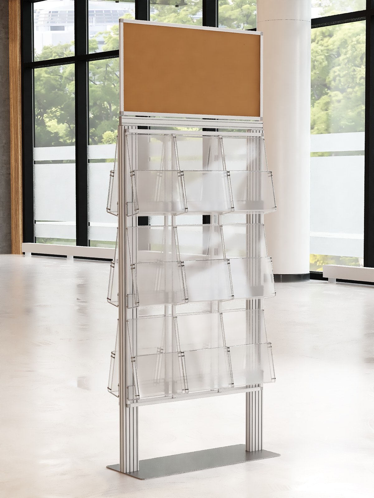Duży stojak na ulotki z anodowanego aluminium.