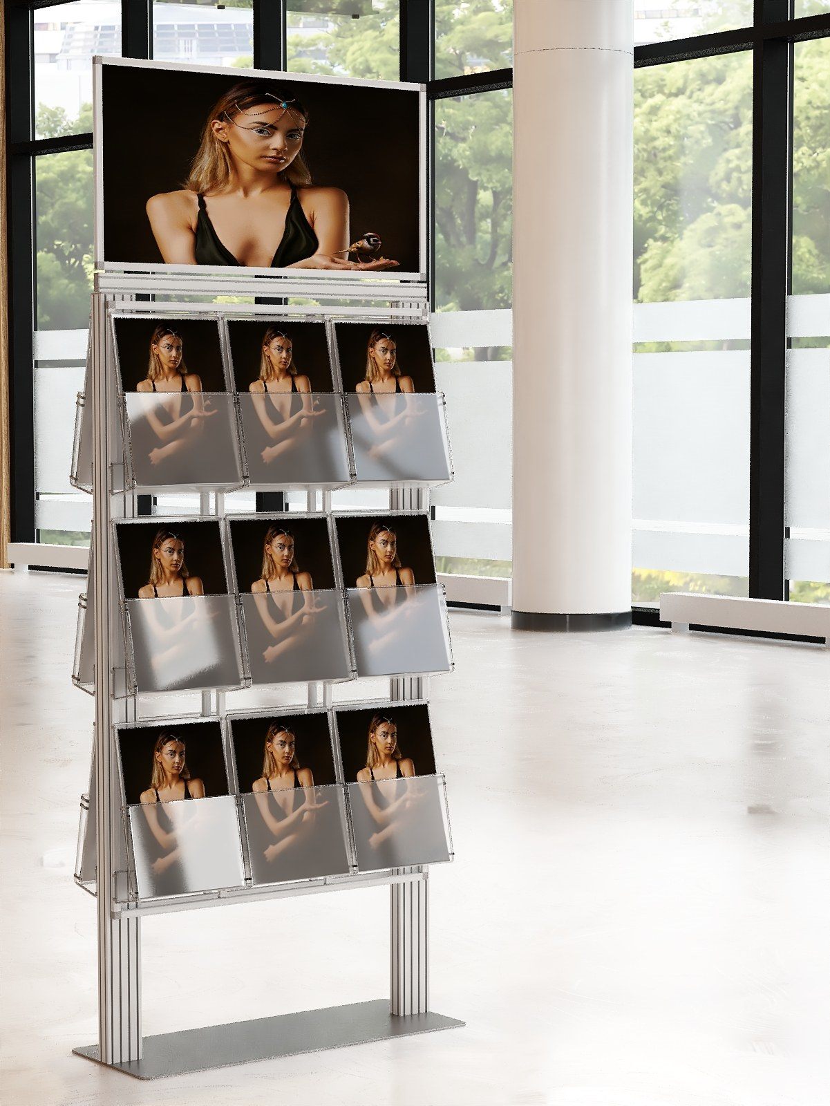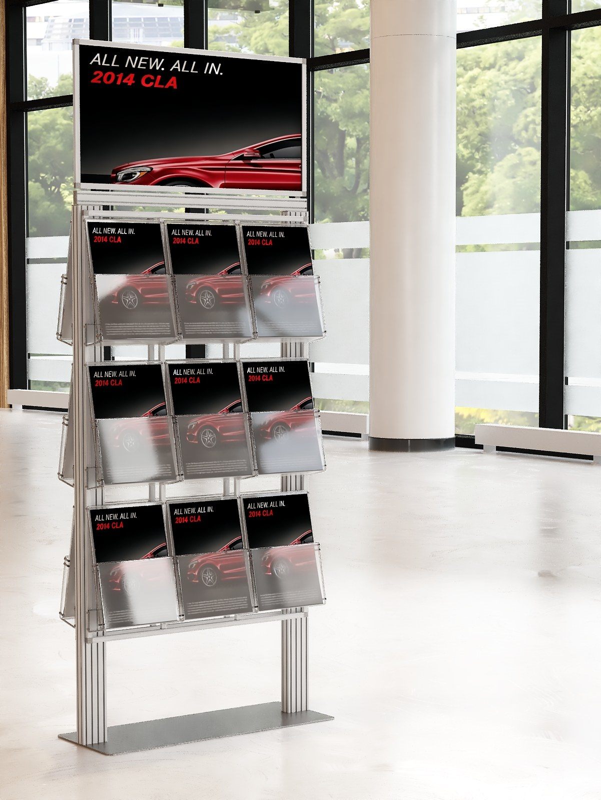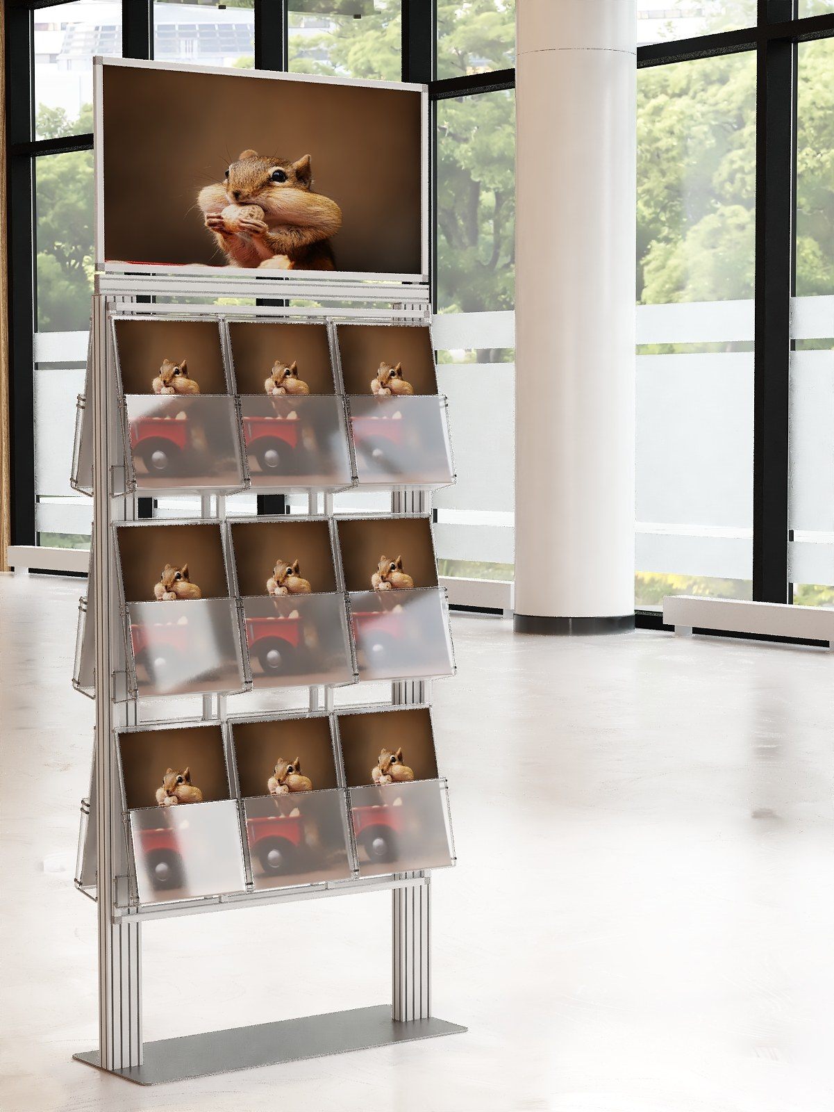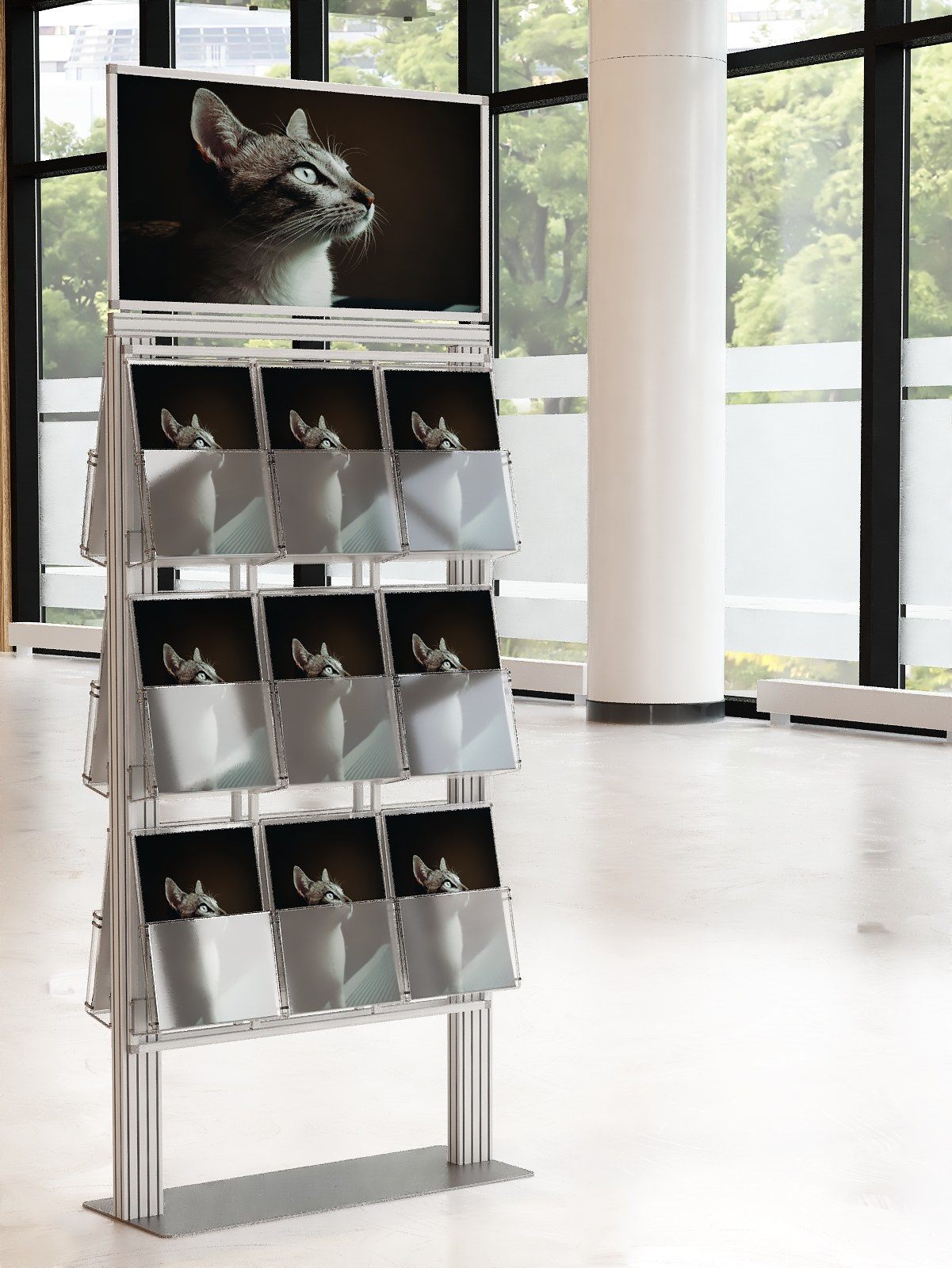 Duży stojak na ulotki z anodowanego aluminium.