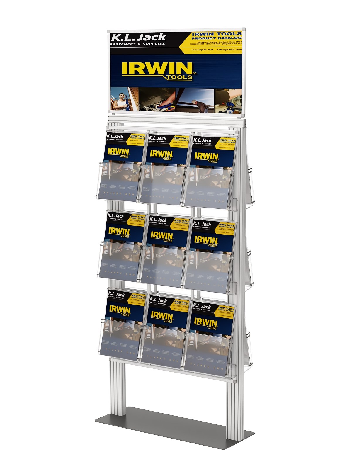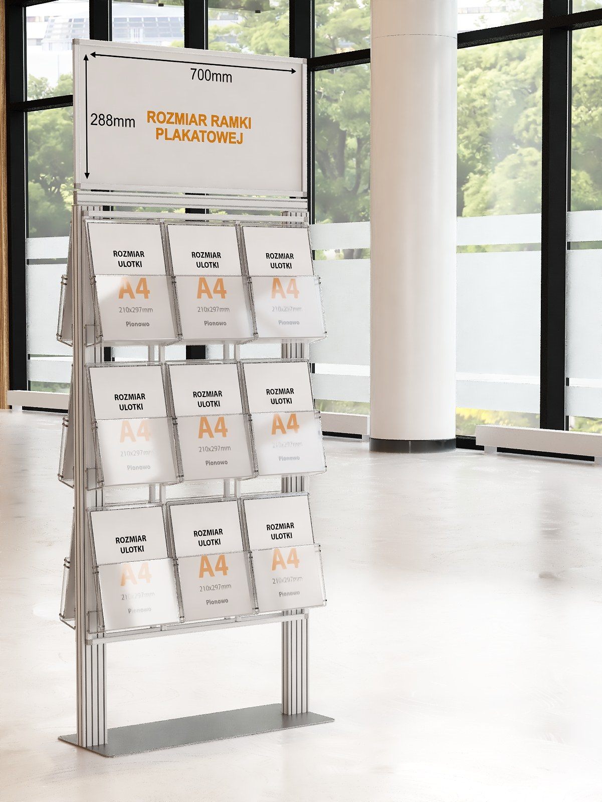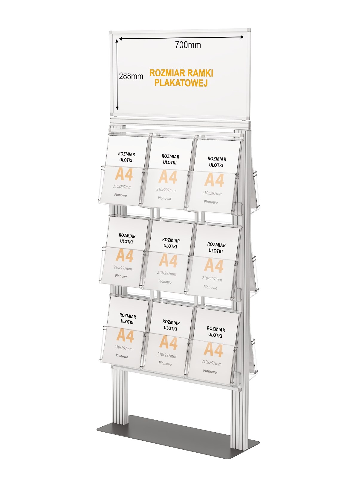 Ogromny stojak na 18 kieszeni A4 pionowo i masywnej podstawie metalowej 700 x 288 mm oraz dużą ramką plakatową 700x288mm.
