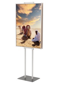 Dwustronny stojak na plakat z dwiema ramkami plakatowymi o wymiarach 700 x 1000mm. Wykonany z anodowanego aluminium oraz metalowej podstawy.