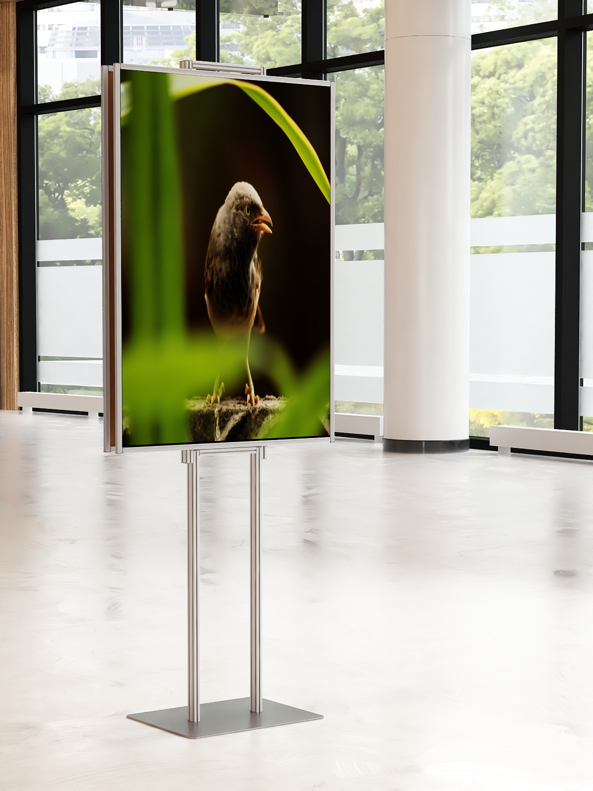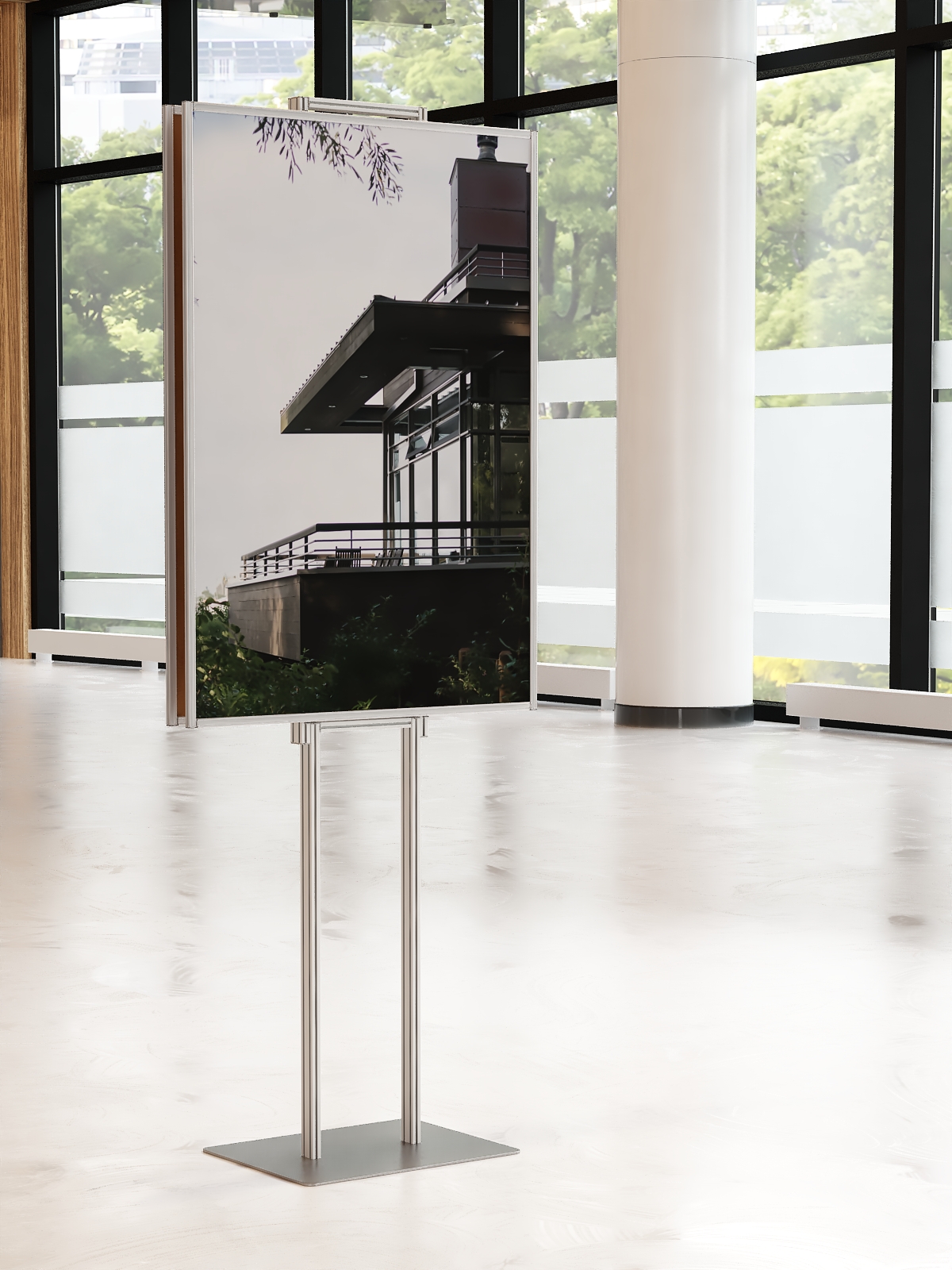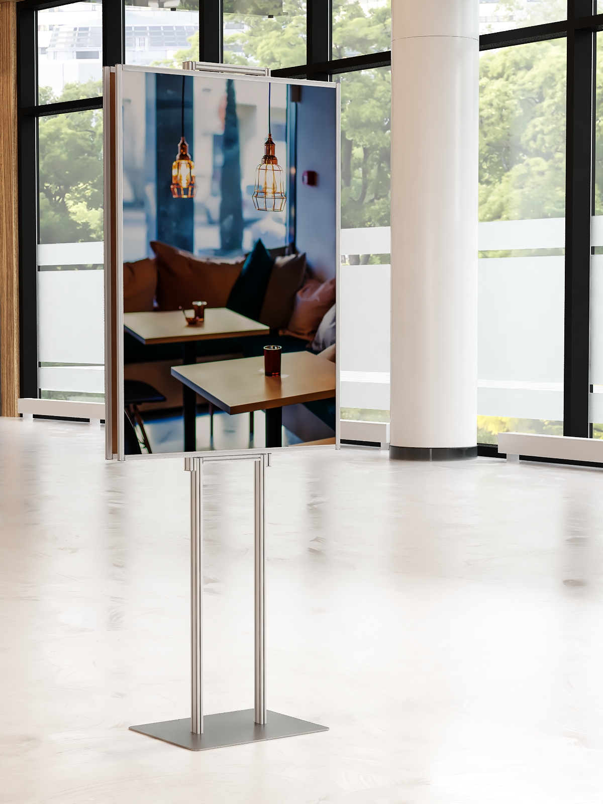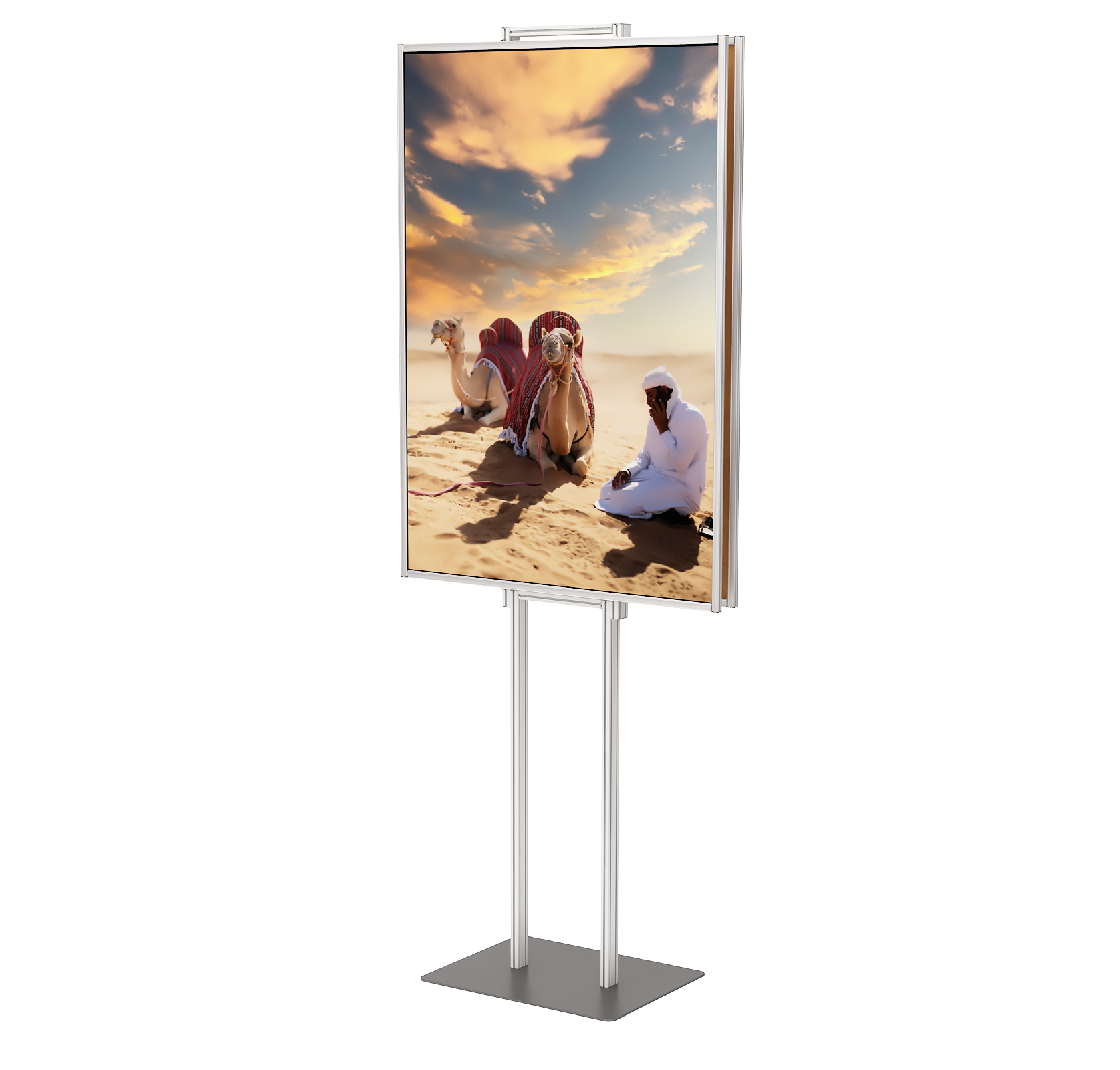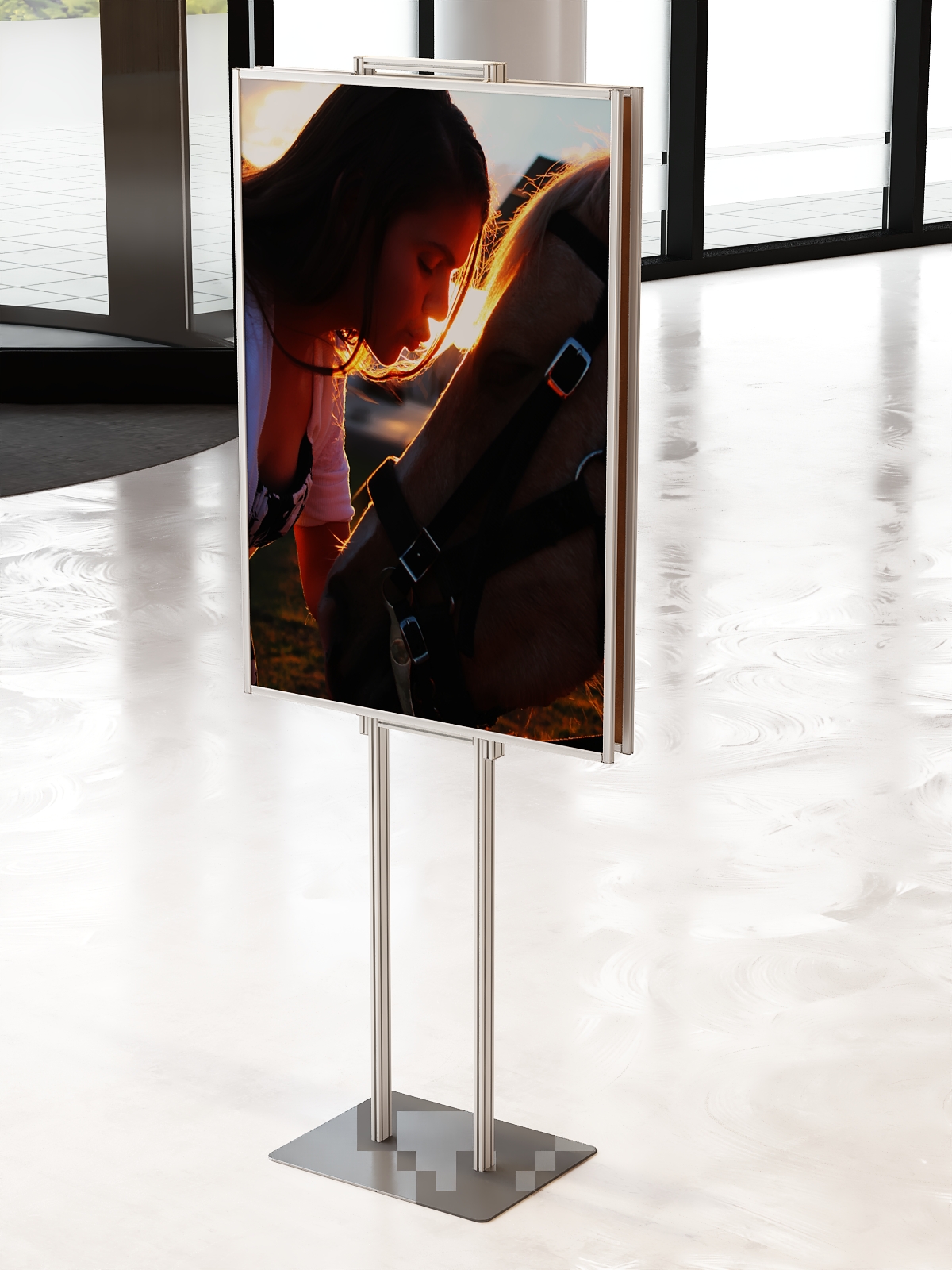 Dwustronny stojak na plakat z dwiema ramkami plakatowymi o wymiarach 700 x 1000mm. Wykonany z anodowanego aluminium oraz metalowej podstawy.