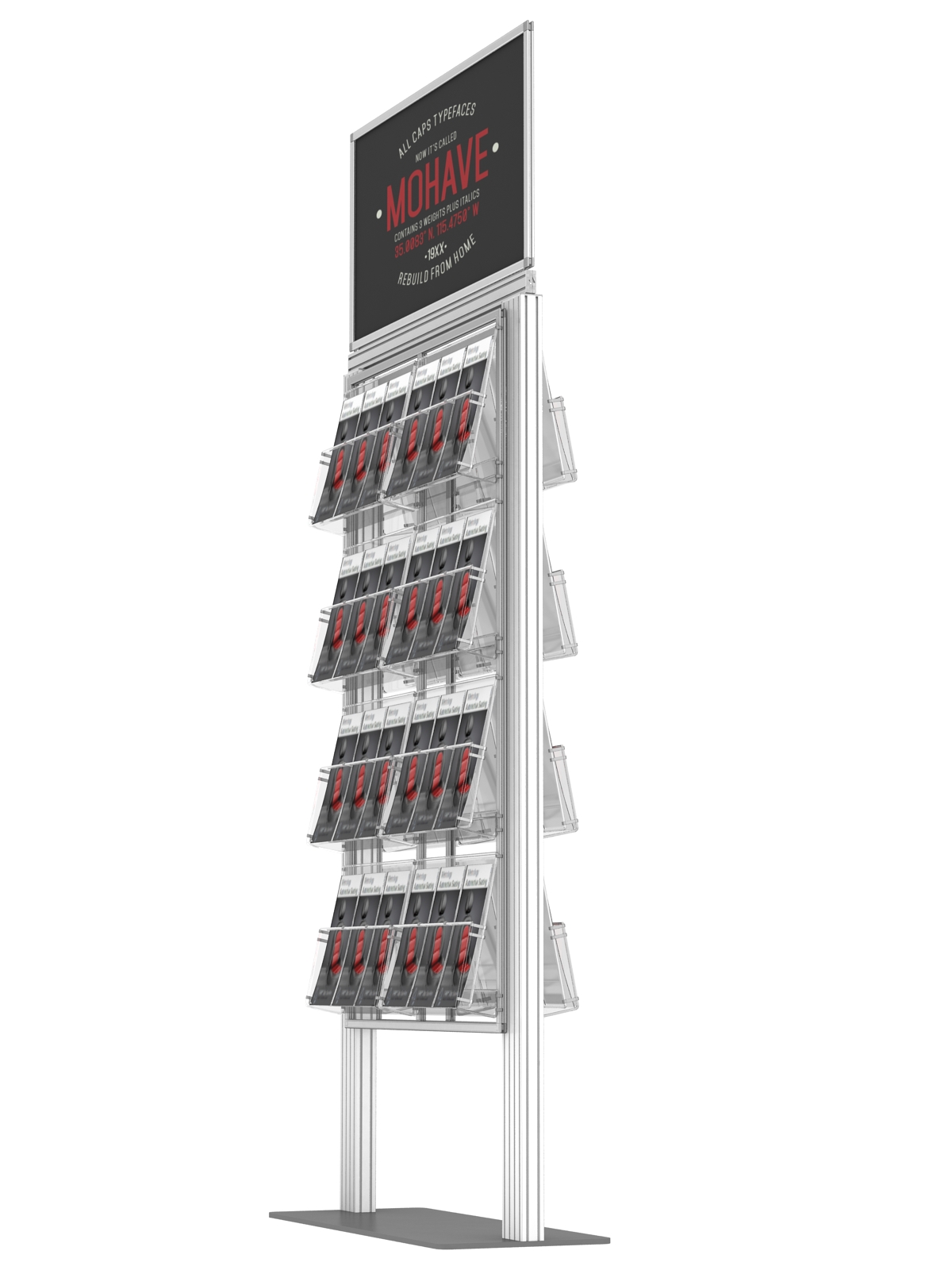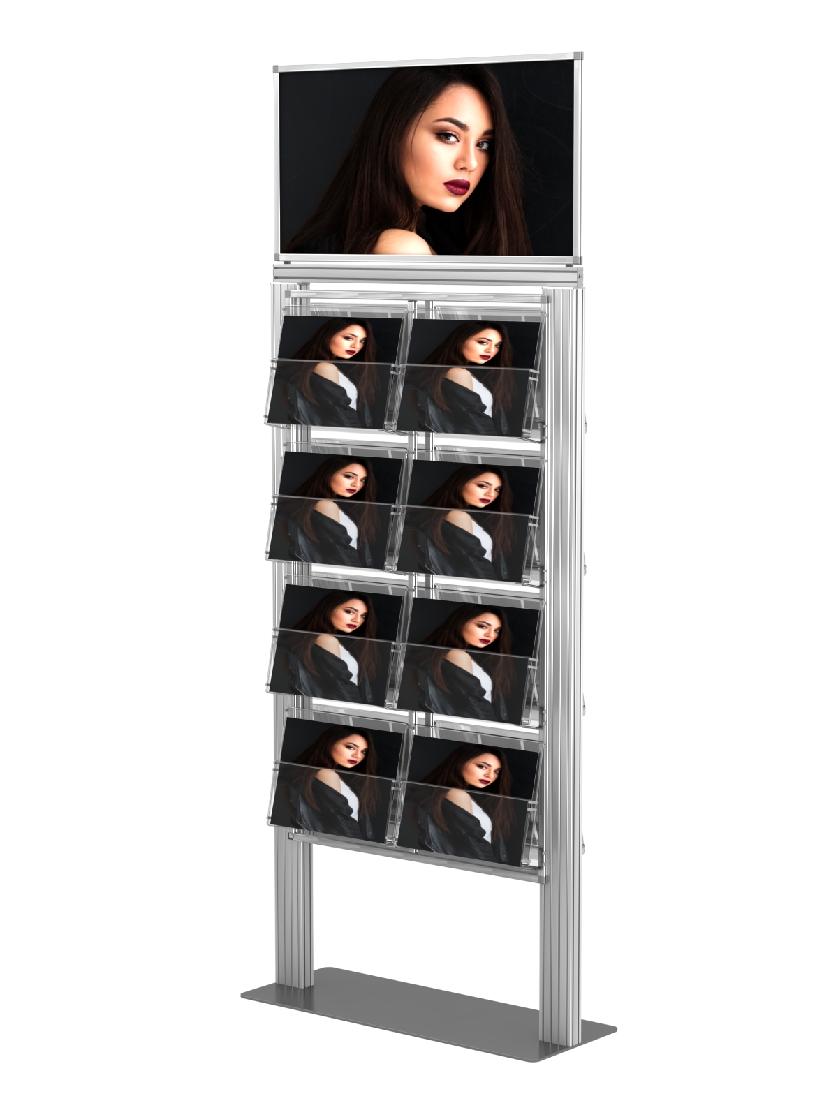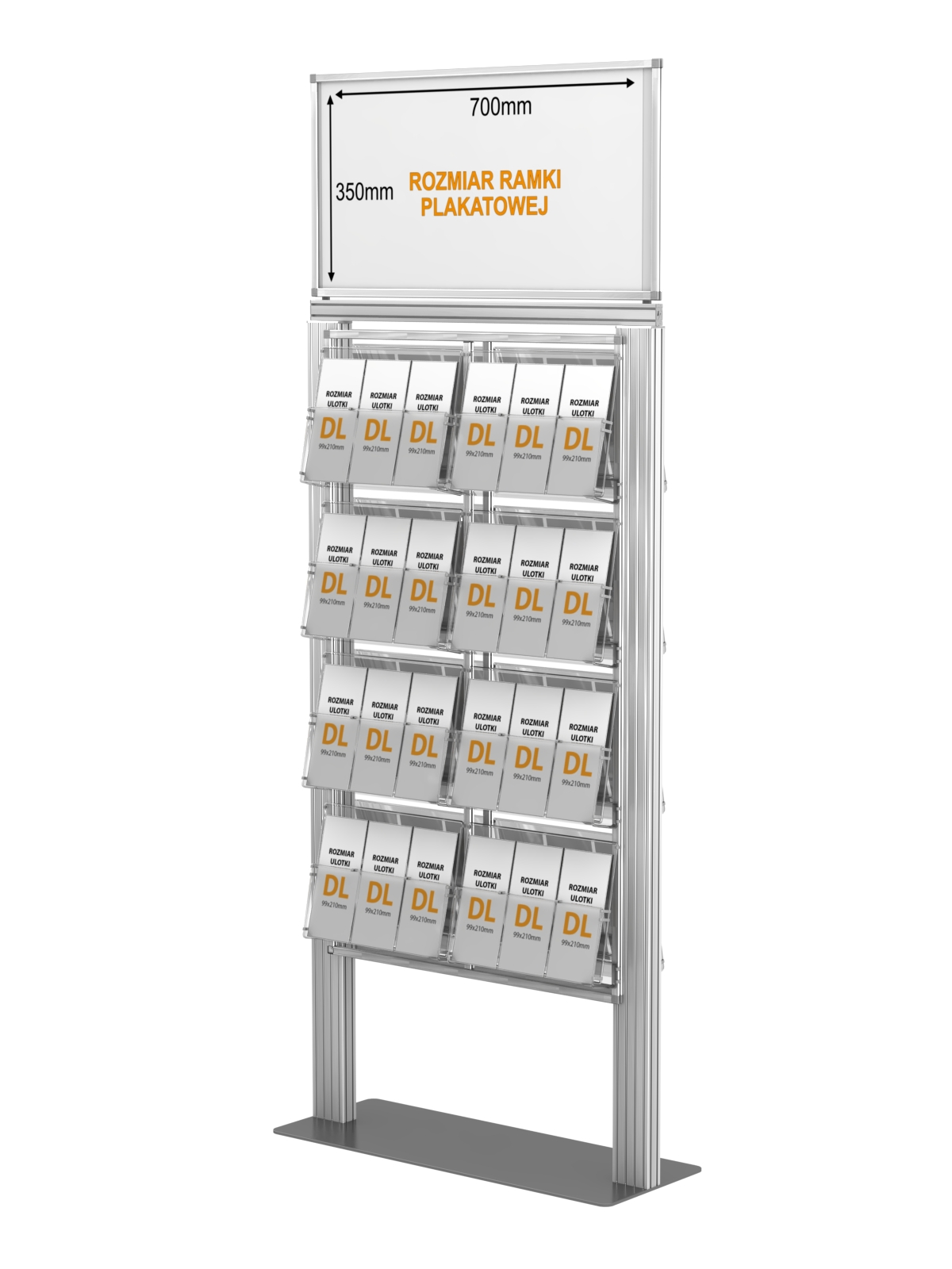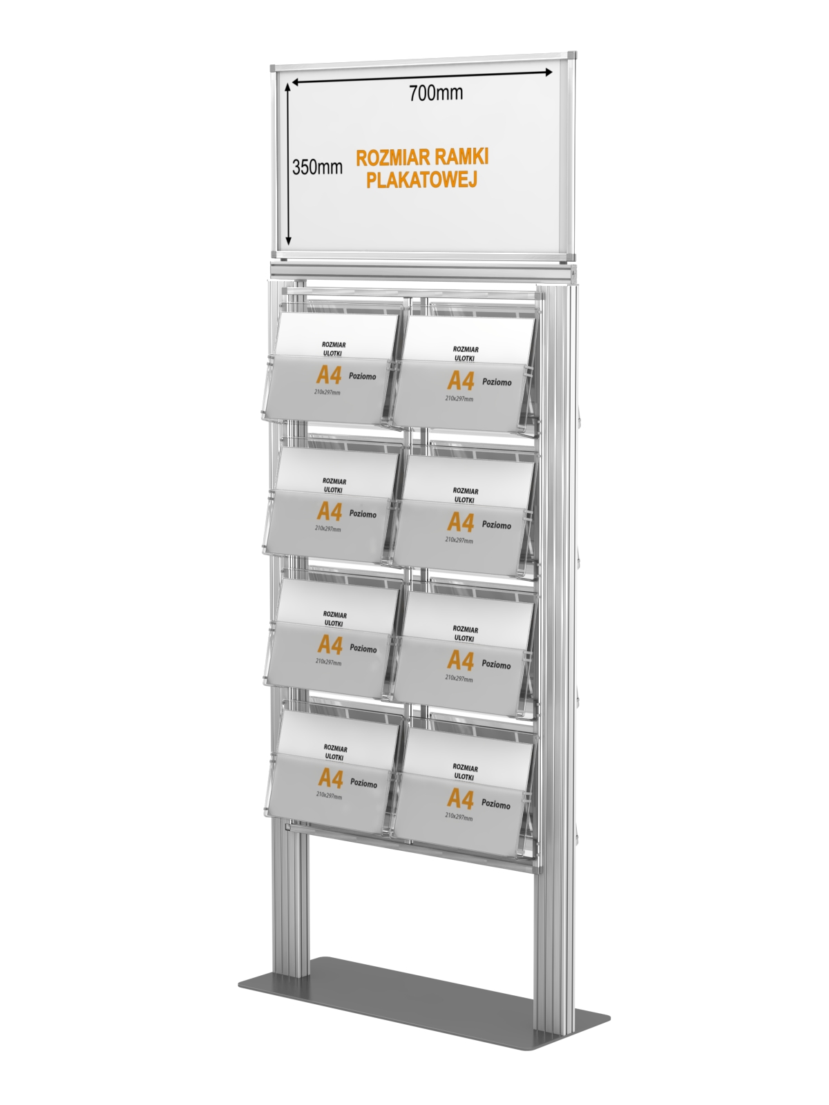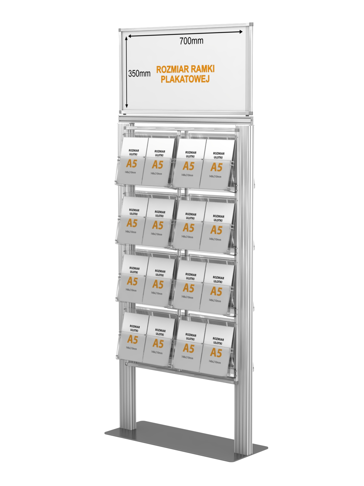 Dwustronny stojak na ulotki A4 A5 i DL na ulotki z anodowanego aluminium i ramką plakatową 500 x 350mm.