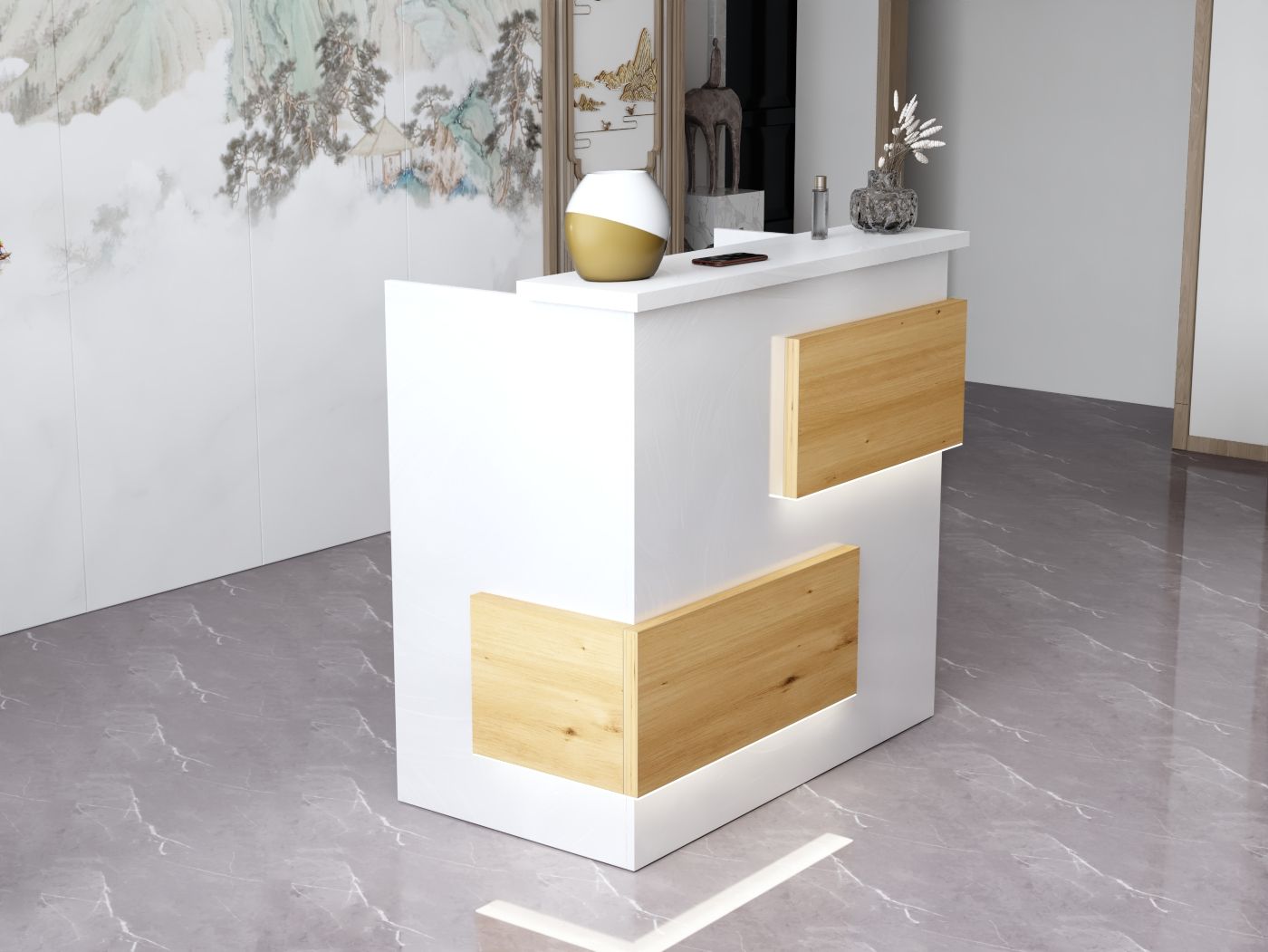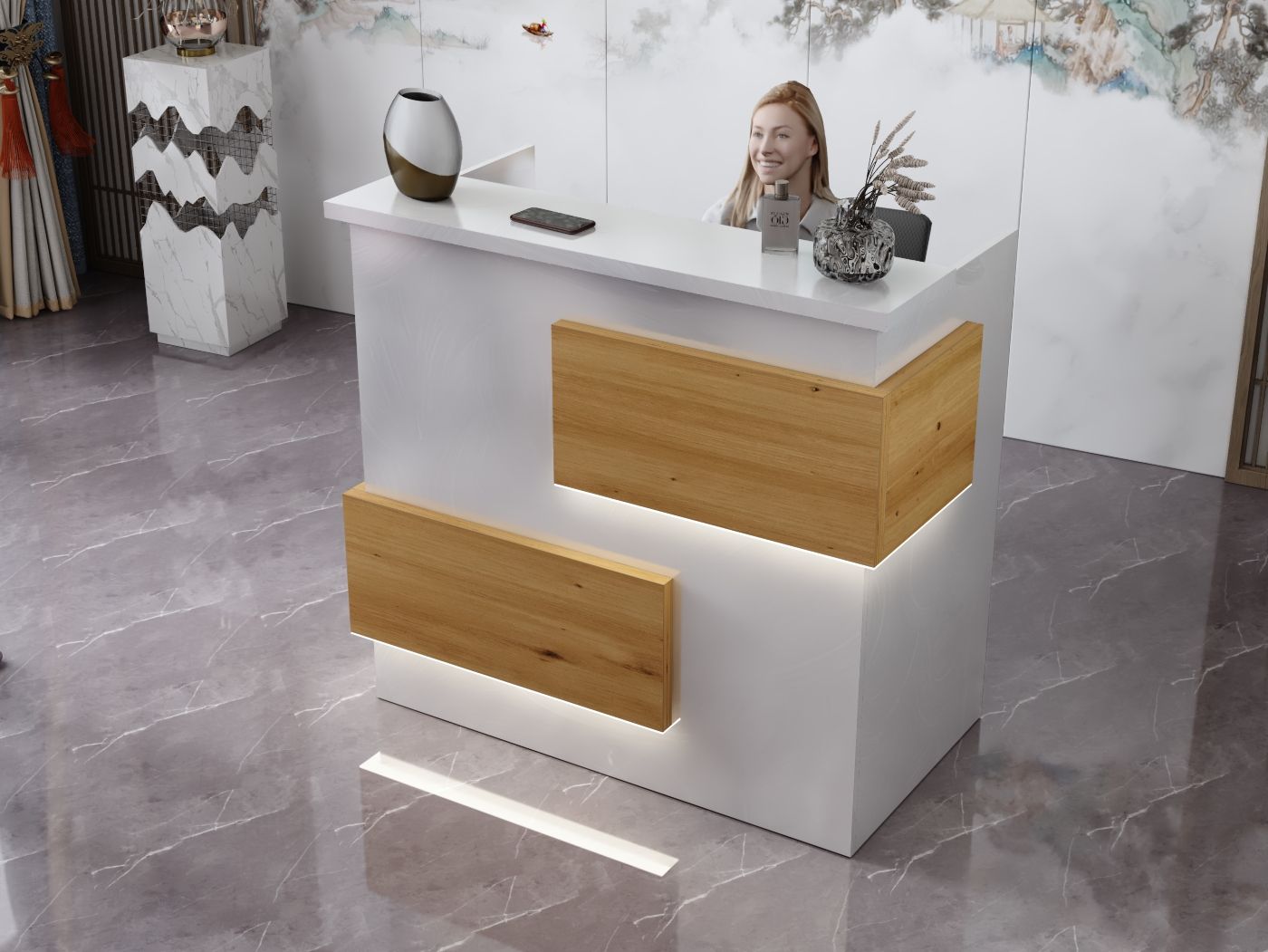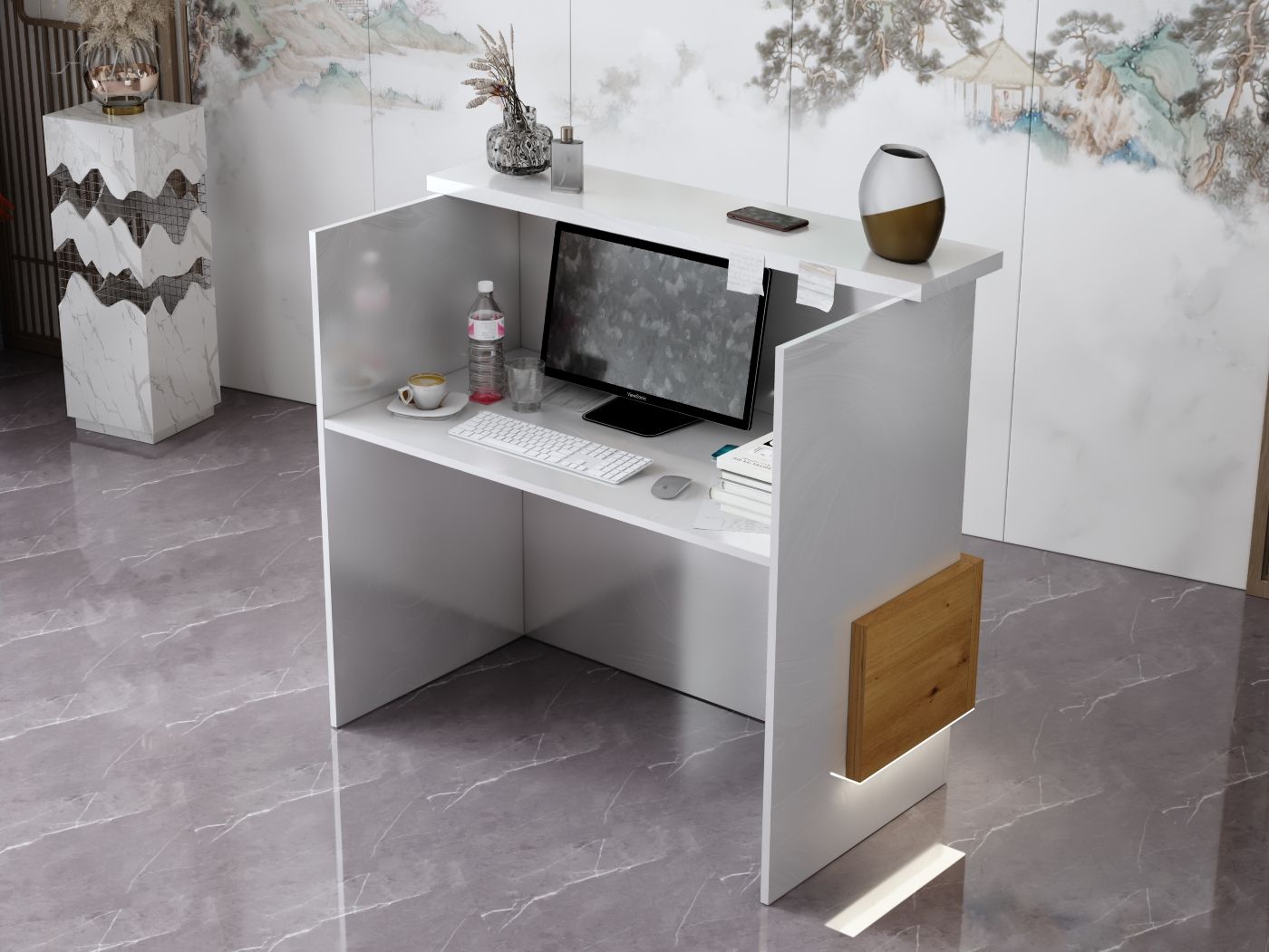2. Praktyczność: Ergonomiczna konstrukcja ułatwia pracę recepcjonisty, umożliwiając wygodną obsługę klientów, przechowywanie dokumentów i obsługę sprzętu biurowego.