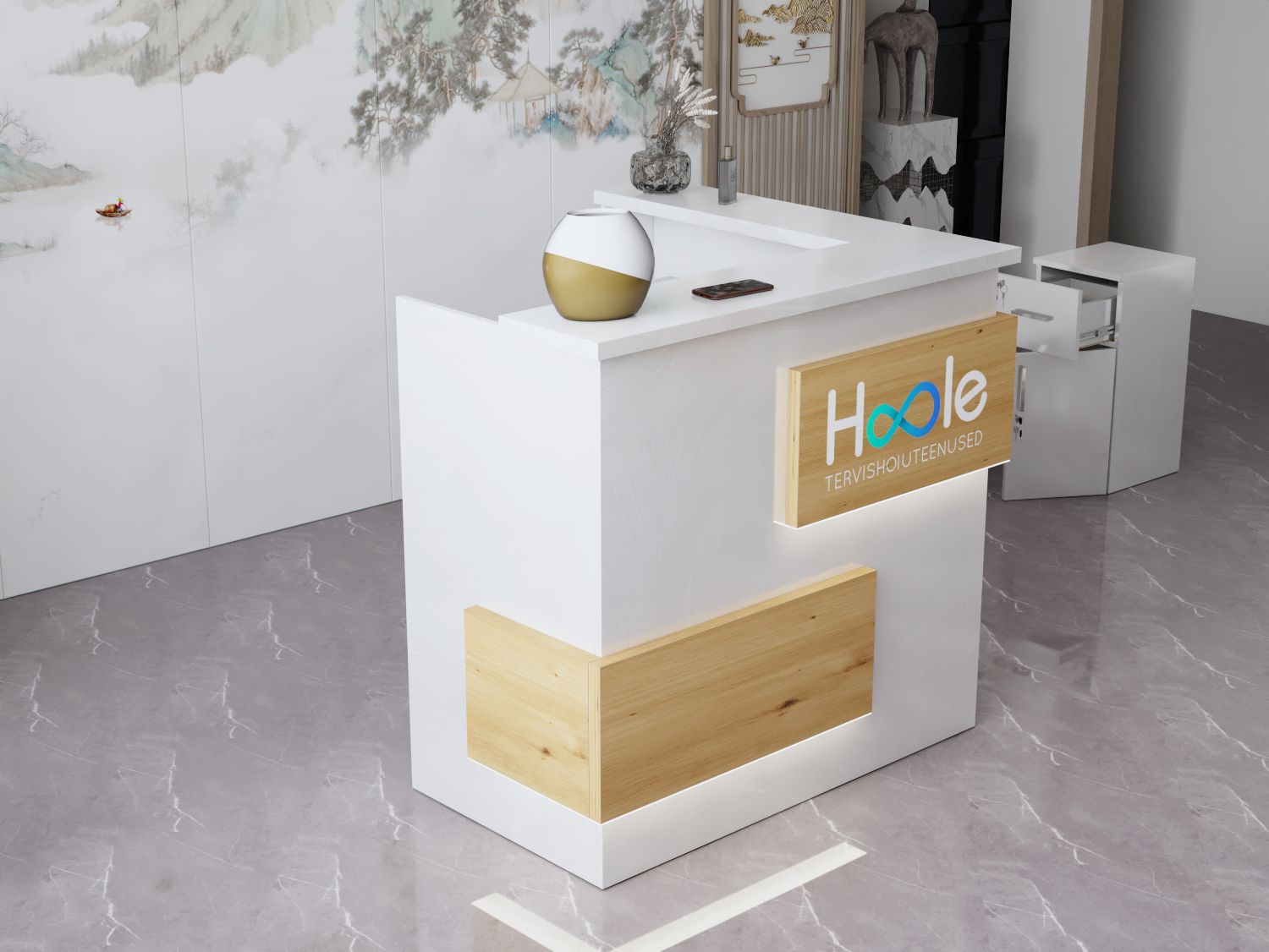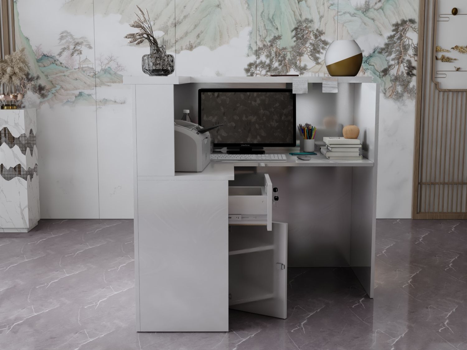 - Praktyczność: Ergonomiczna konstrukcja ułatwia pracę recepcjonisty, umożliwiając wygodną obsługę klientów, przechowywanie dokumentów i obsługę sprzętu biurowego.