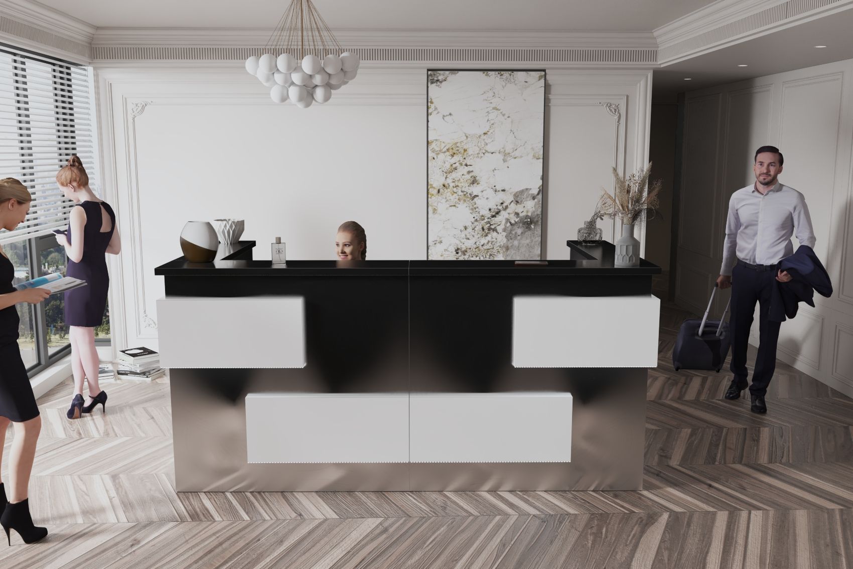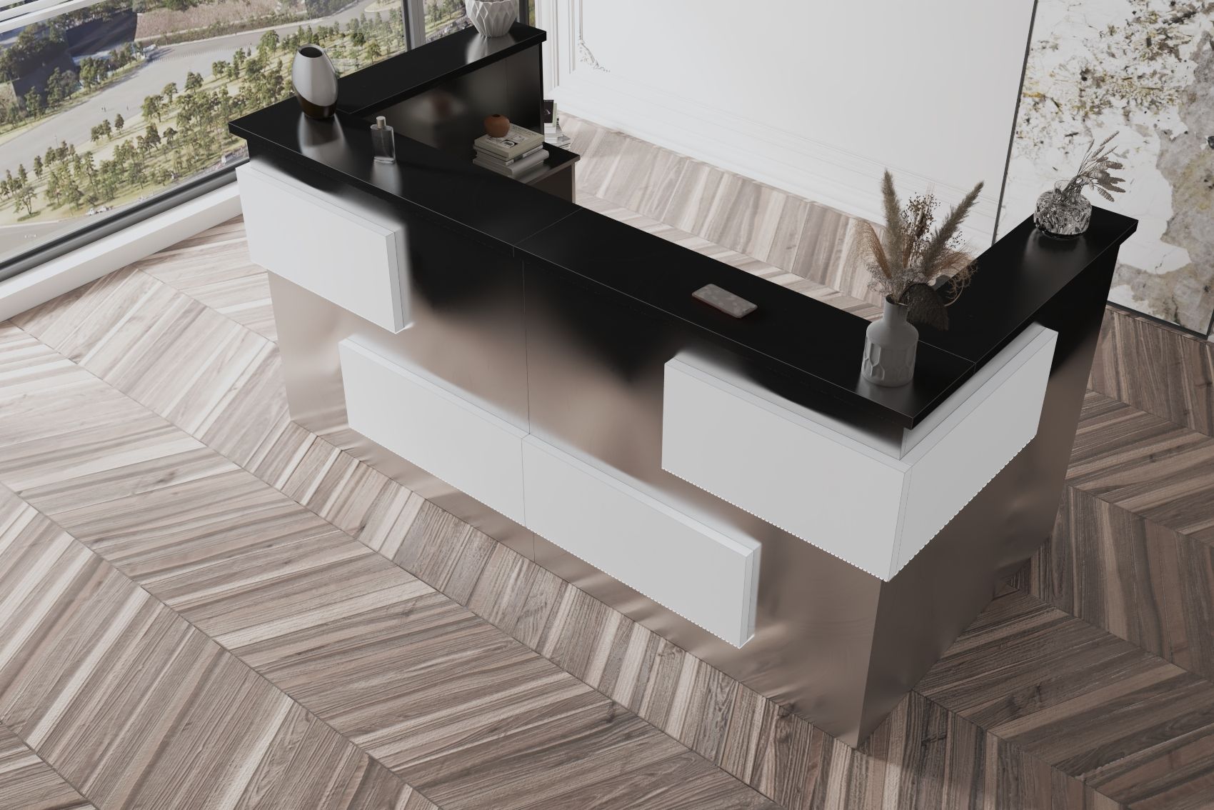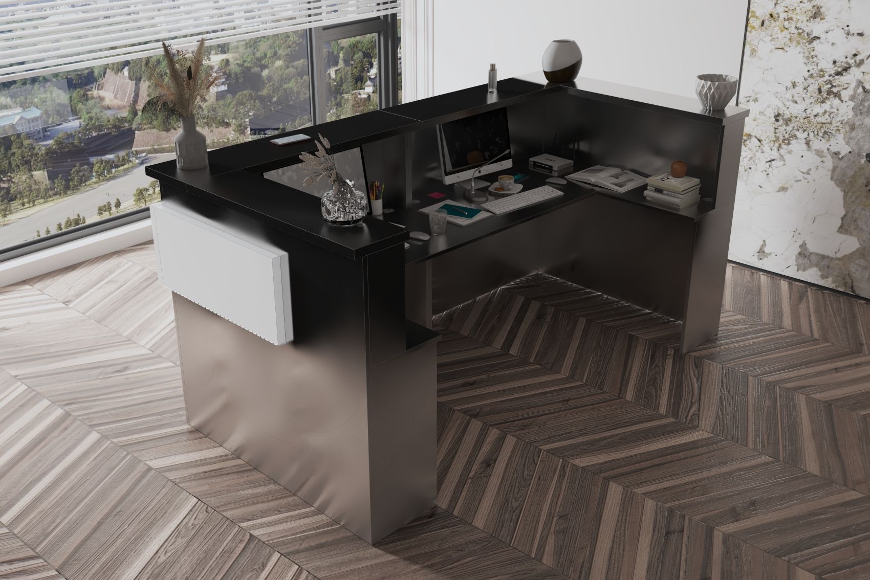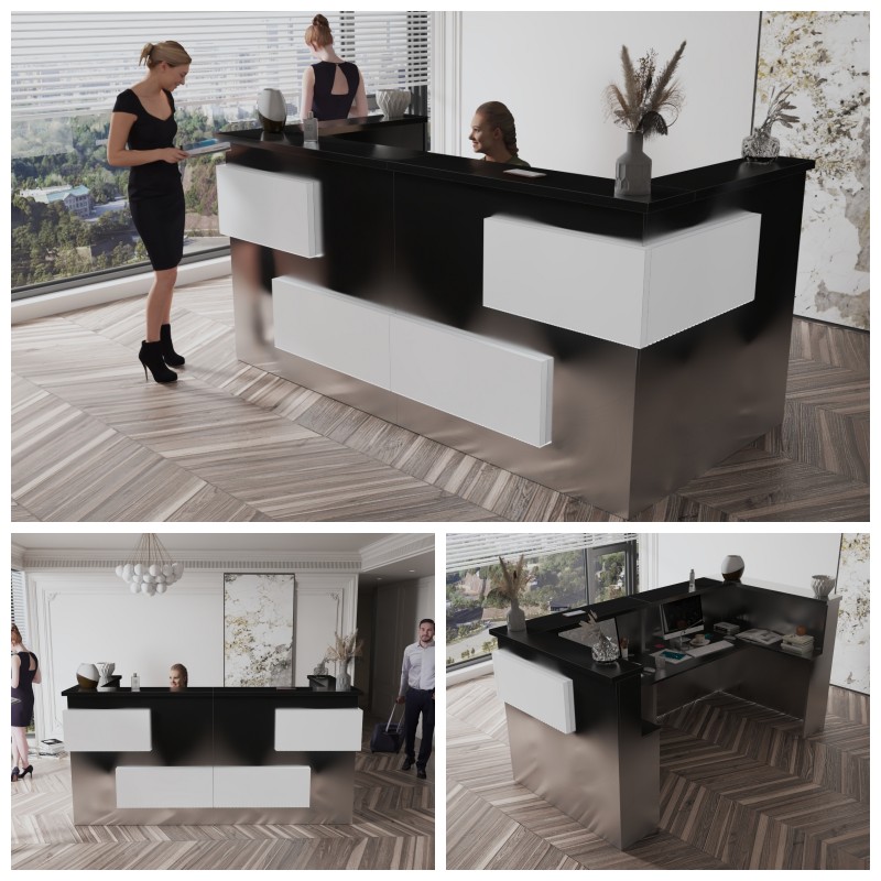 - Praktyczność: Ergonomiczna konstrukcja ułatwia pracę recepcjonisty, umożliwiając wygodną obsługę klientów, przechowywanie dokumentów i obsługę sprzętu biurowego.