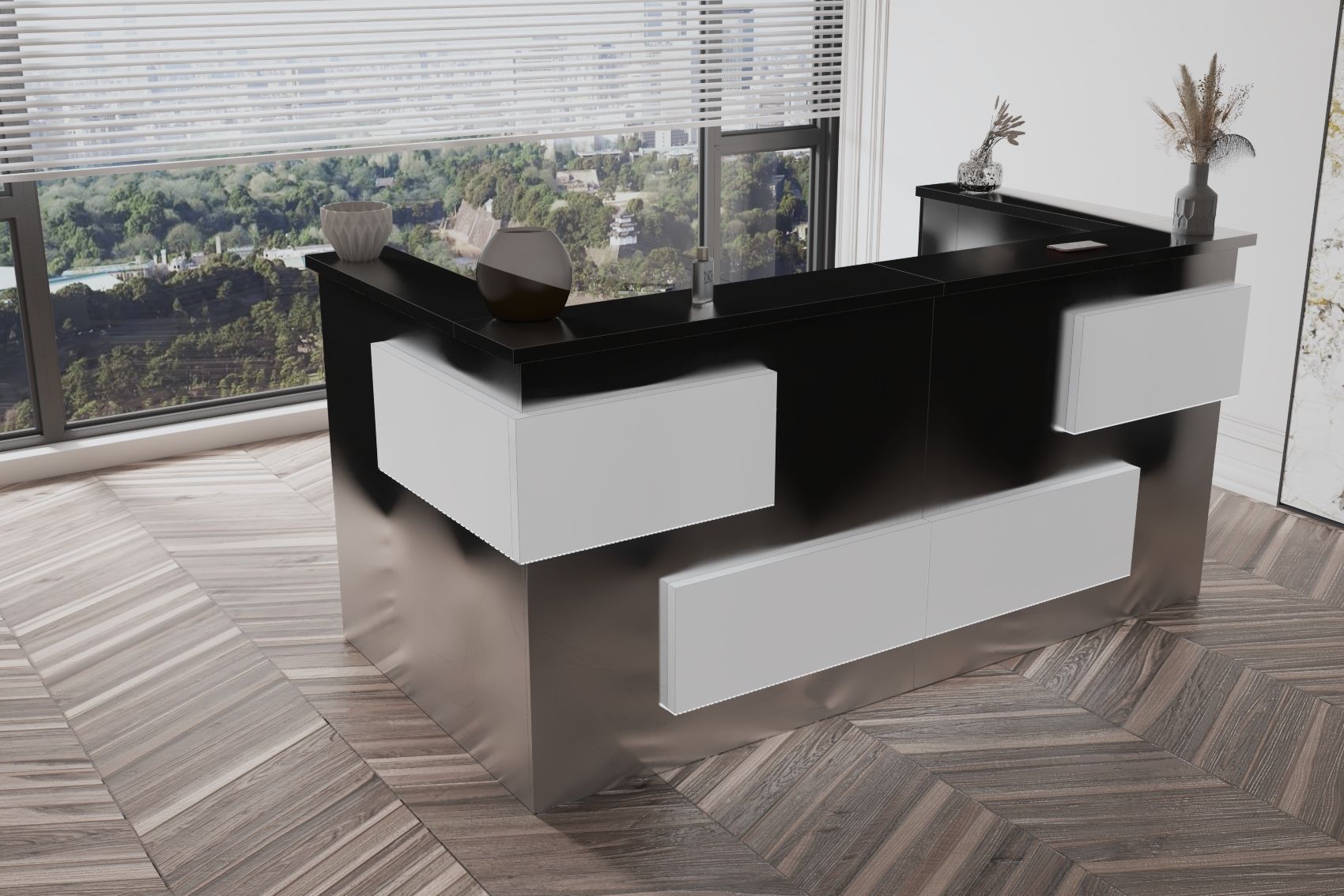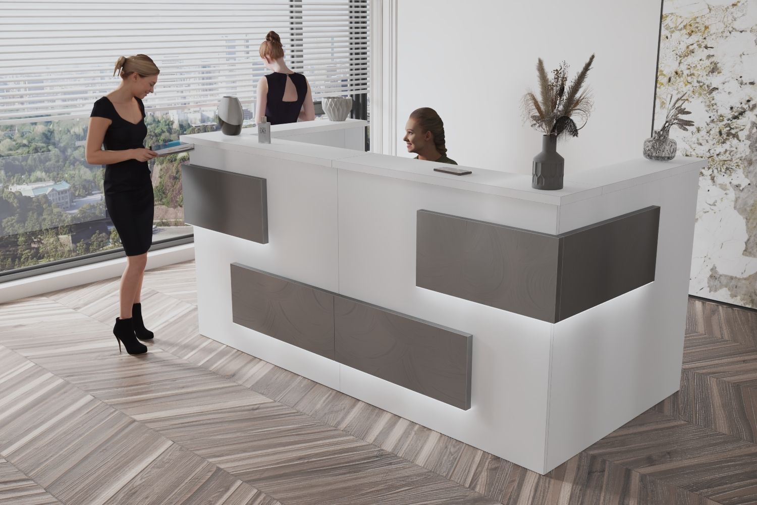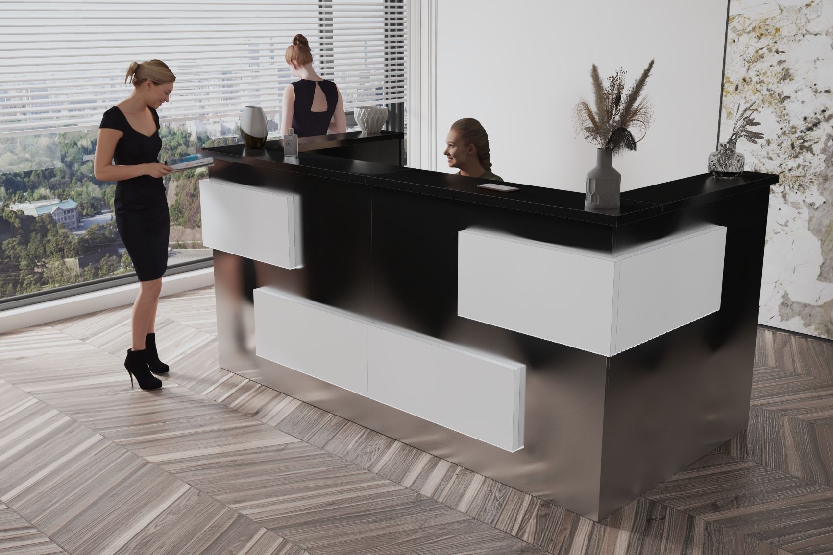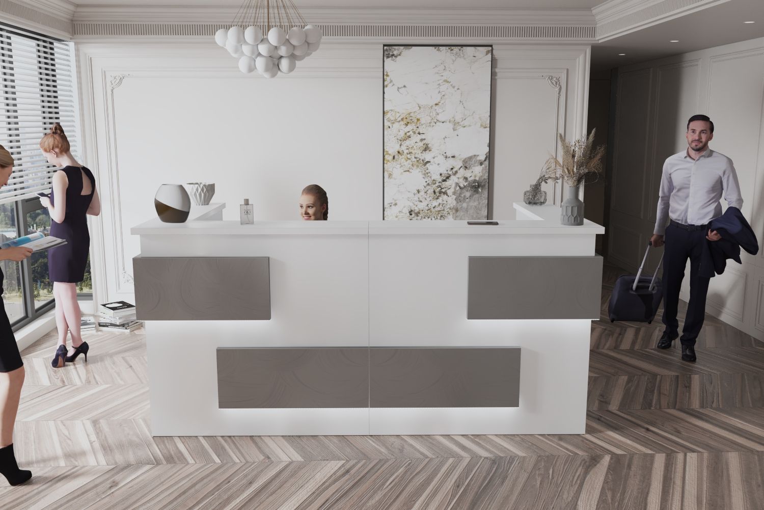 - Praktyczność: Ergonomiczna konstrukcja ułatwia pracę recepcjonisty, umożliwiając wygodną obsługę klientów, przechowywanie dokumentów i obsługę sprzętu biurowego.