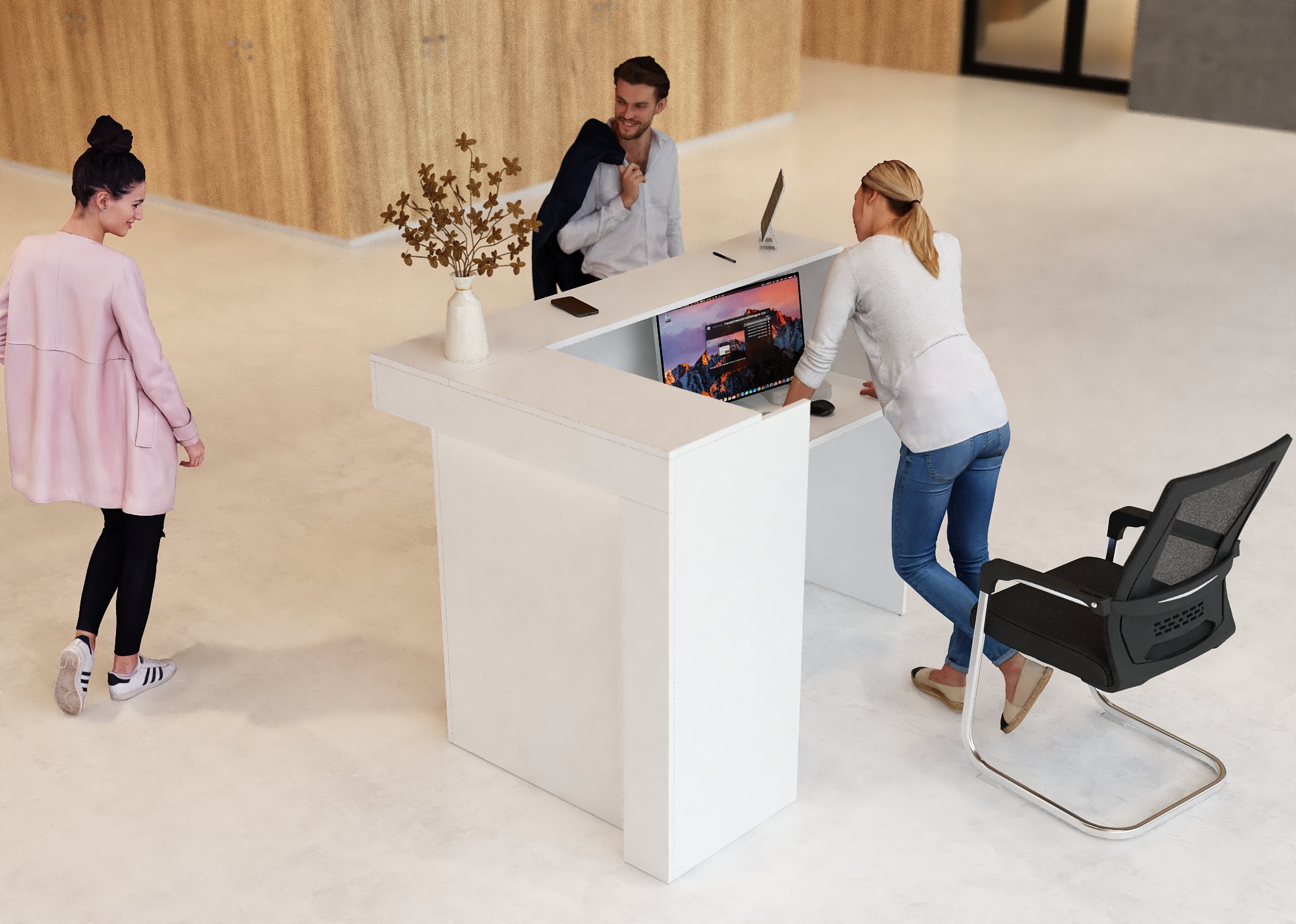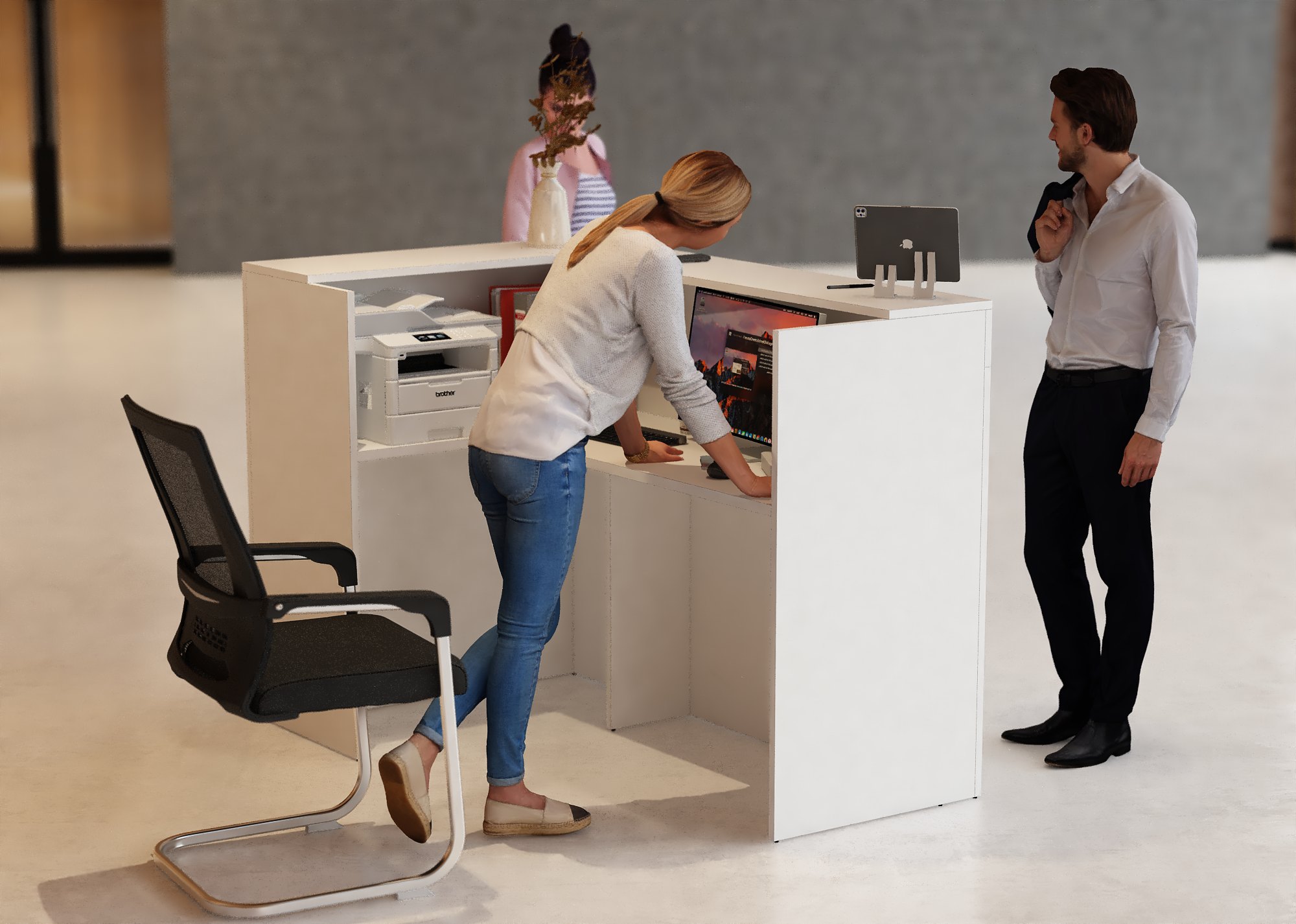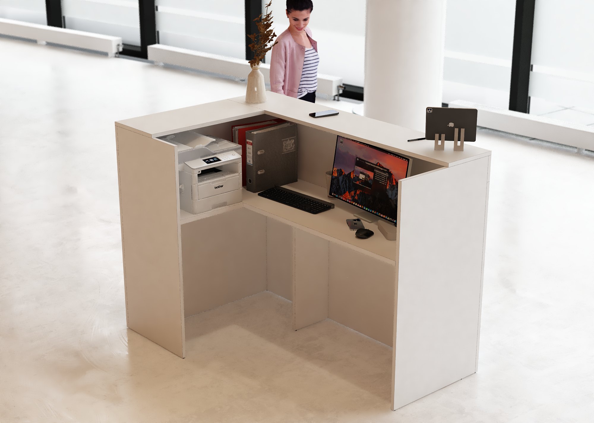 - Praktyczność: Ergonomiczna konstrukcja ułatwia pracę recepcjonisty, umożliwiając wygodną obsługę klientów, przechowywanie dokumentów i obsługę sprzętu biurowego.