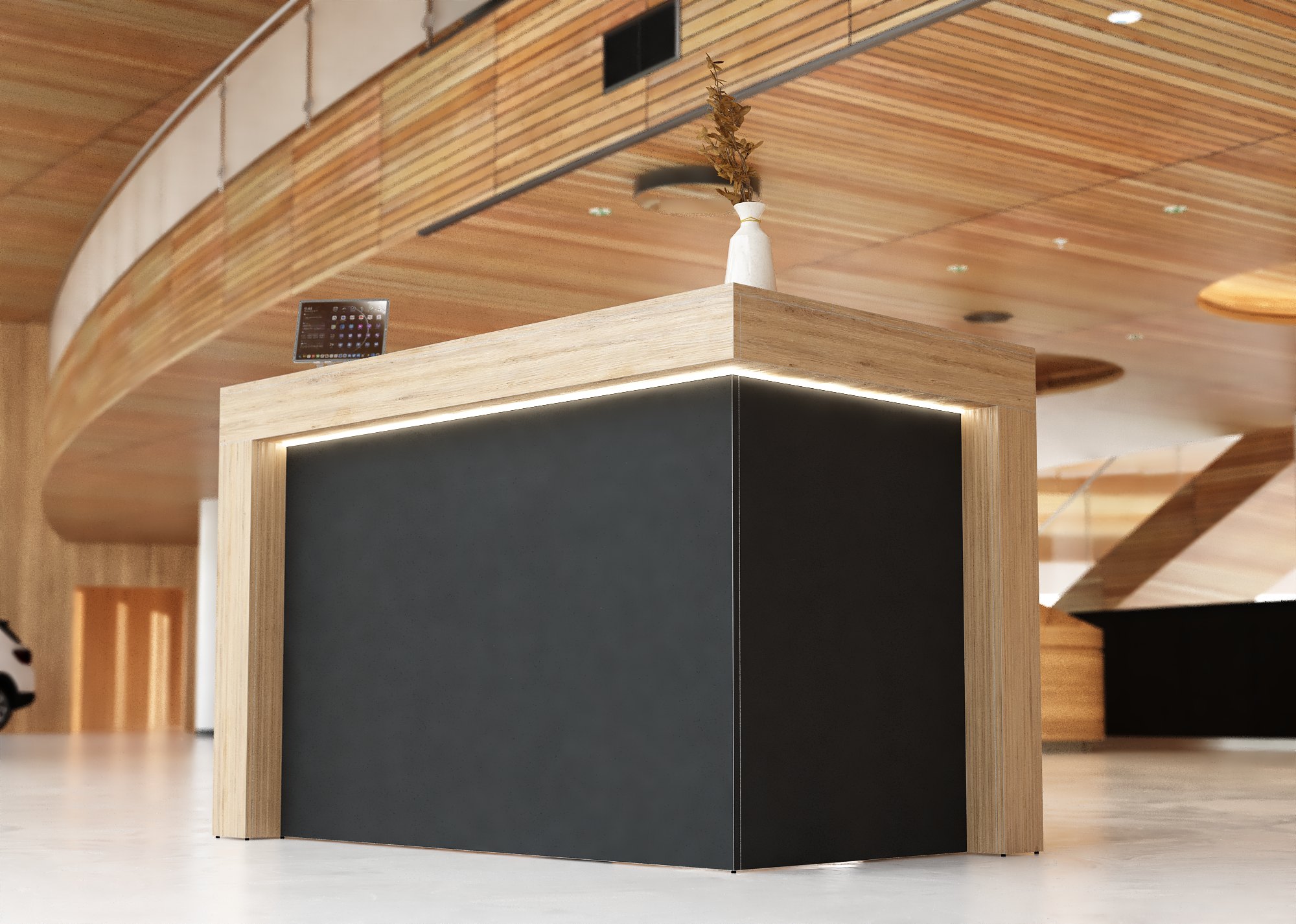 - Modułowe lady: Umożliwiają dopasowanie układu do przestrzeni, co sprawdza się w biurach o nieregularnym kształcie.