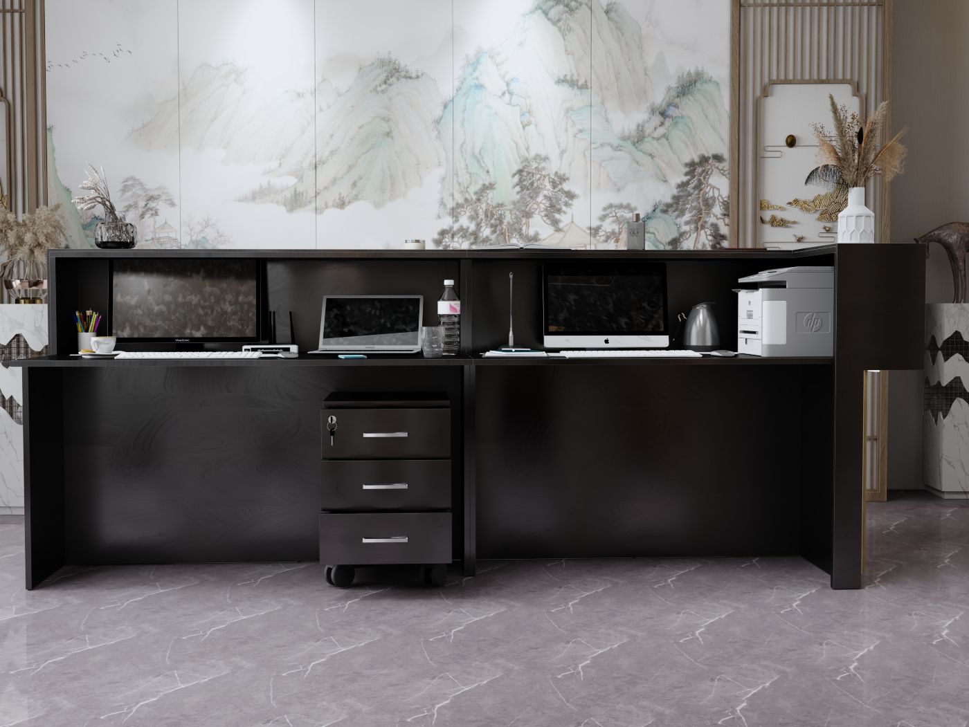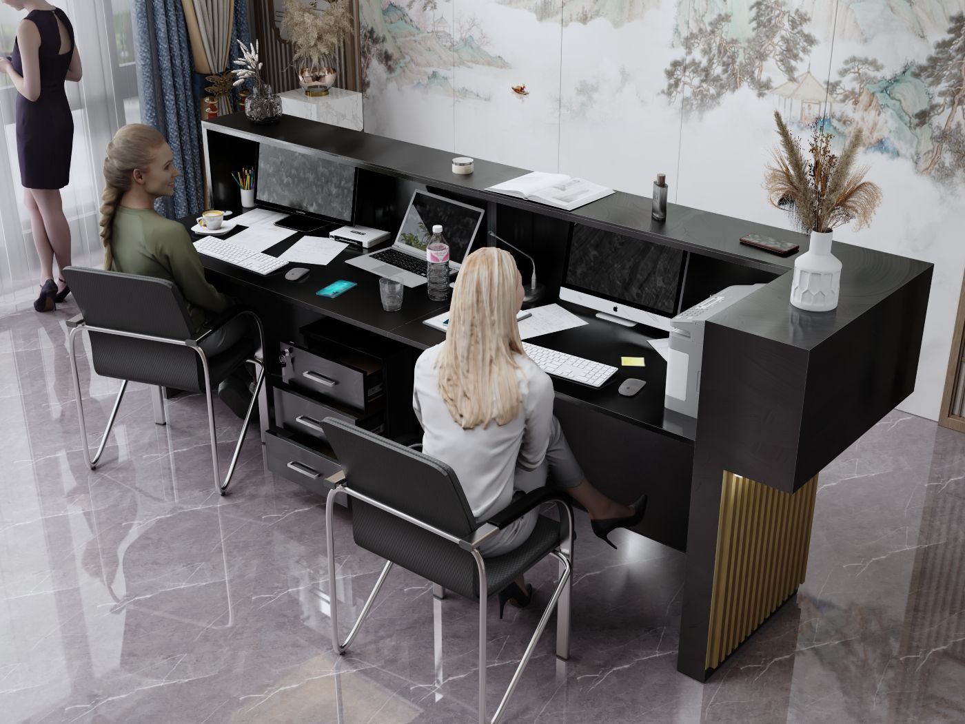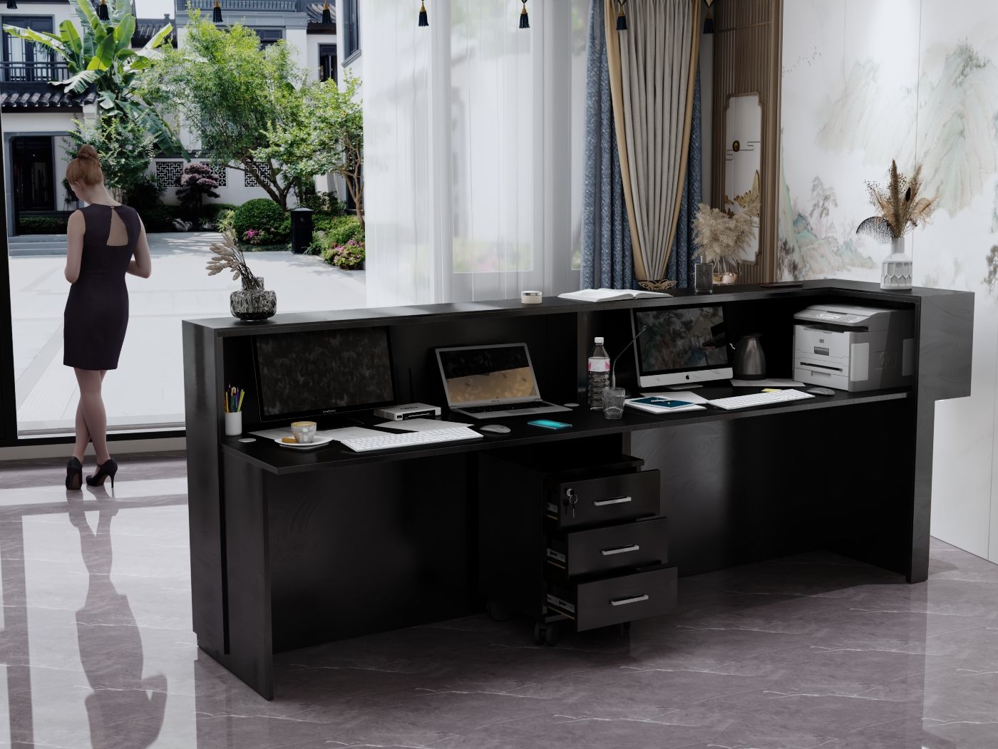 - Praktyczność: Ergonomiczna konstrukcja ułatwia pracę recepcjonisty, umożliwiając wygodną obsługę klientów, przechowywanie dokumentów i obsługę sprzętu biurowego.