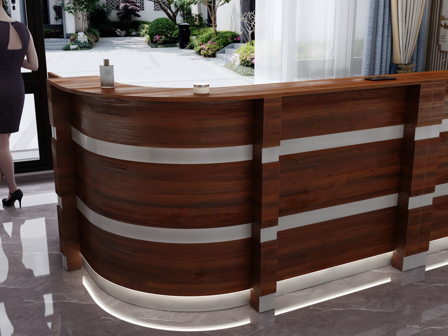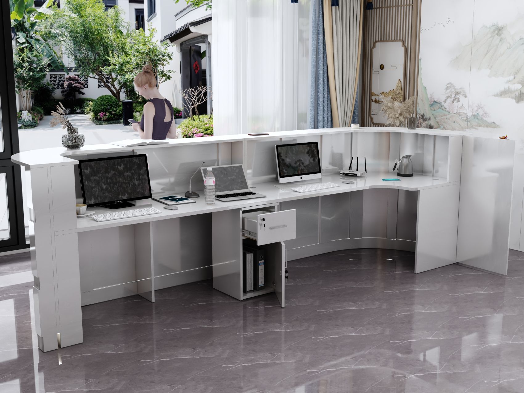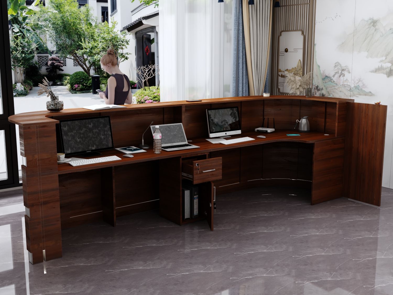 - Praktyczność: Ergonomiczna konstrukcja ułatwia pracę recepcjonisty, umożliwiając wygodną obsługę klientów, przechowywanie dokumentów i obsługę sprzętu biurowego.