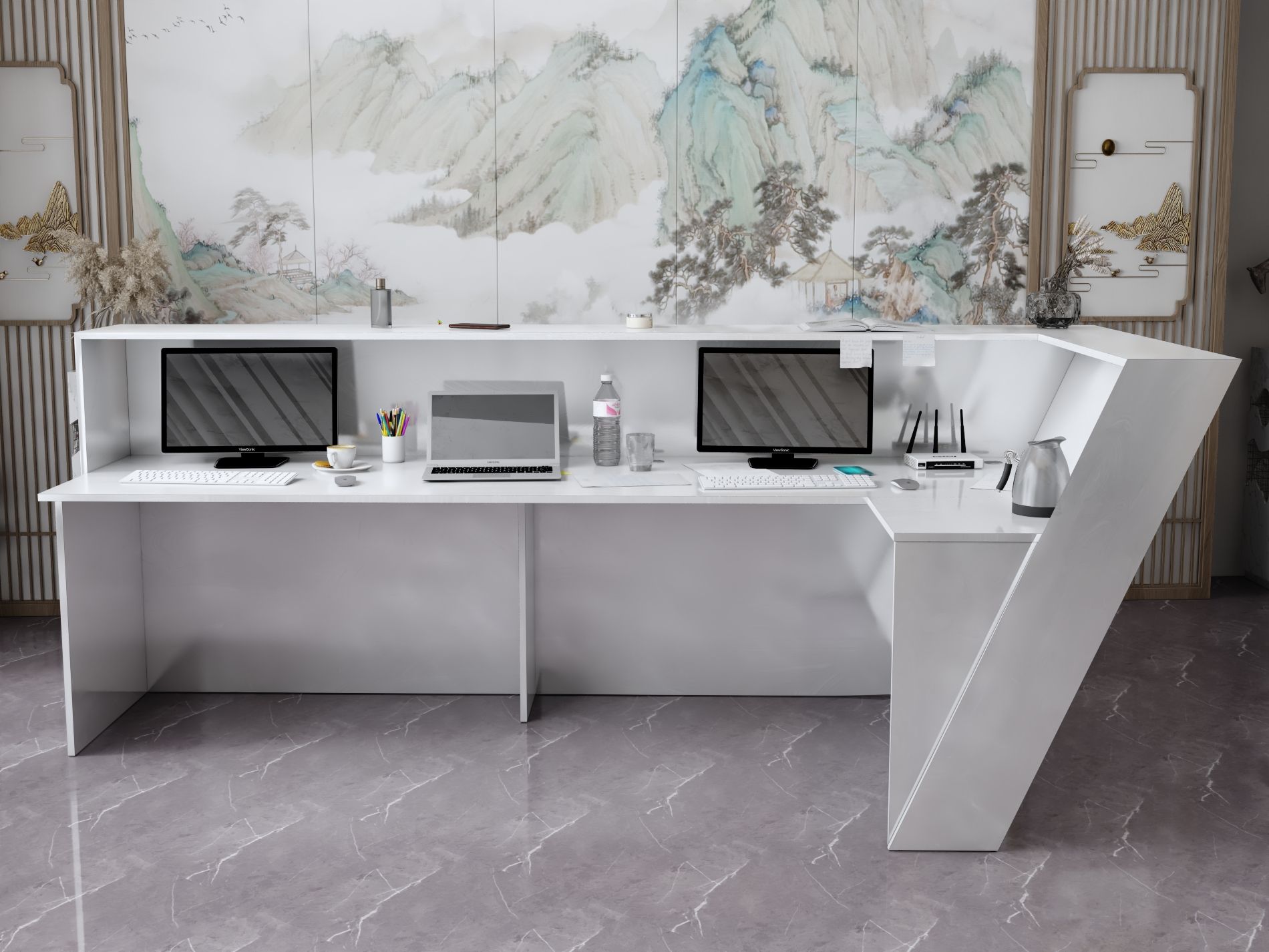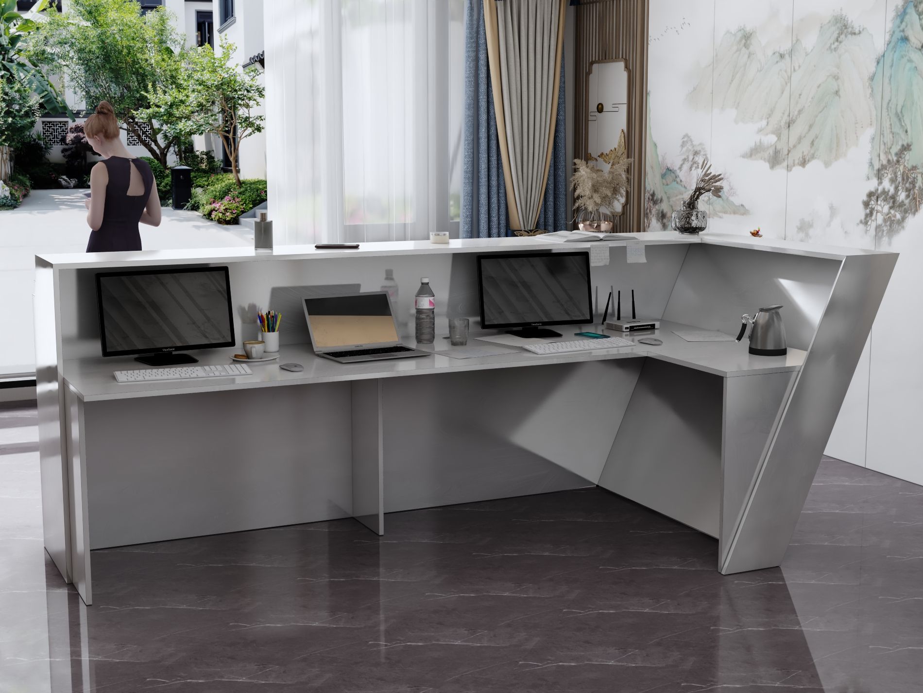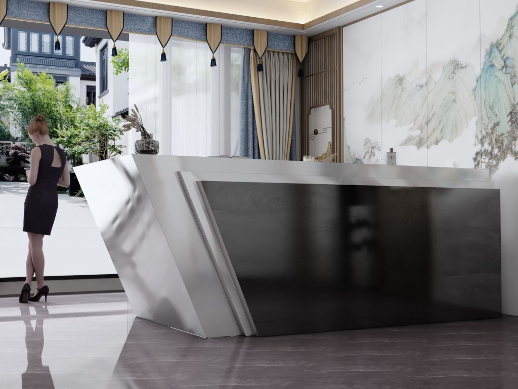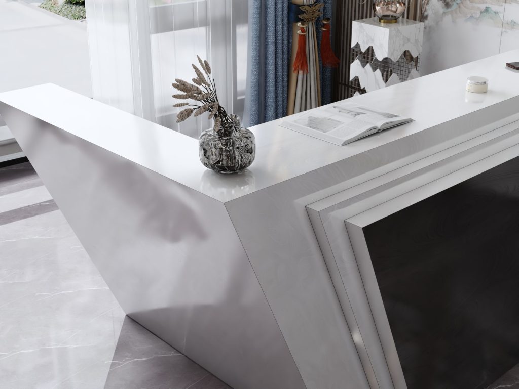 - Praktyczność: Ergonomiczna konstrukcja ułatwia pracę recepcjonisty, umożliwiając wygodną obsługę klientów, przechowywanie dokumentów i obsługę sprzętu biurowego.