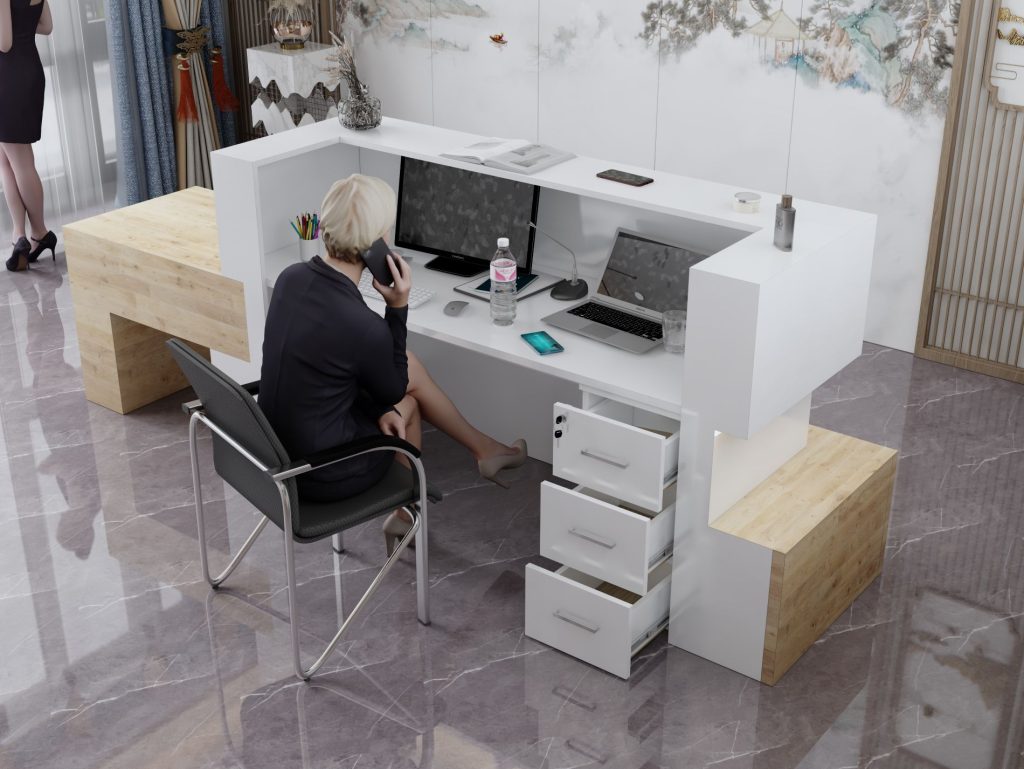 - Praktyczność: Ergonomiczna konstrukcja ułatwia pracę recepcjonisty, umożliwiając wygodną obsługę klientów, przechowywanie dokumentów i obsługę sprzętu biurowego.