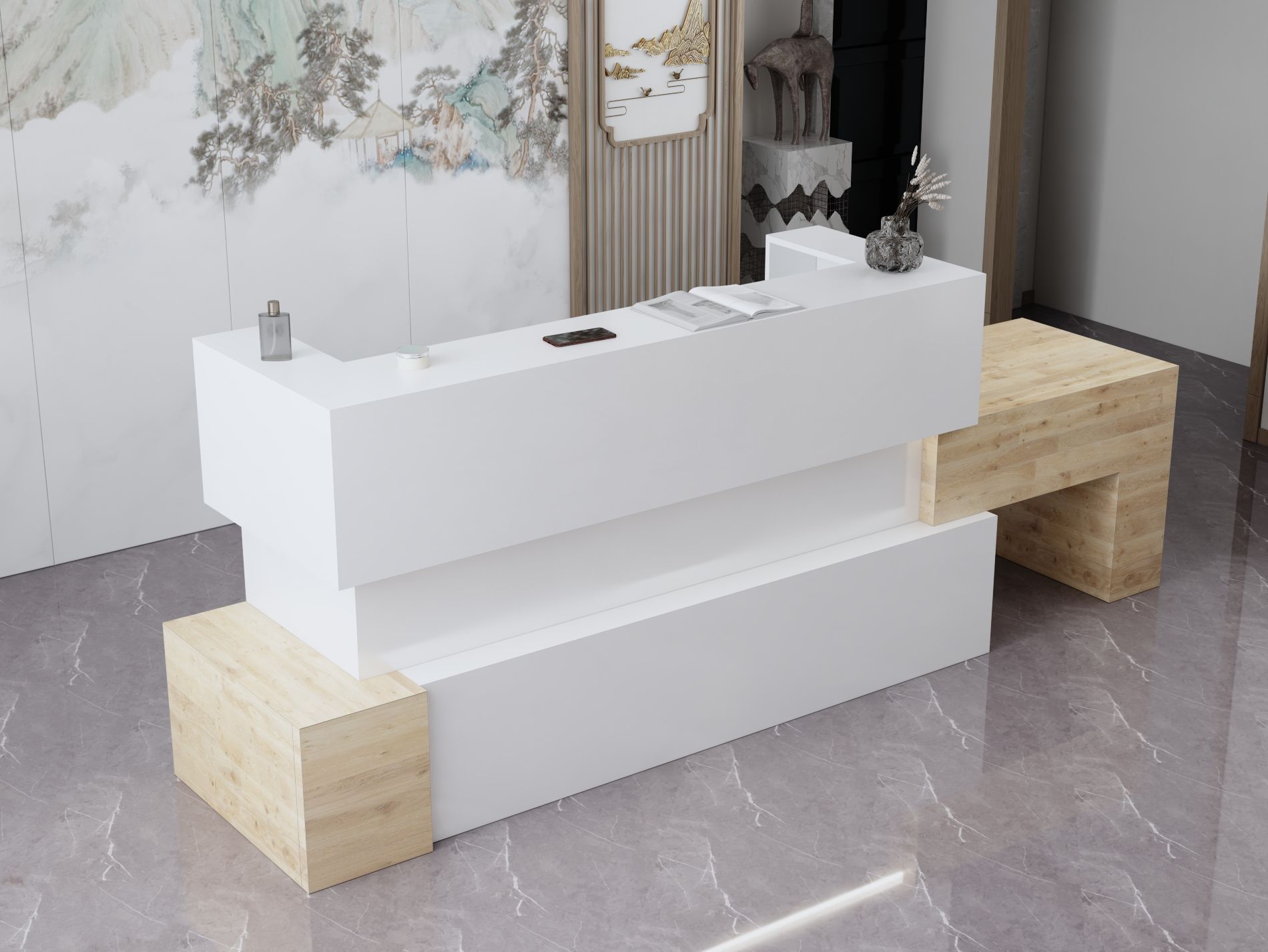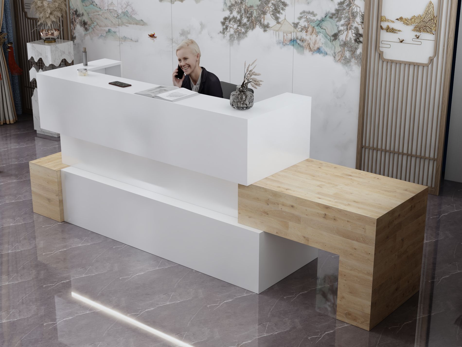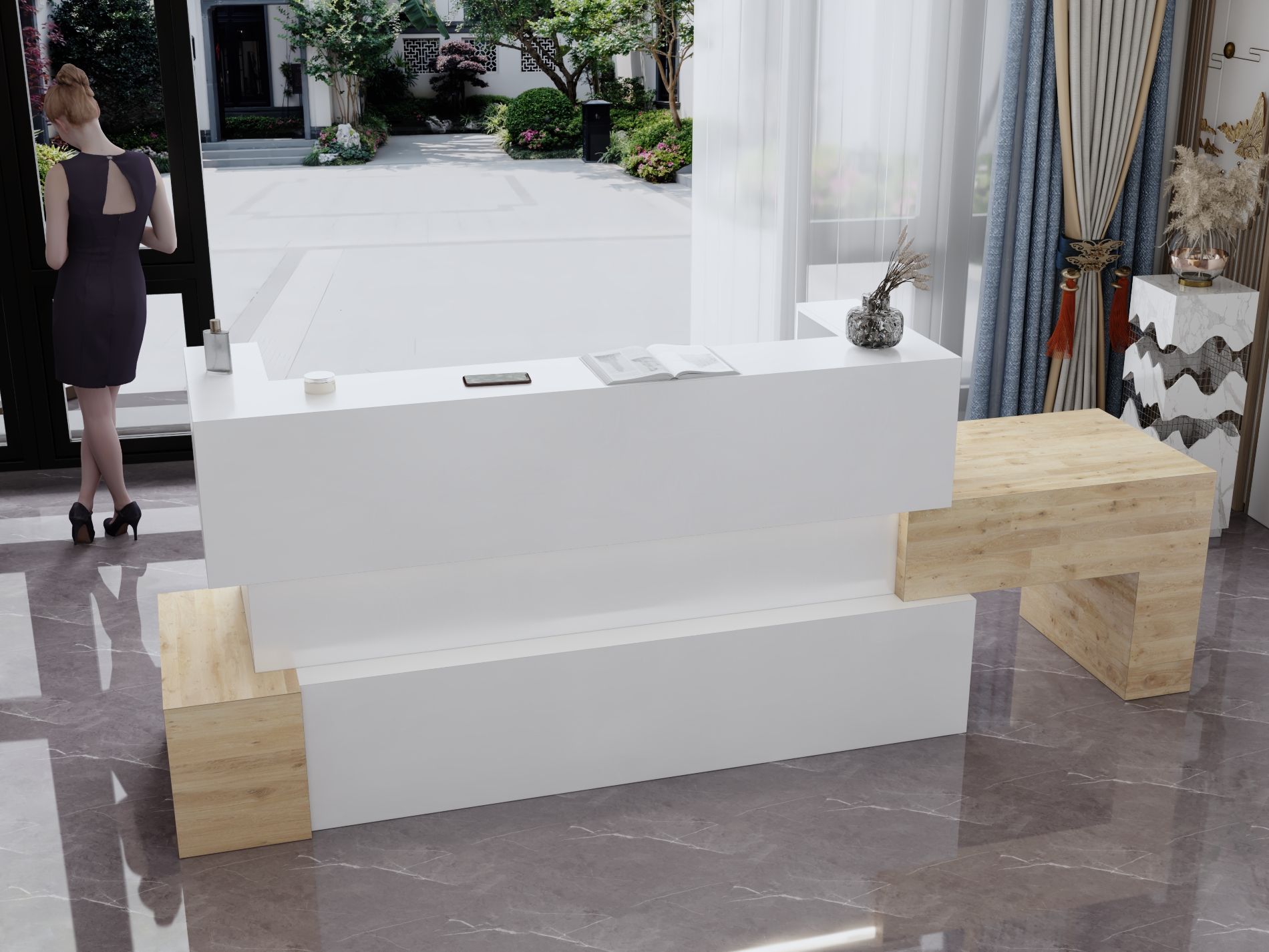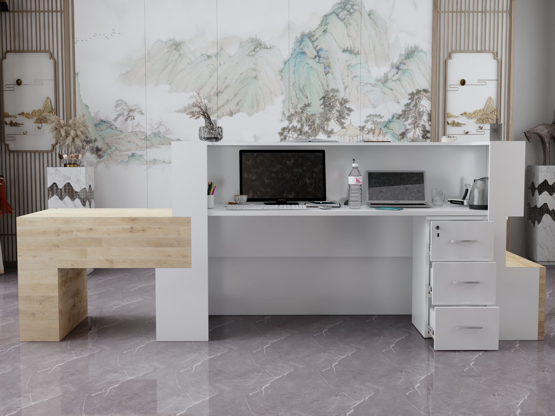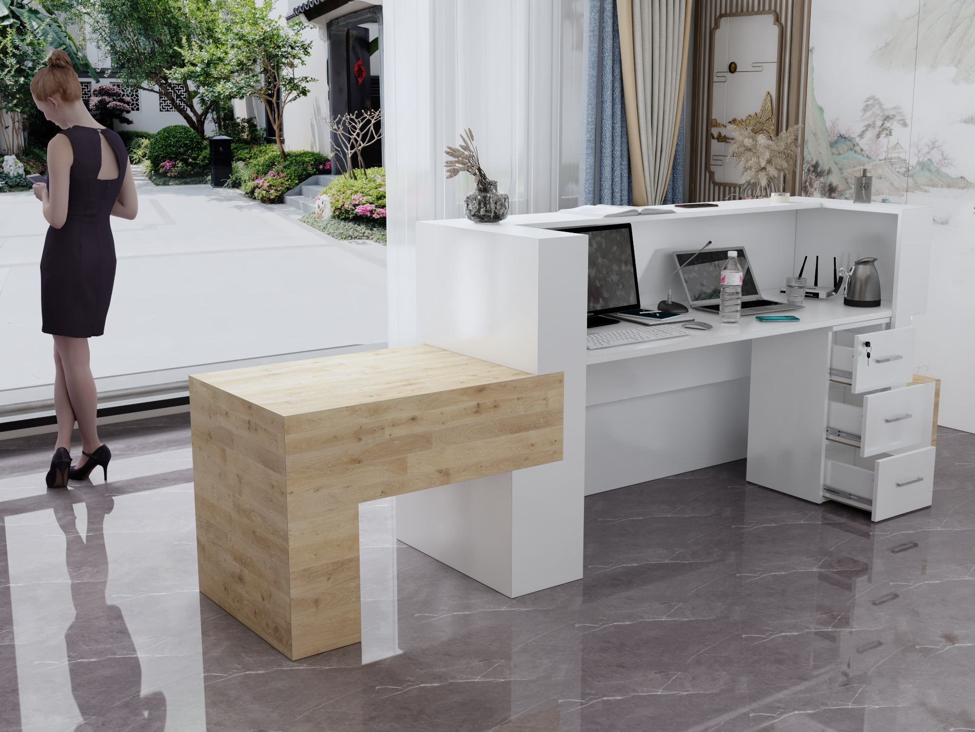 - Praktyczność: Ergonomiczna konstrukcja ułatwia pracę recepcjonisty, umożliwiając wygodną obsługę klientów, przechowywanie dokumentów i obsługę sprzętu biurowego.