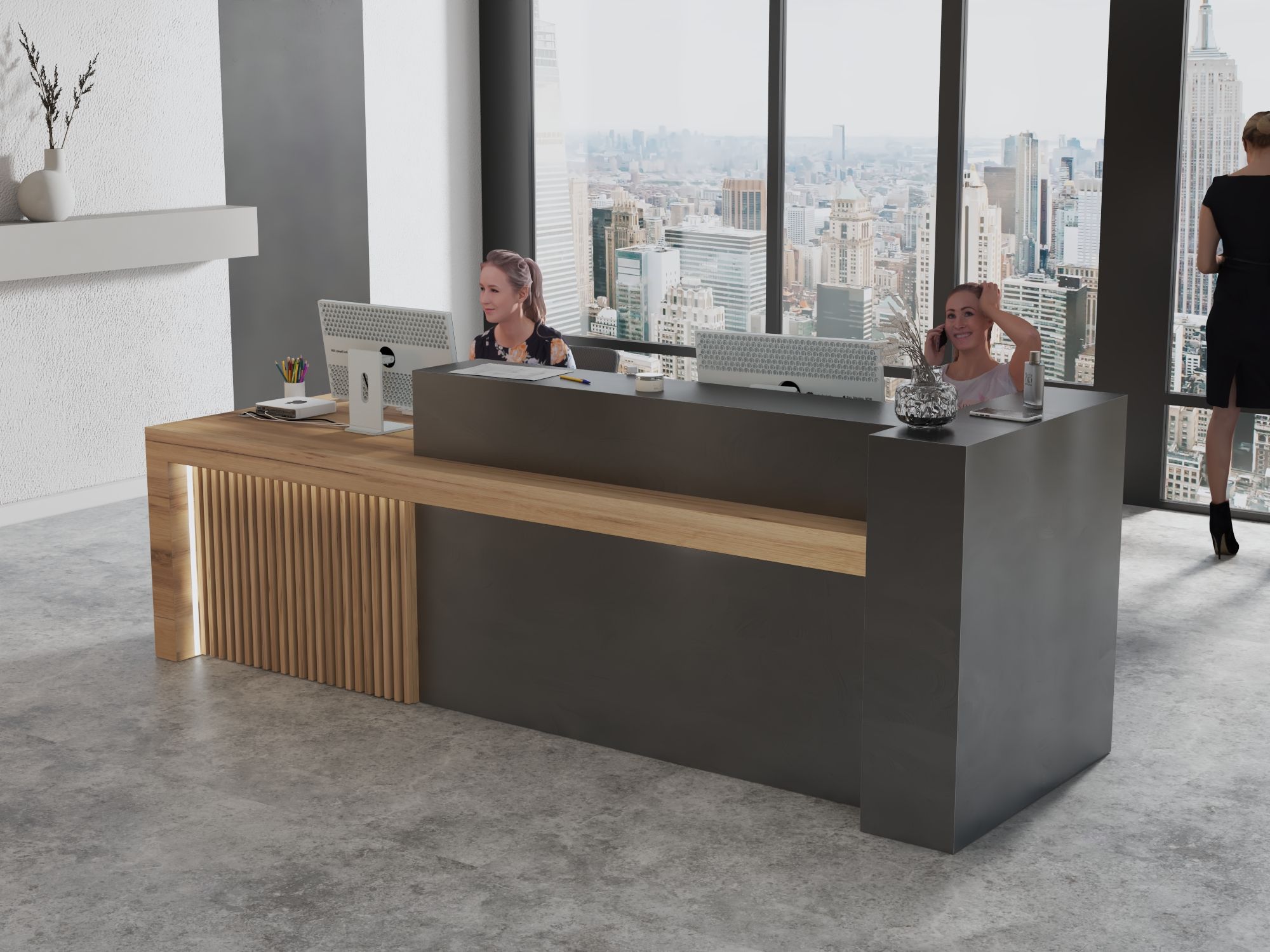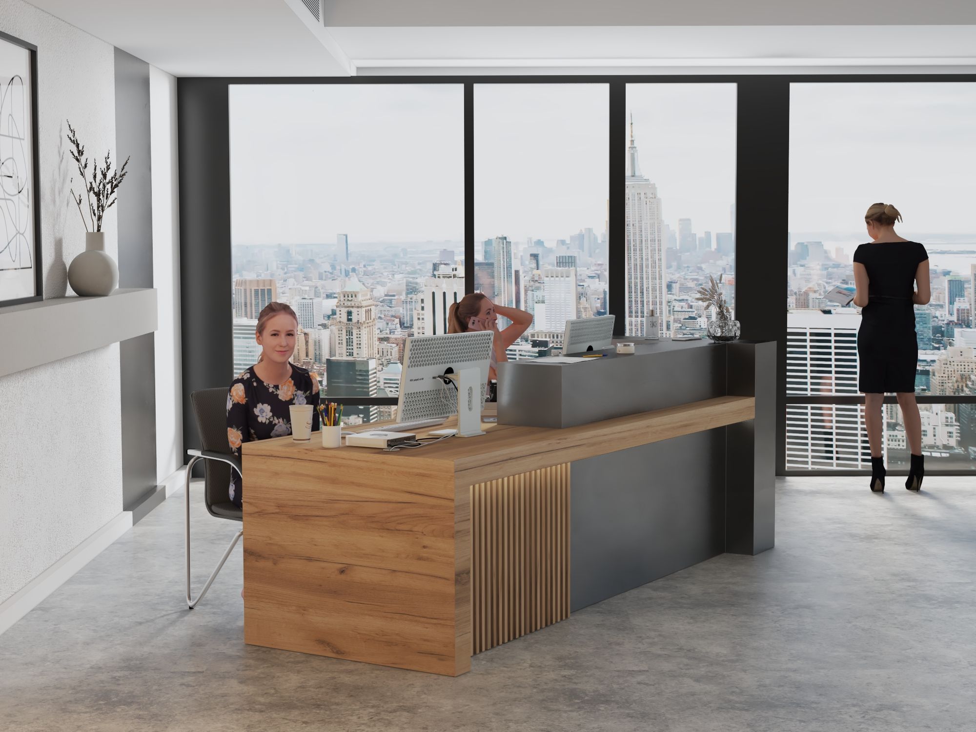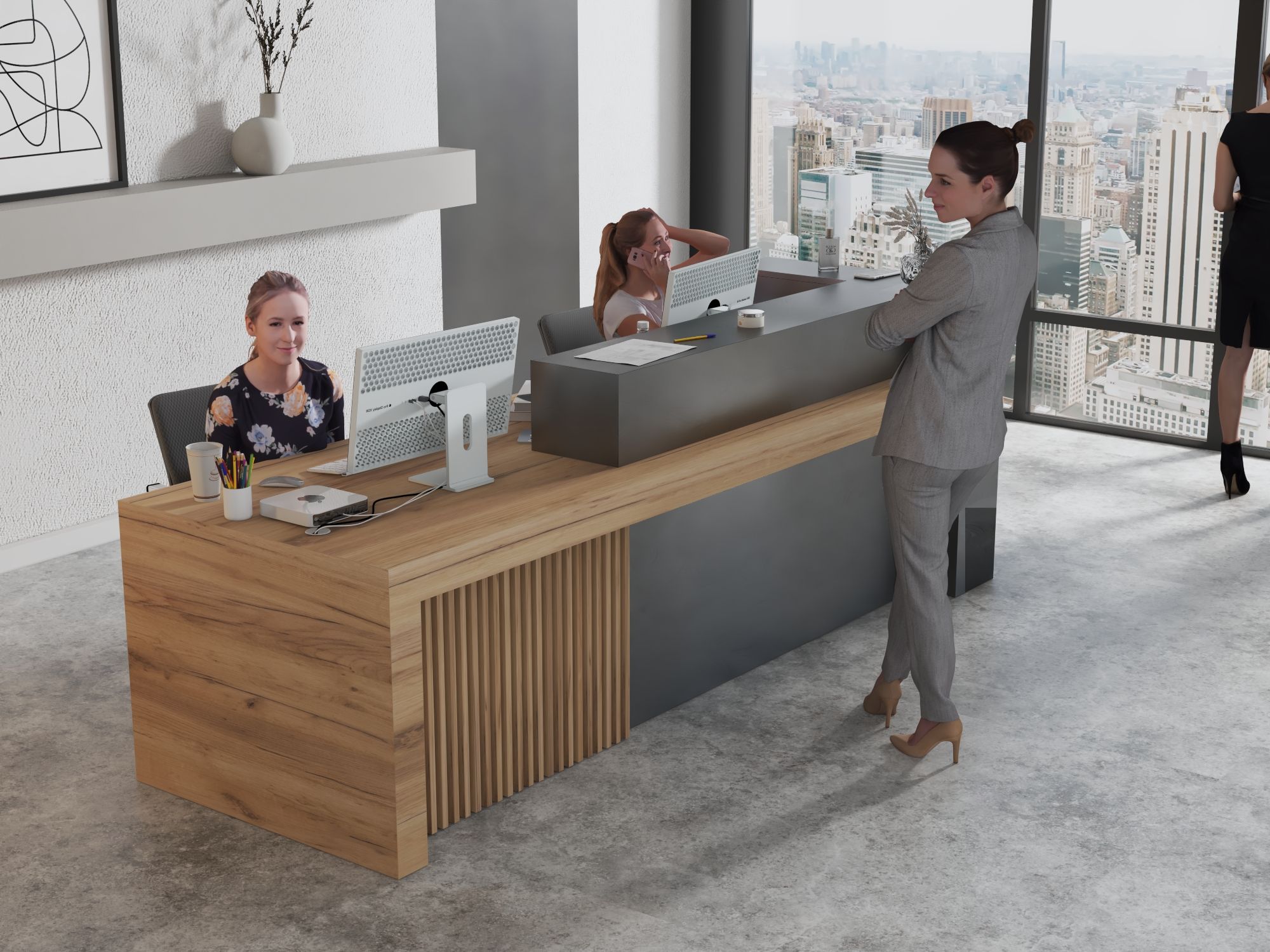 - Praktyczność: Ergonomiczna konstrukcja ułatwia pracę recepcjonisty, umożliwiając wygodną obsługę klientów, przechowywanie dokumentów i obsługę sprzętu biurowego.