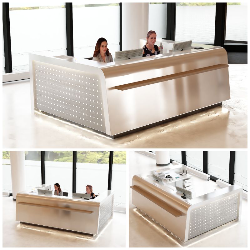 - Praktyczność: Ergonomiczna konstrukcja ułatwia pracę recepcjonisty, umożliwiając wygodną obsługę klientów, przechowywanie dokumentów i obsługę sprzętu biurowego.
