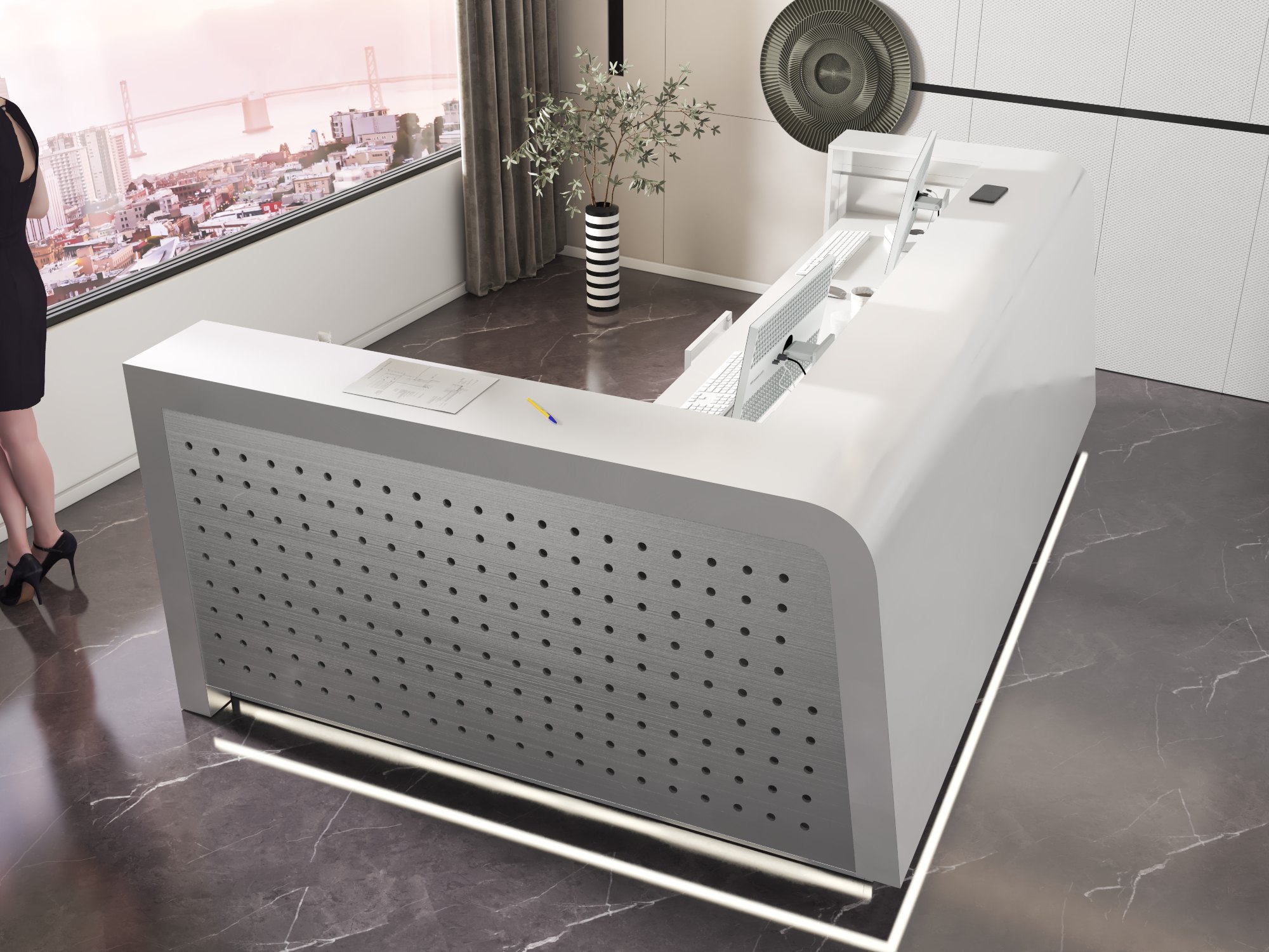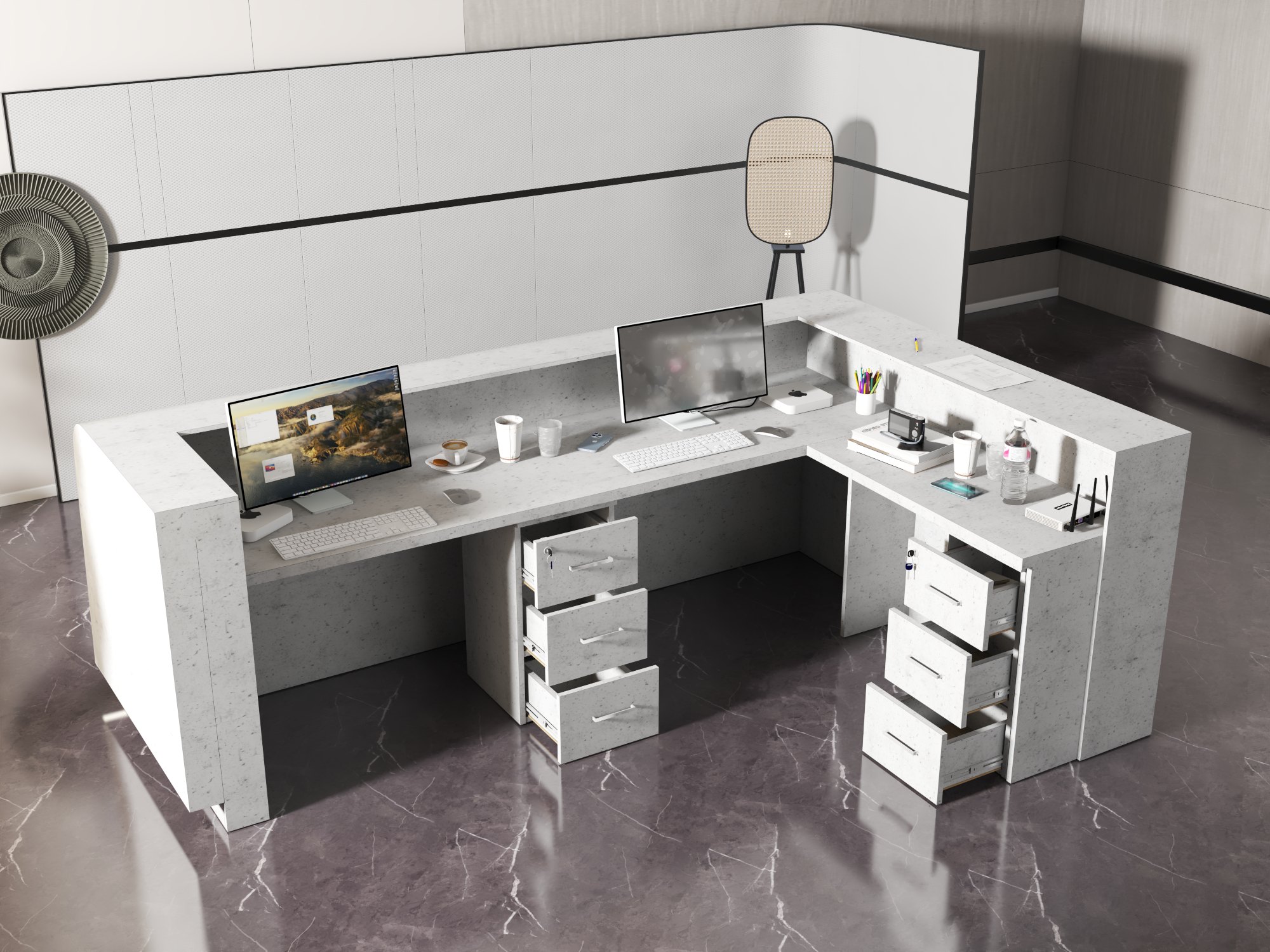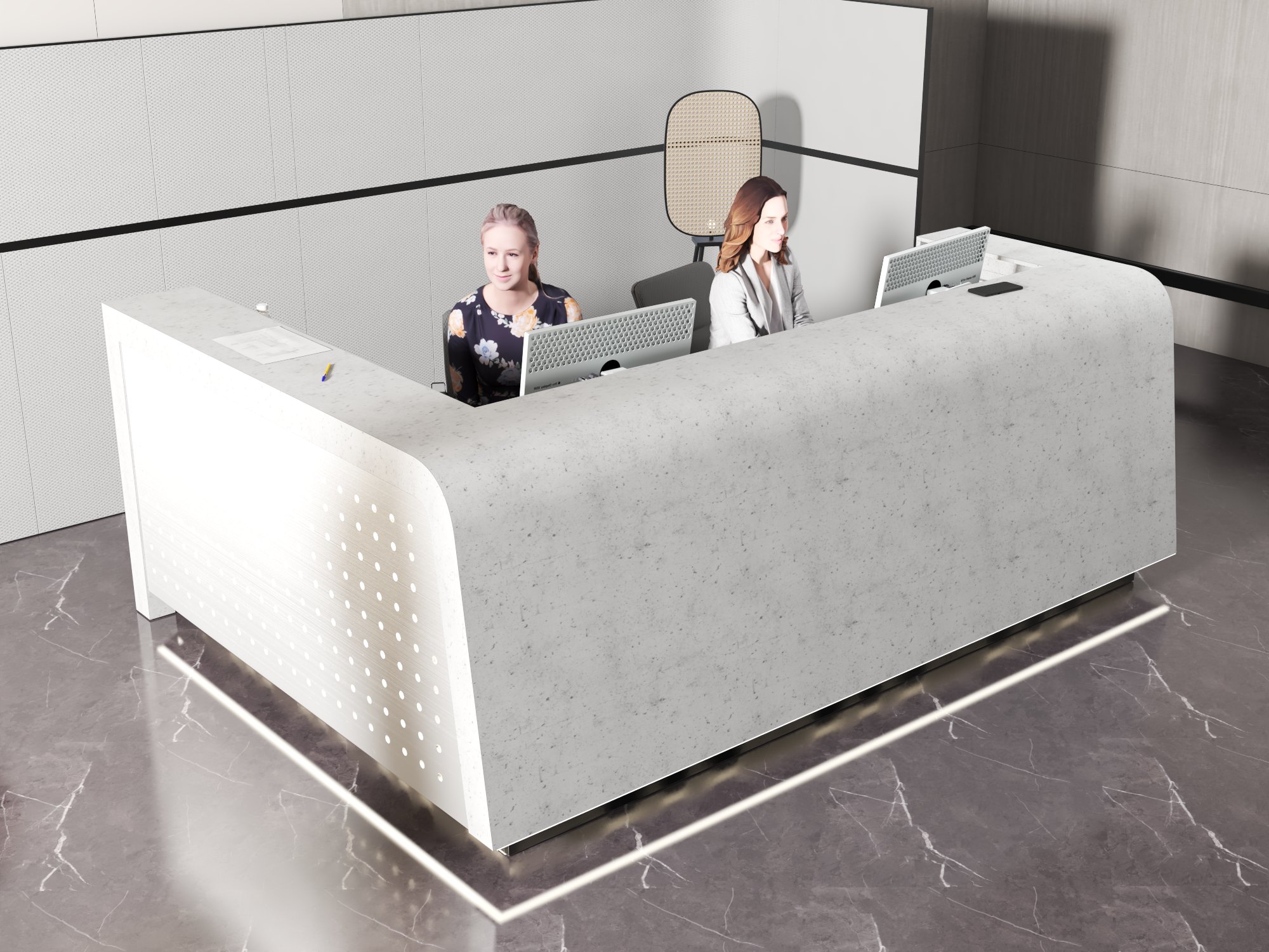 - Praktyczność: Ergonomiczna konstrukcja ułatwia pracę recepcjonisty, umożliwiając wygodną obsługę klientów, przechowywanie dokumentów i obsługę sprzętu biurowego.