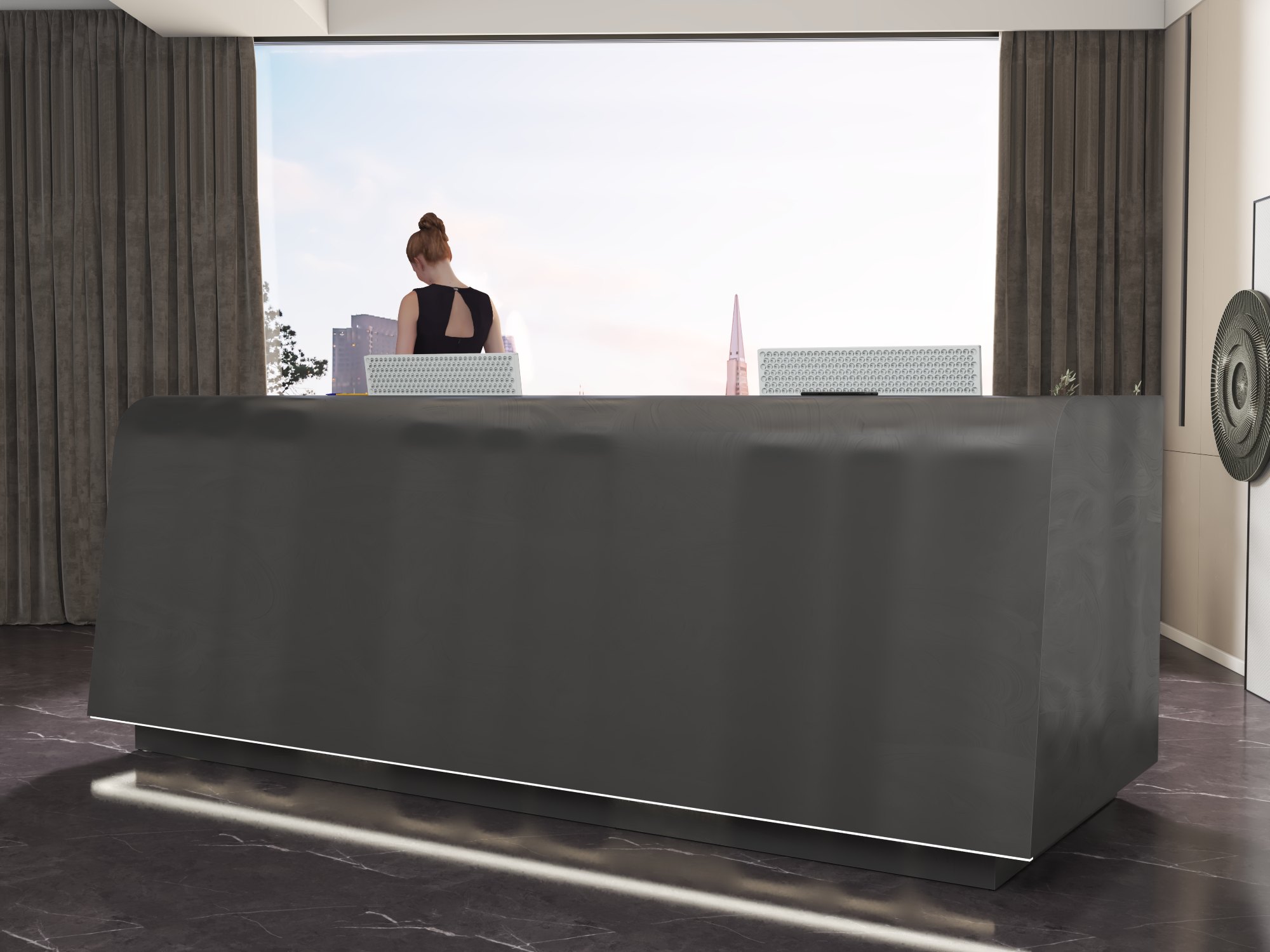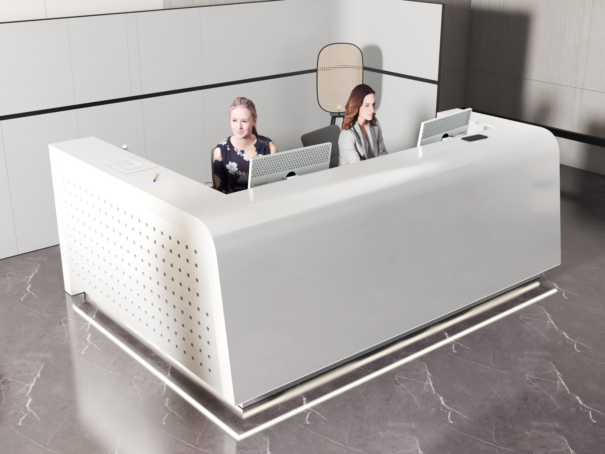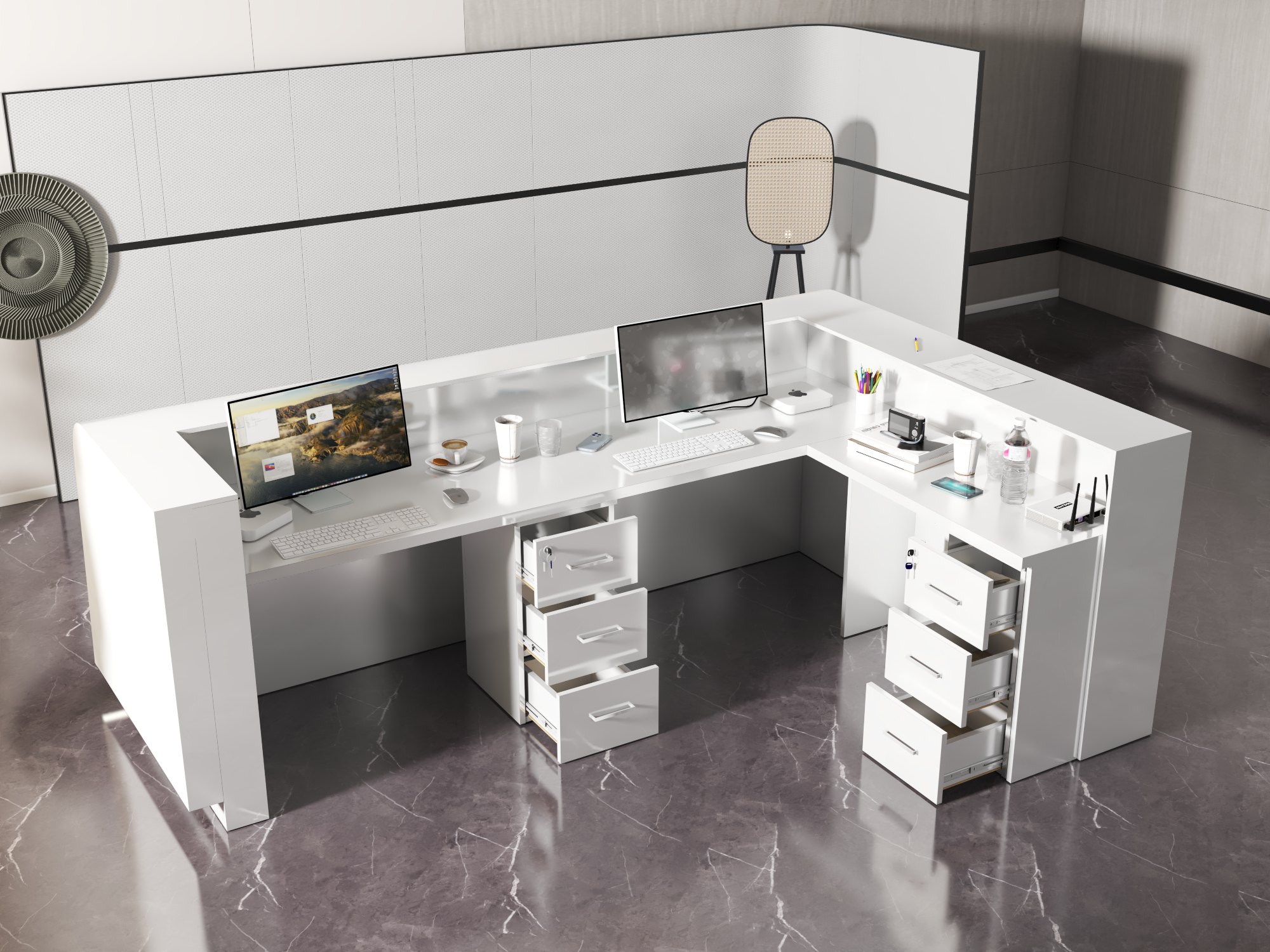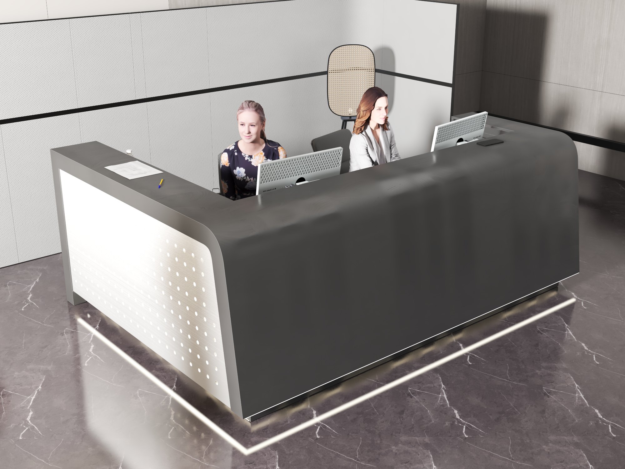 - Praktyczność: Ergonomiczna konstrukcja ułatwia pracę recepcjonisty, umożliwiając wygodną obsługę klientów, przechowywanie dokumentów i obsługę sprzętu biurowego.