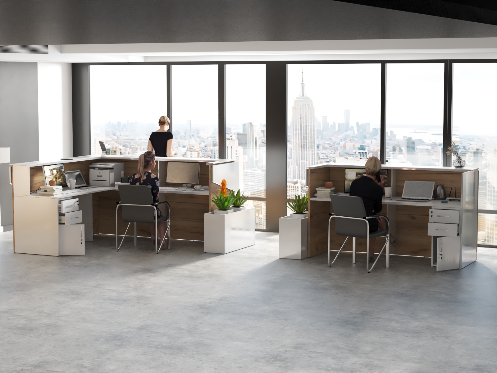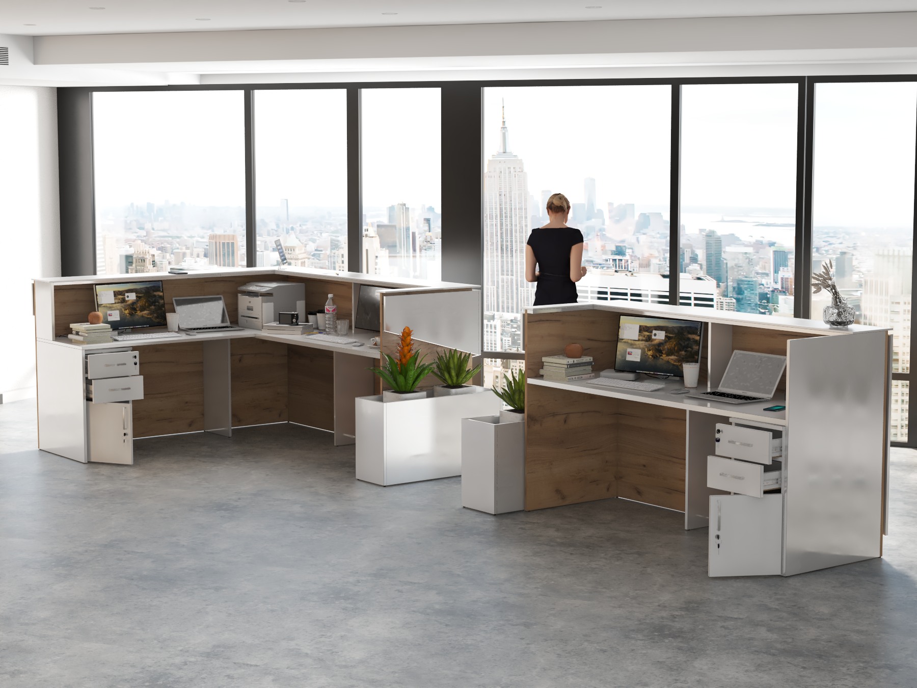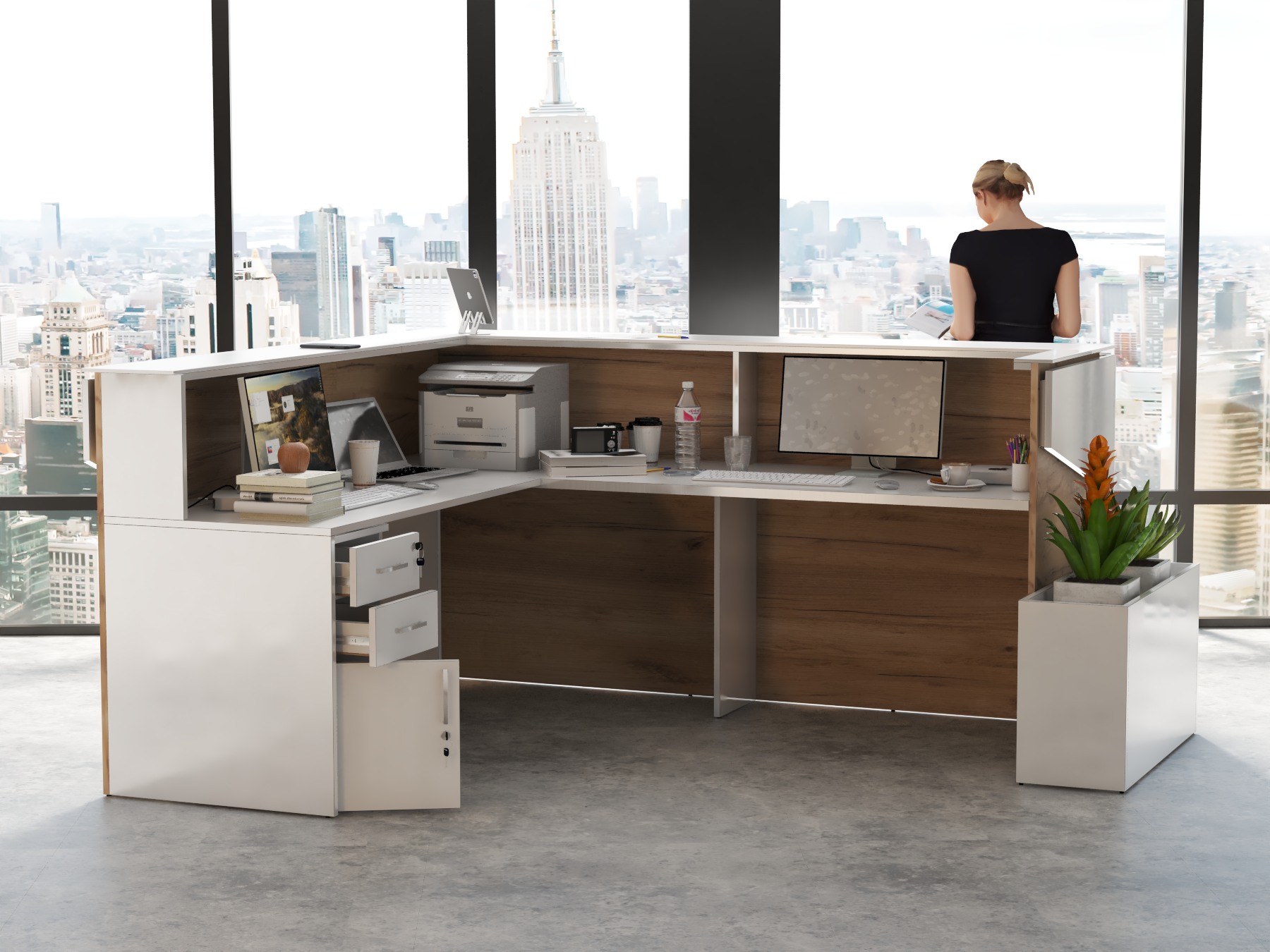 2. Praktyczność: Ergonomiczna konstrukcja ułatwia pracę recepcjonisty, umożliwiając wygodną obsługę klientów, przechowywanie dokumentów i obsługę sprzętu biurowego.
