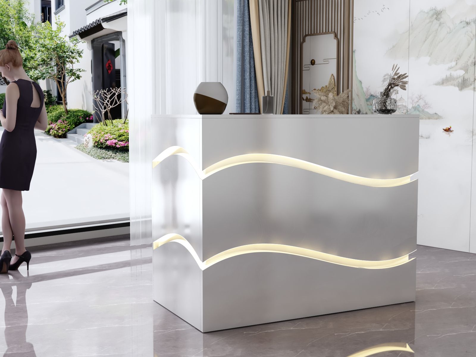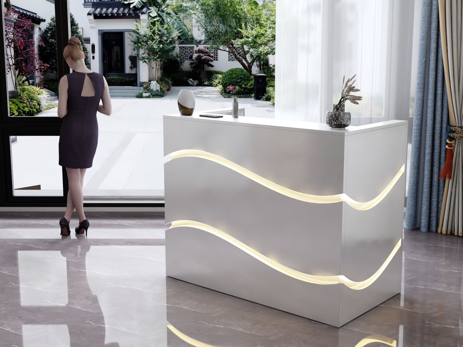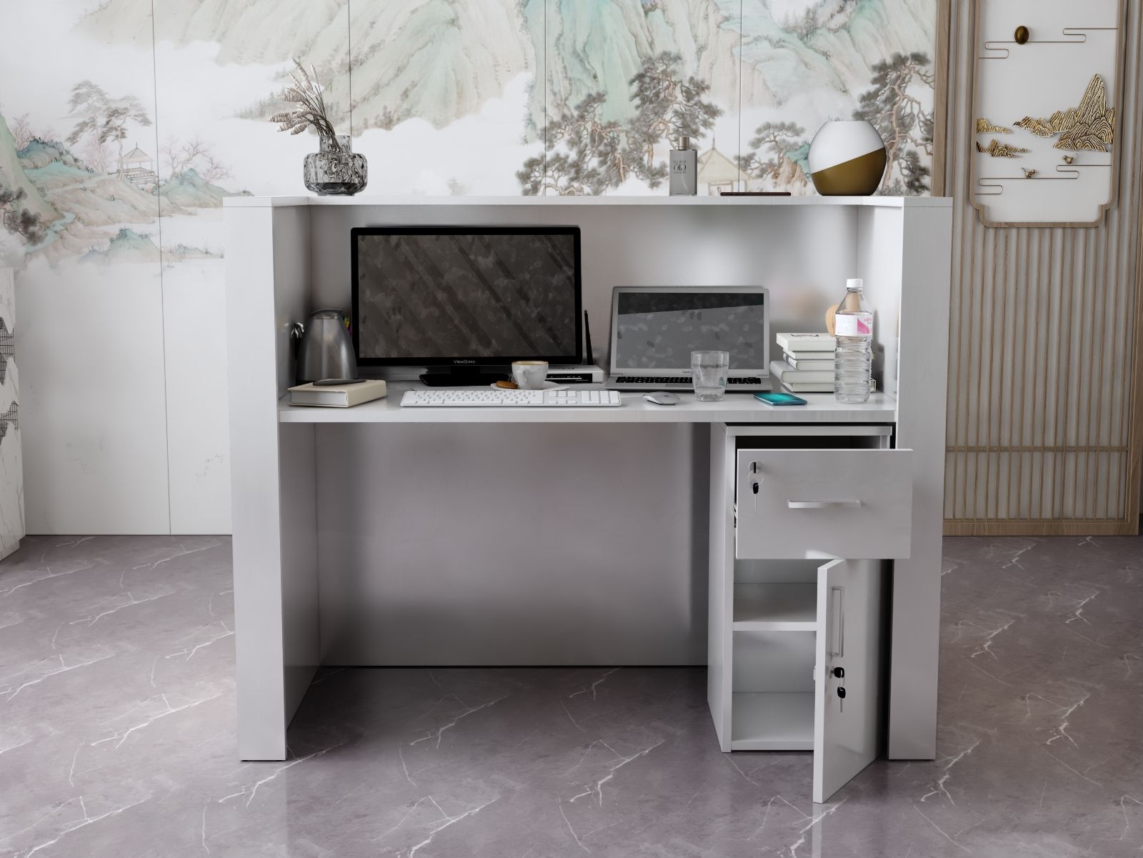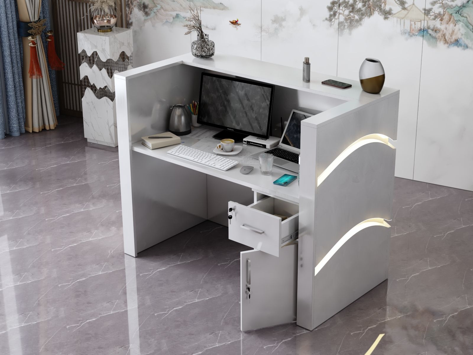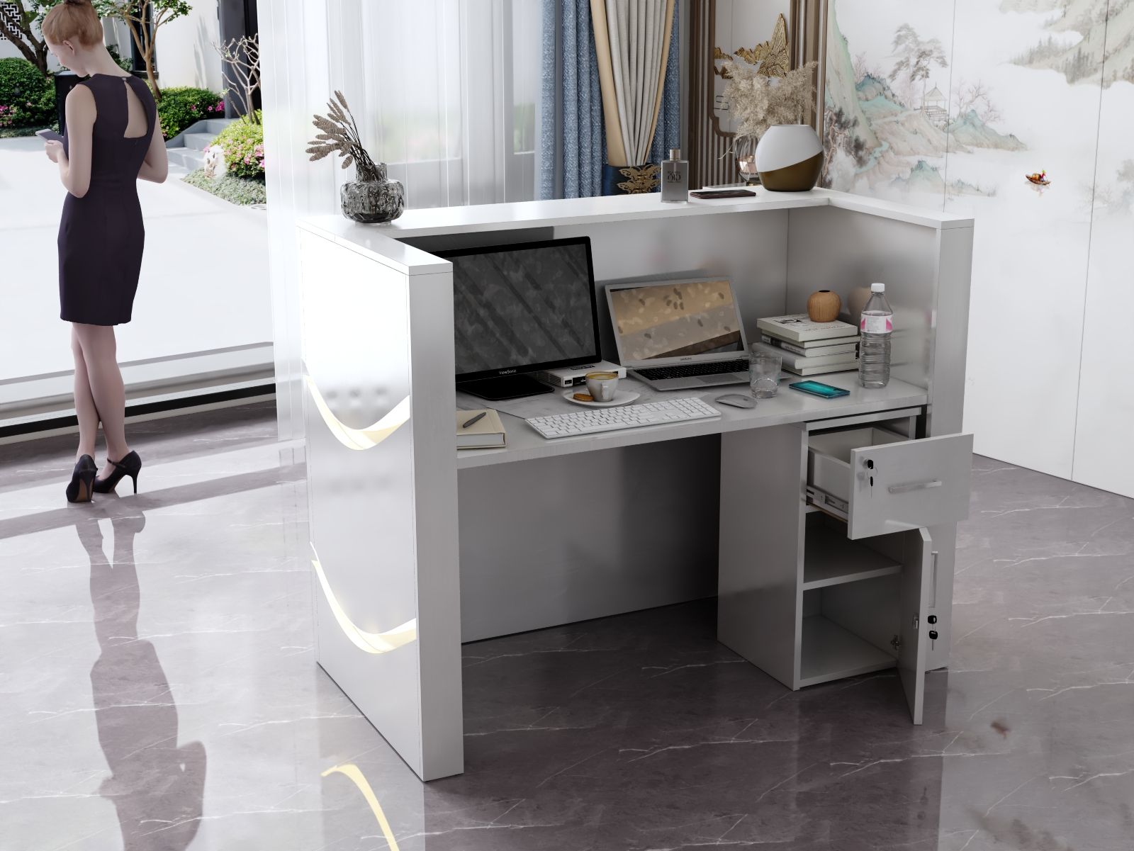 - Praktyczność: Ergonomiczna konstrukcja ułatwia pracę recepcjonisty, umożliwiając wygodną obsługę klientów, przechowywanie dokumentów i obsługę sprzętu biurowego.
