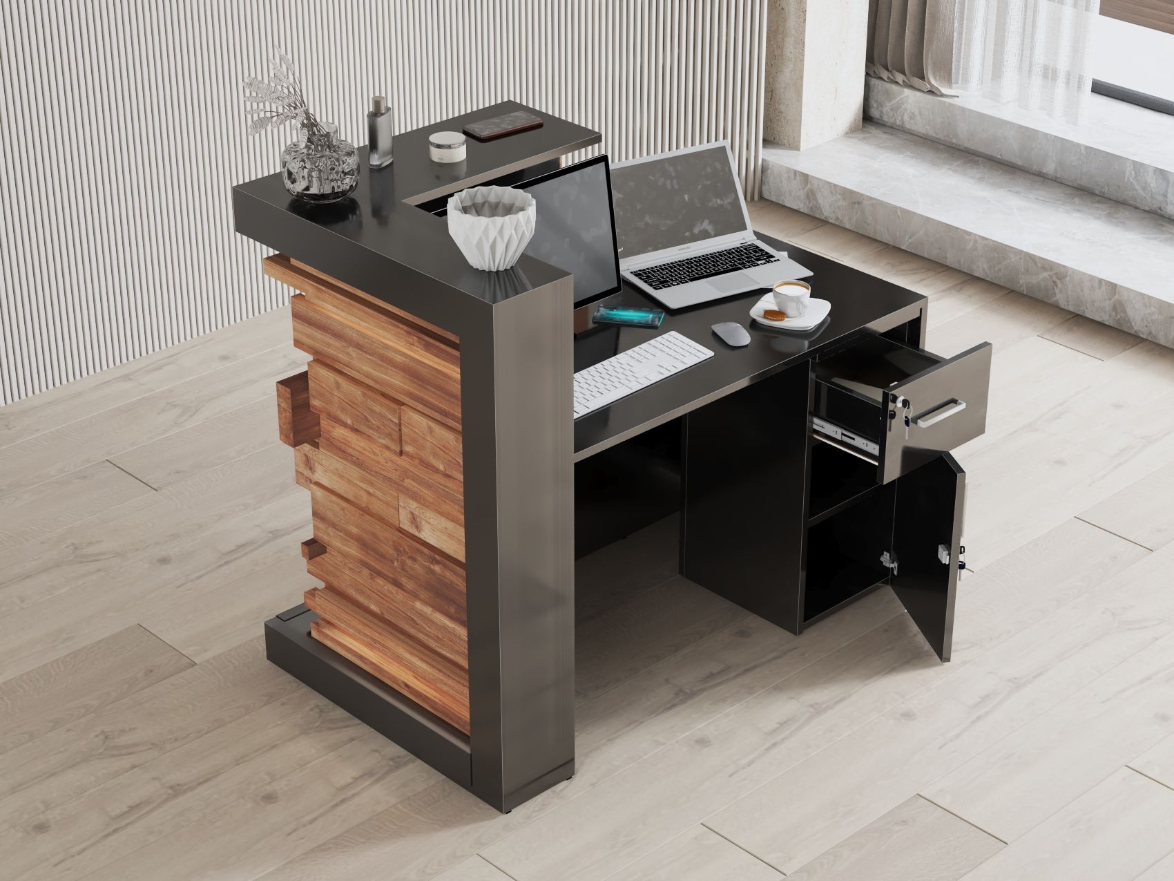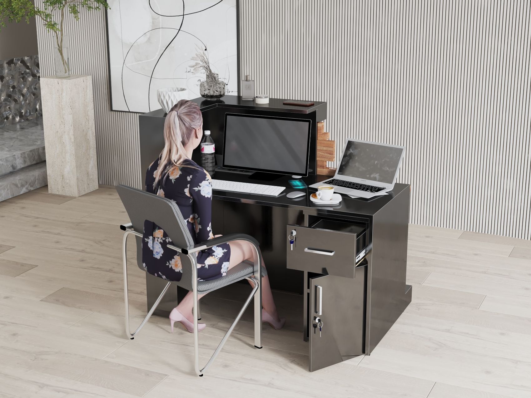 - Praktyczność: Ergonomiczna konstrukcja ułatwia pracę recepcjonisty, umożliwiając wygodną obsługę klientów, przechowywanie dokumentów i obsługę sprzętu biurowego.