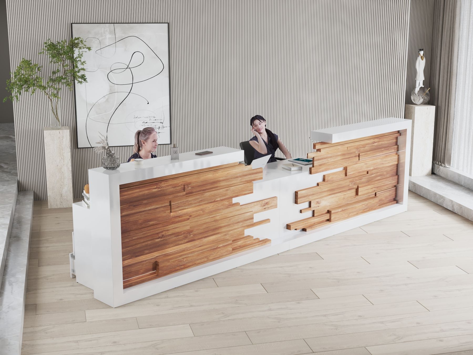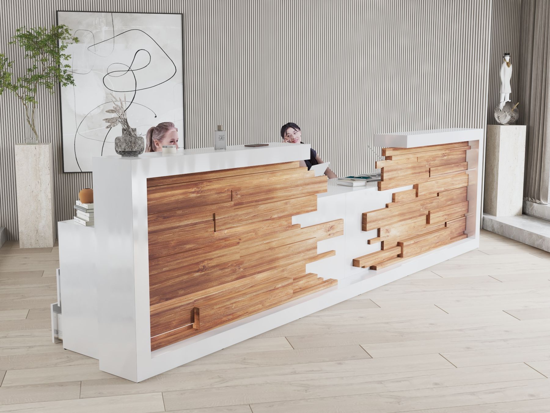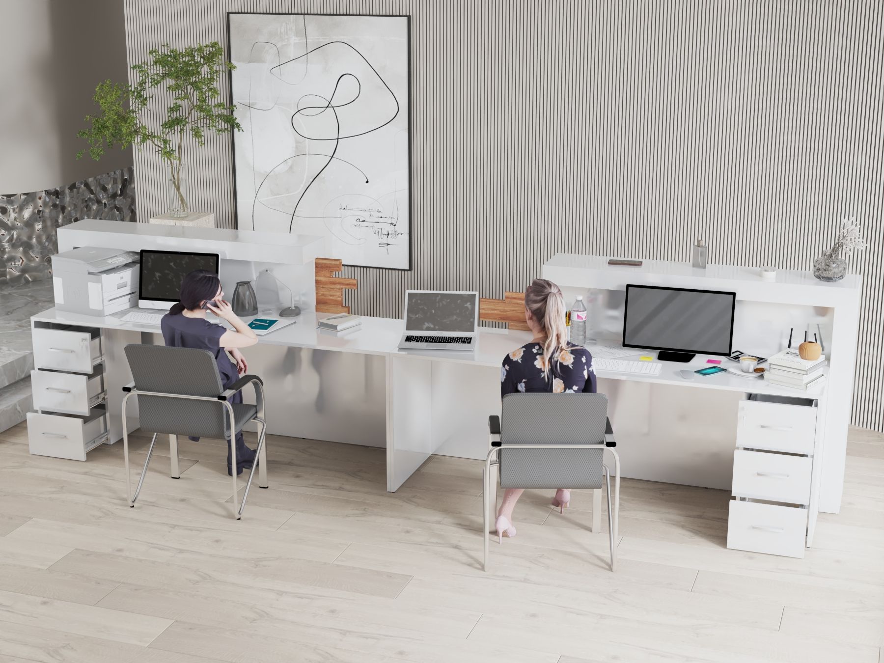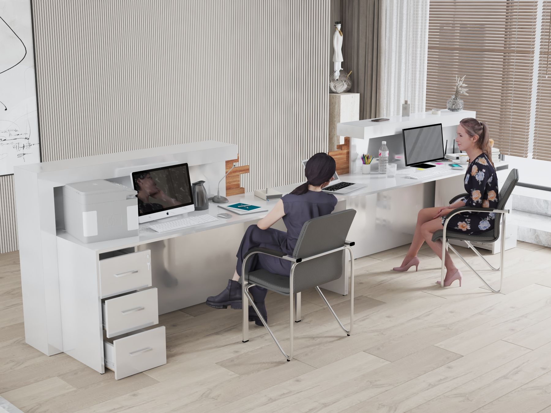 - Praktyczność: Ergonomiczna konstrukcja ułatwia pracę recepcjonisty, umożliwiając wygodną obsługę klientów, przechowywanie dokumentów i obsługę sprzętu biurowego.