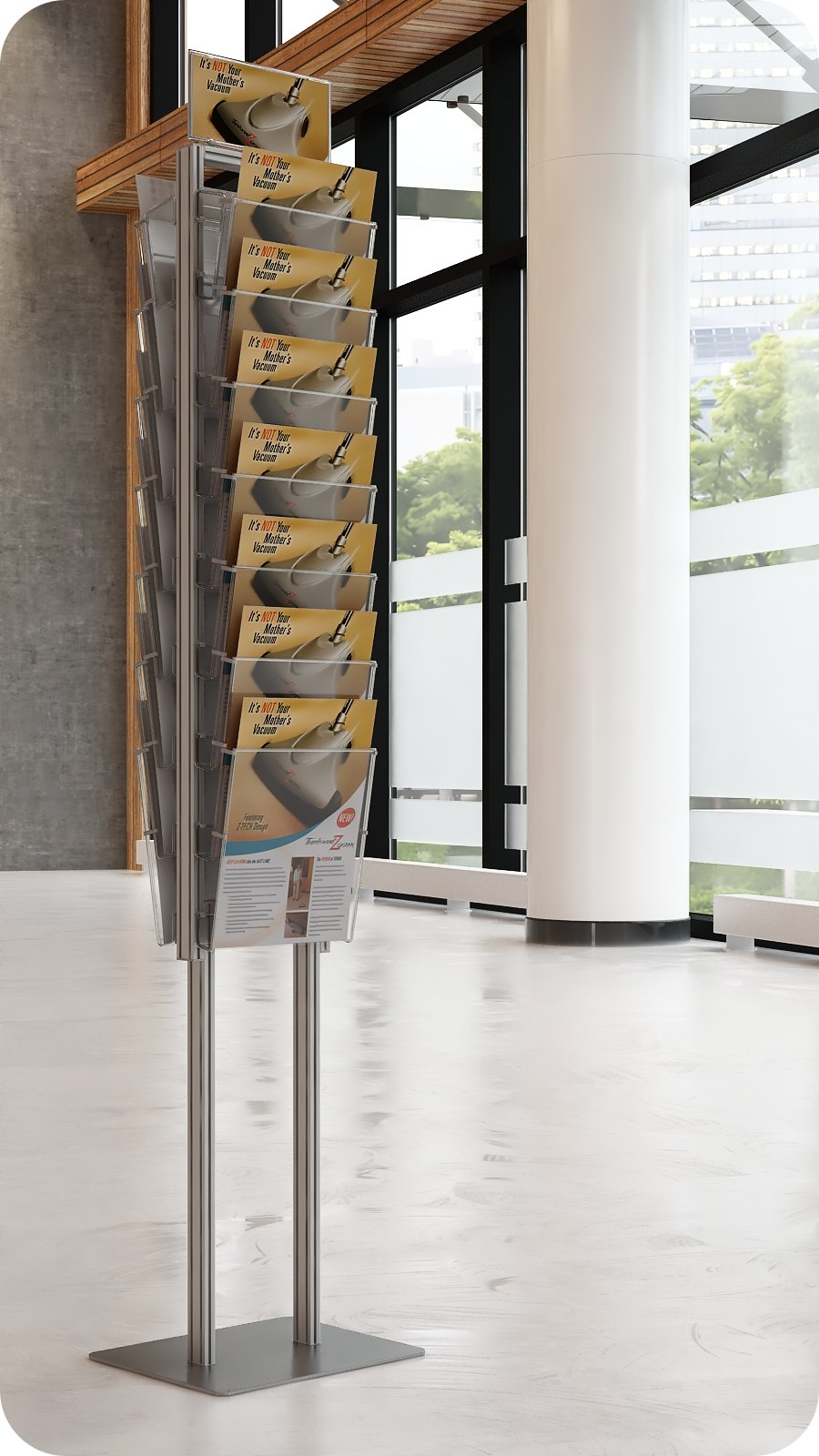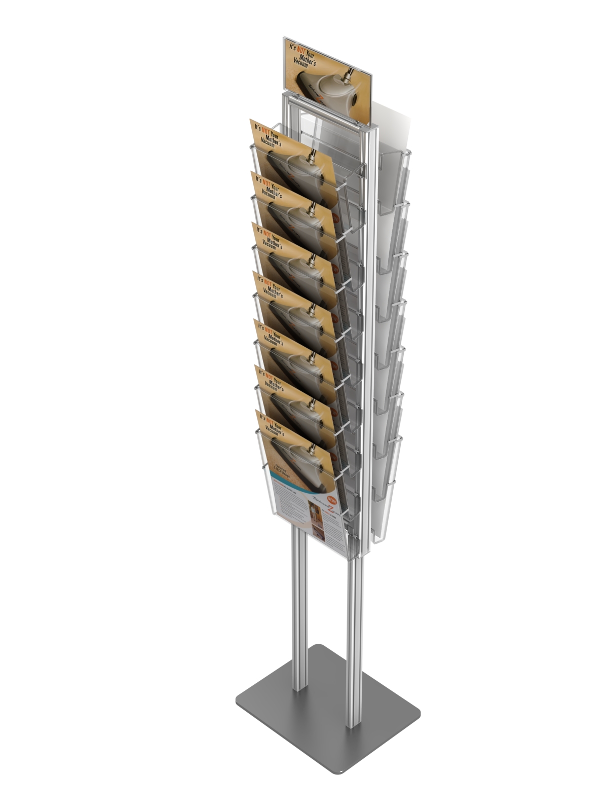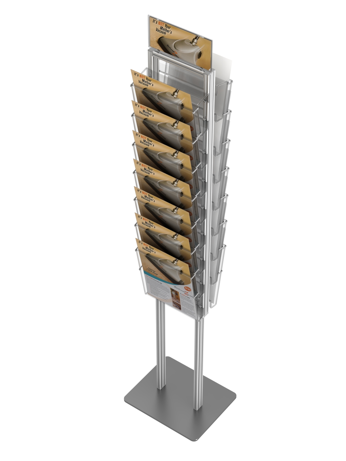 Składany stojak na ulotki z 14 kieszeniami A4 kaskadowo przymocowanymi za pomocą spinek do aluminiowego stelaża.