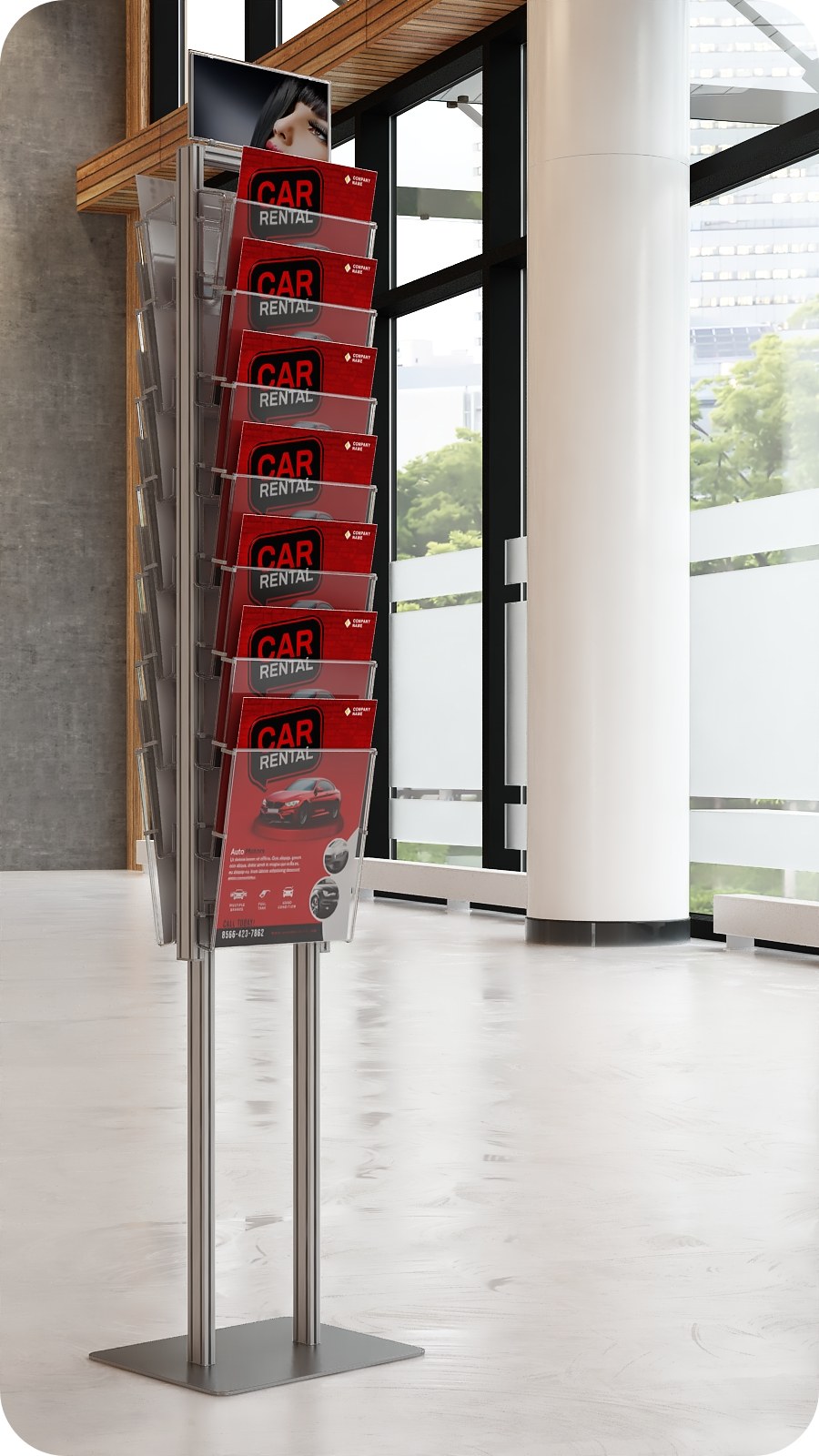 Stojak przeznaczony do biur, salonów samochodowych , banków , miejsc użyteczności publicznej jak urzędy , muzea , zoo , parki narodowe , szkoły , uczelnie ,kina, restauracje , hotele , domy kultury , galerie , sklepy , targi , salony wystawowe , ambasady, do sekretariatu , agencji .