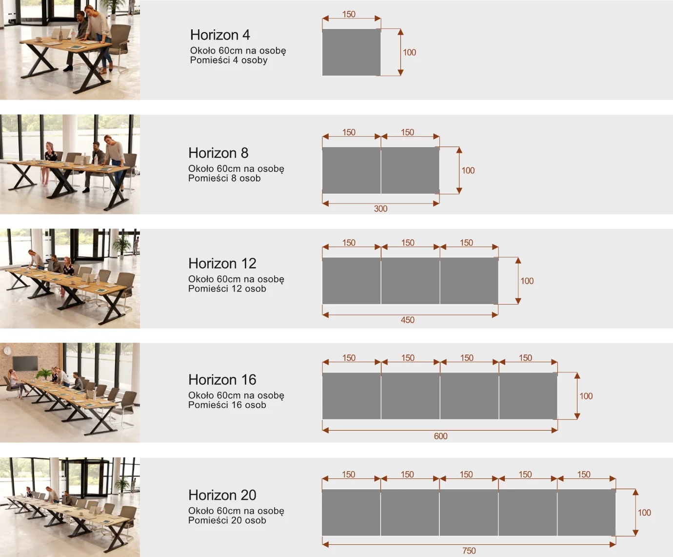 Stół konferencyjny Horizon wyróżnia się nowoczesnym, prostym wzornictwem – prostokątny blat spoczywa na charakterystycznych spawanych nogach z profili metalowych malowanych proszkowo. Dzięki temu konstrukcja jest bardzo stabilna i trwała.