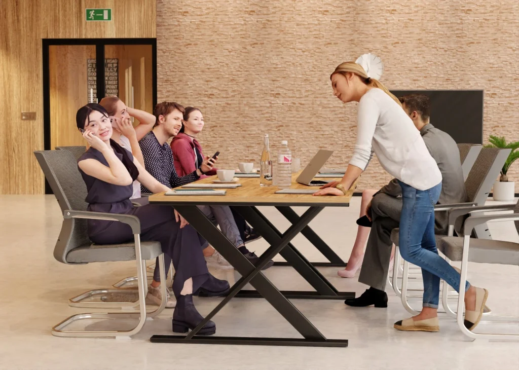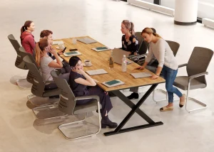 Blat stołu konferencyjnego oparty na nogach w formie litery X oraz płozach na górze i dole stołu.