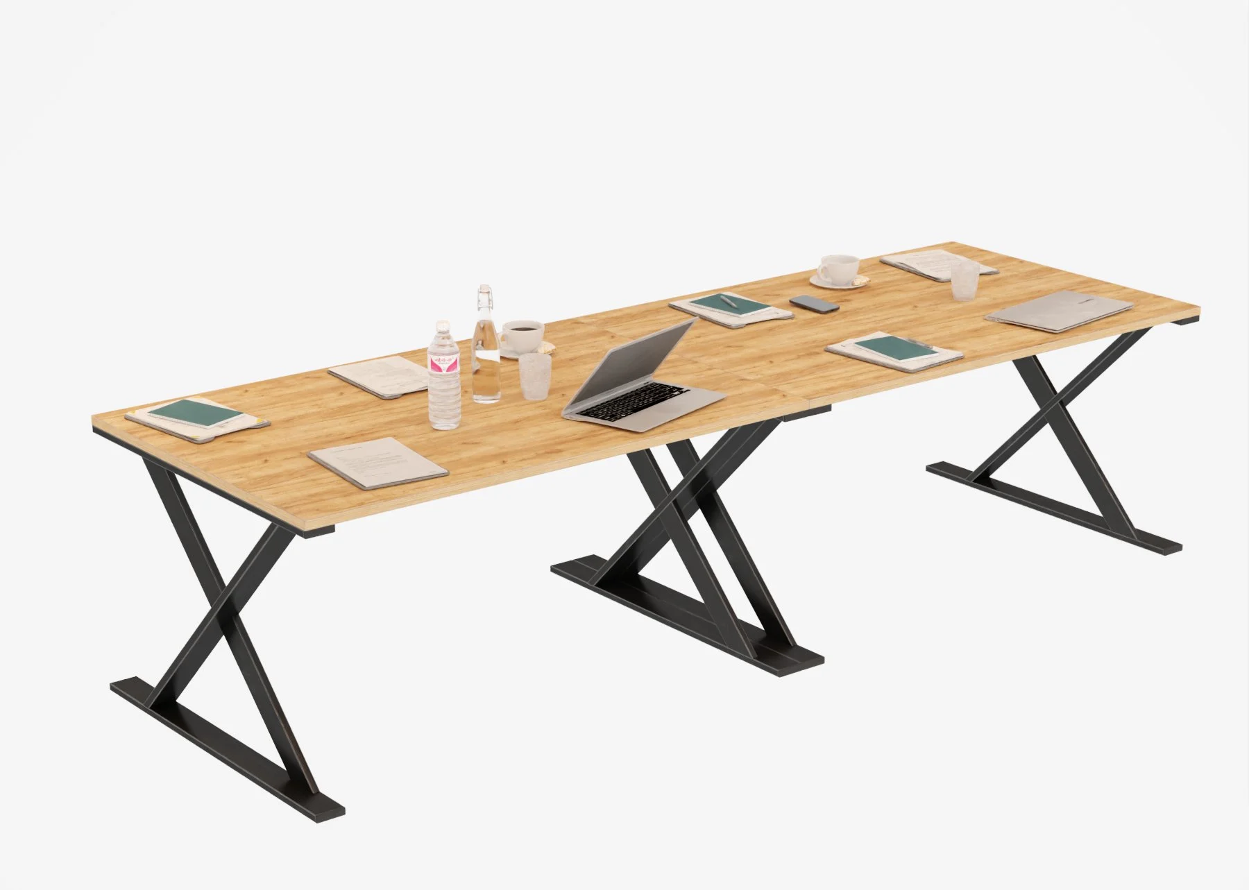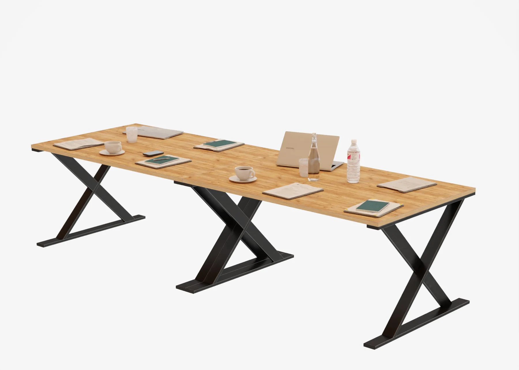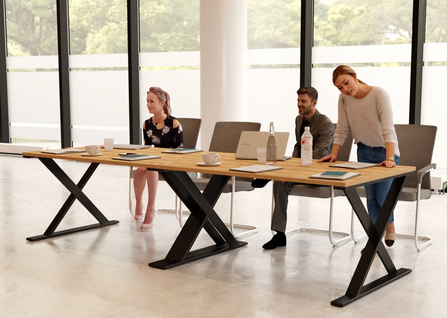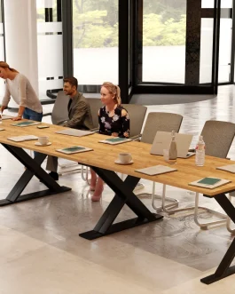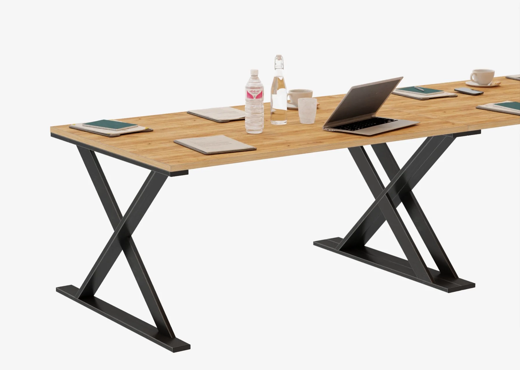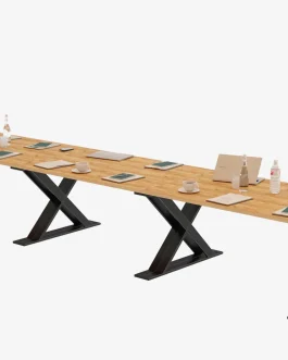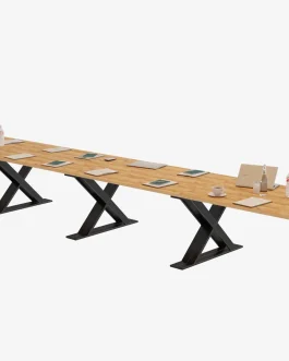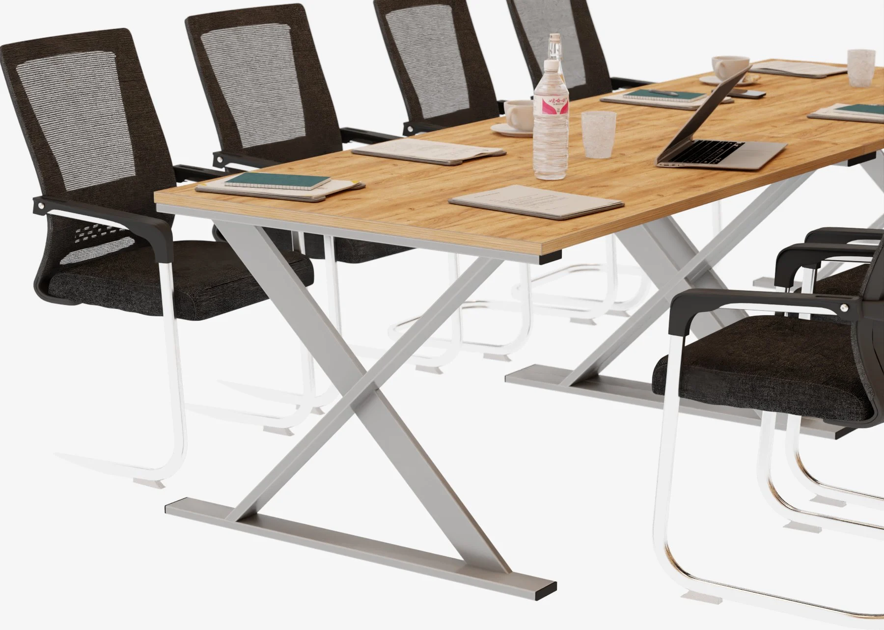Blat stołu konferencyjnego oparty na nogach w formie litery X oraz płozach na górze i dole stołu.