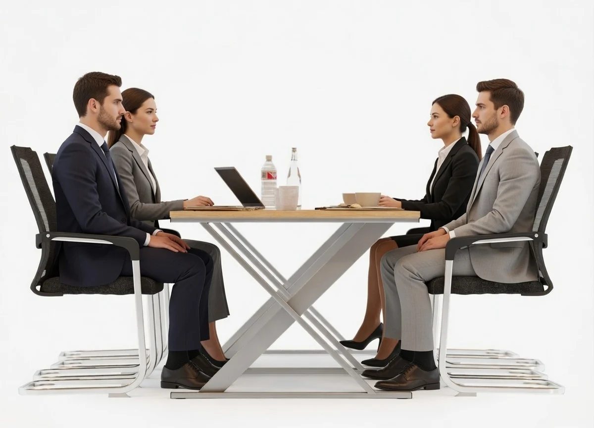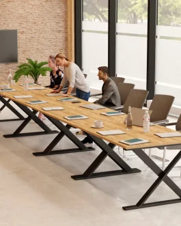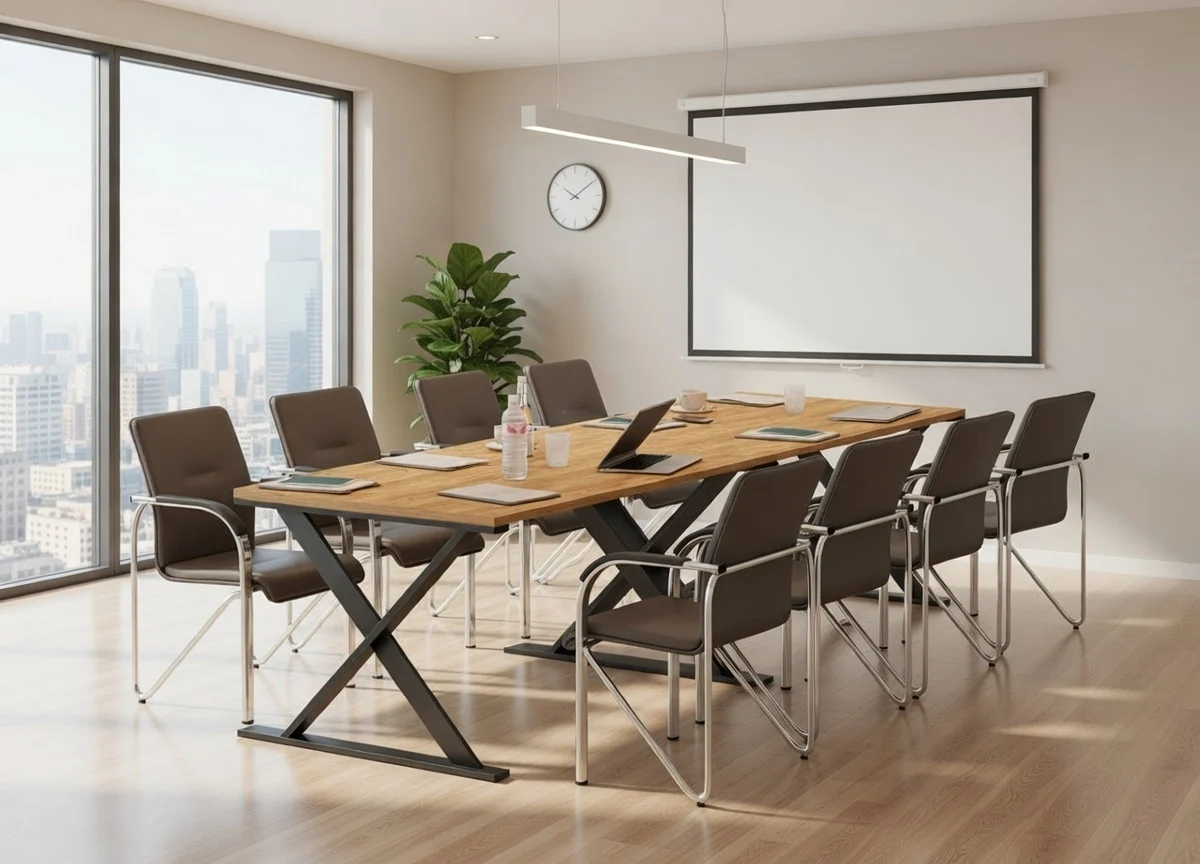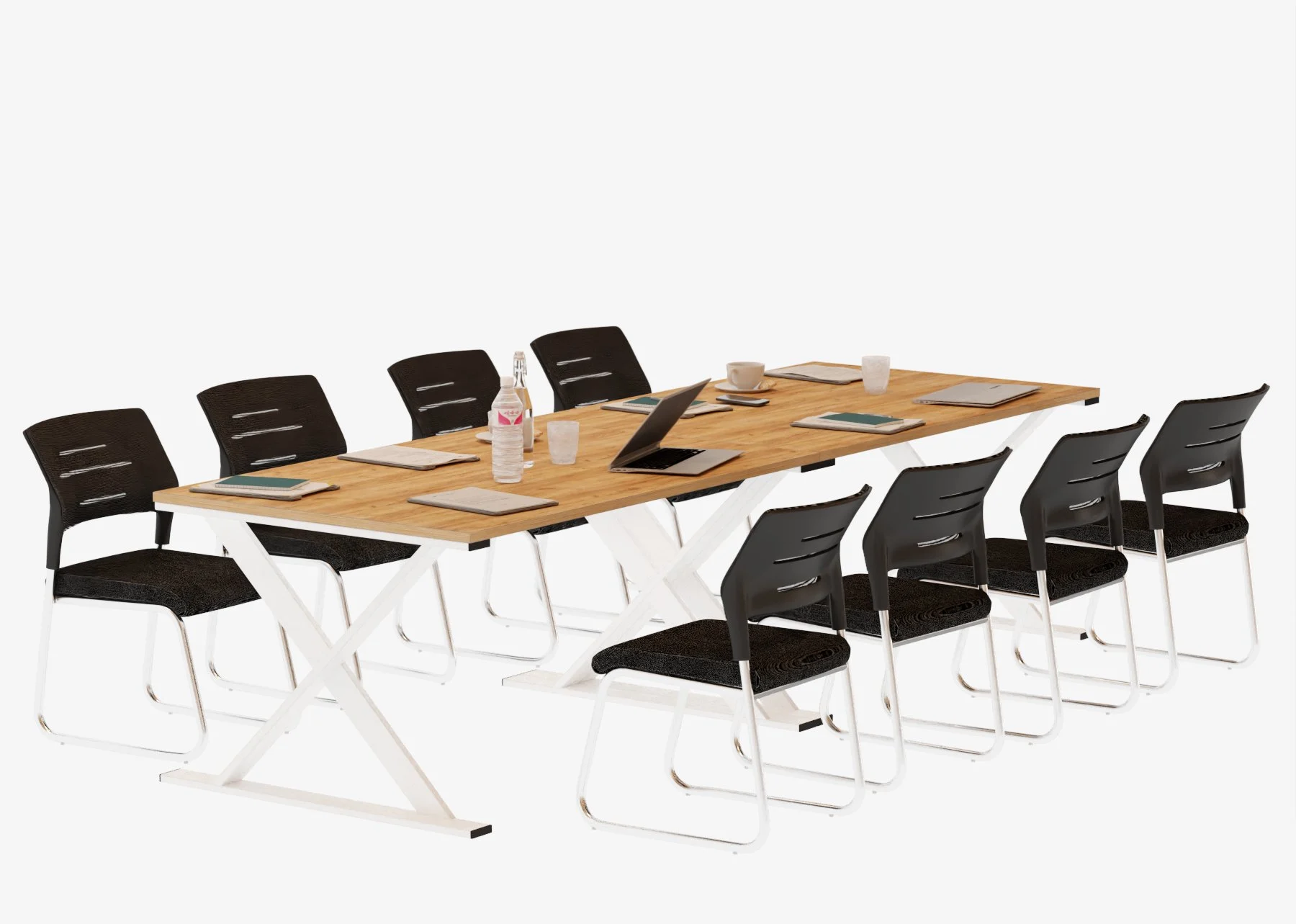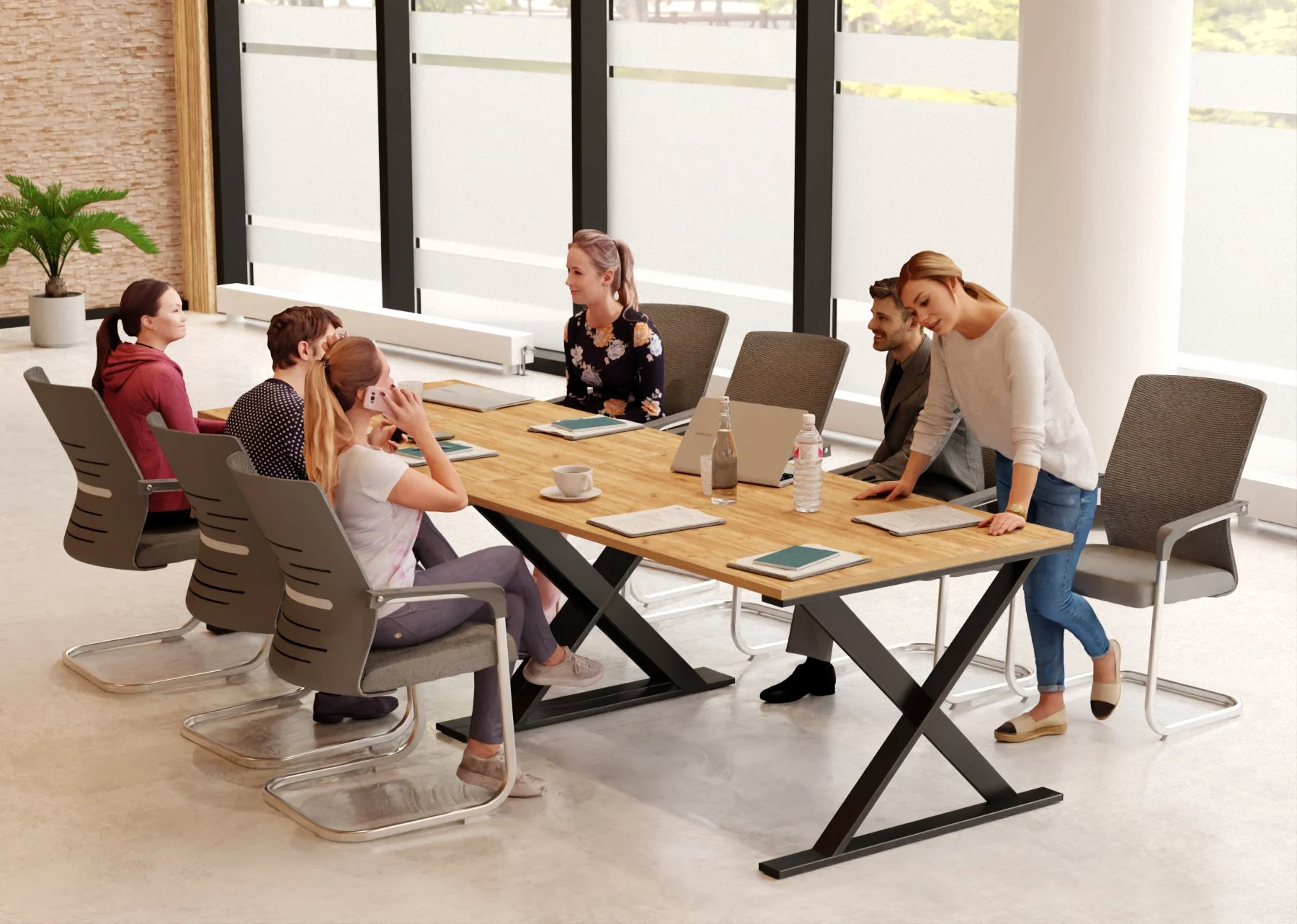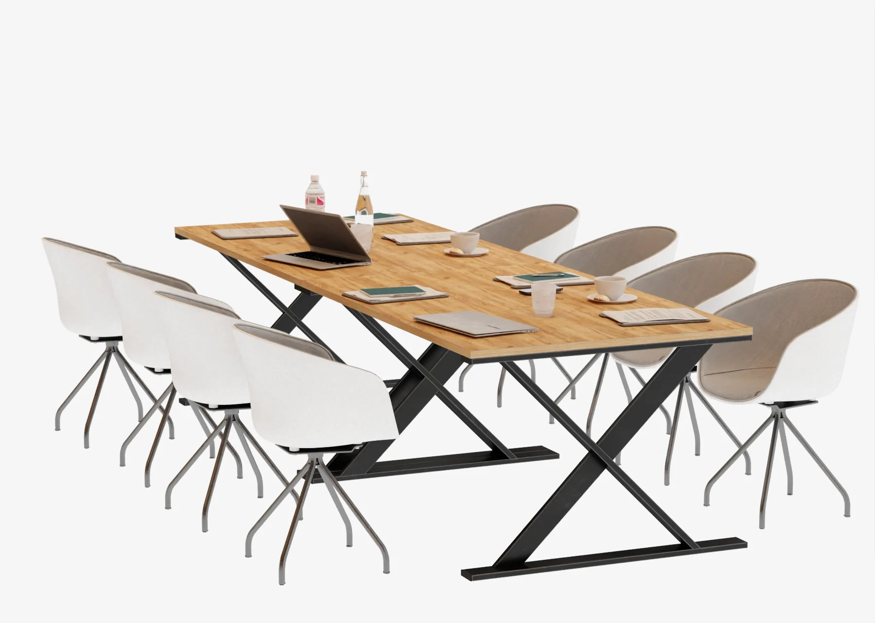 Blat stołu konferencyjnego oparty na nogach w formie litery X oraz płozach na górze i dole stołu.