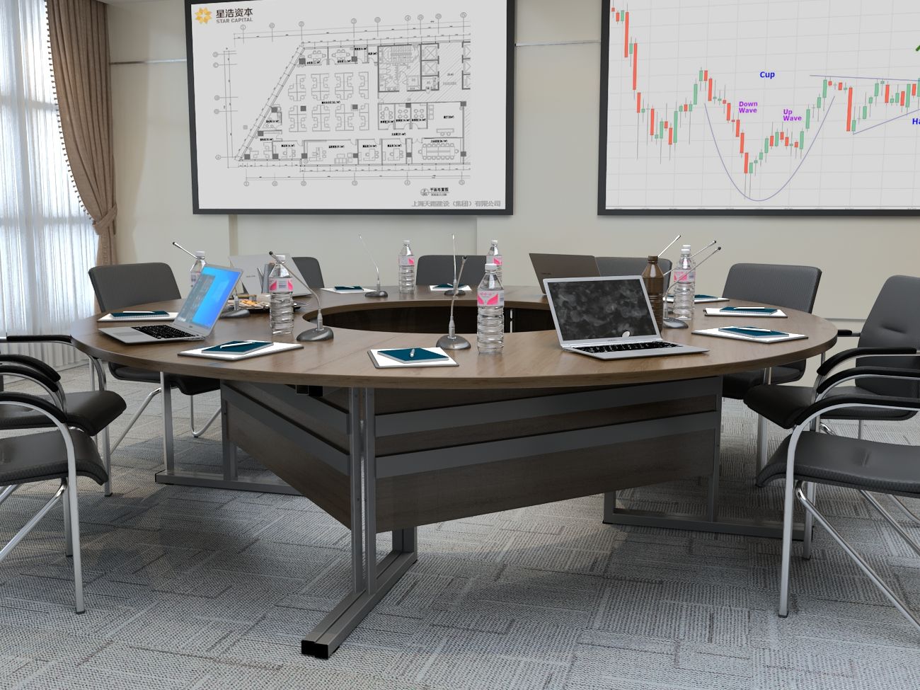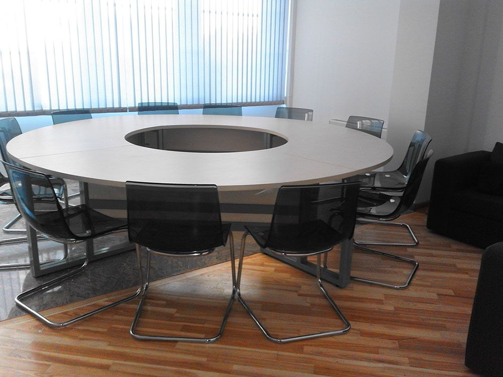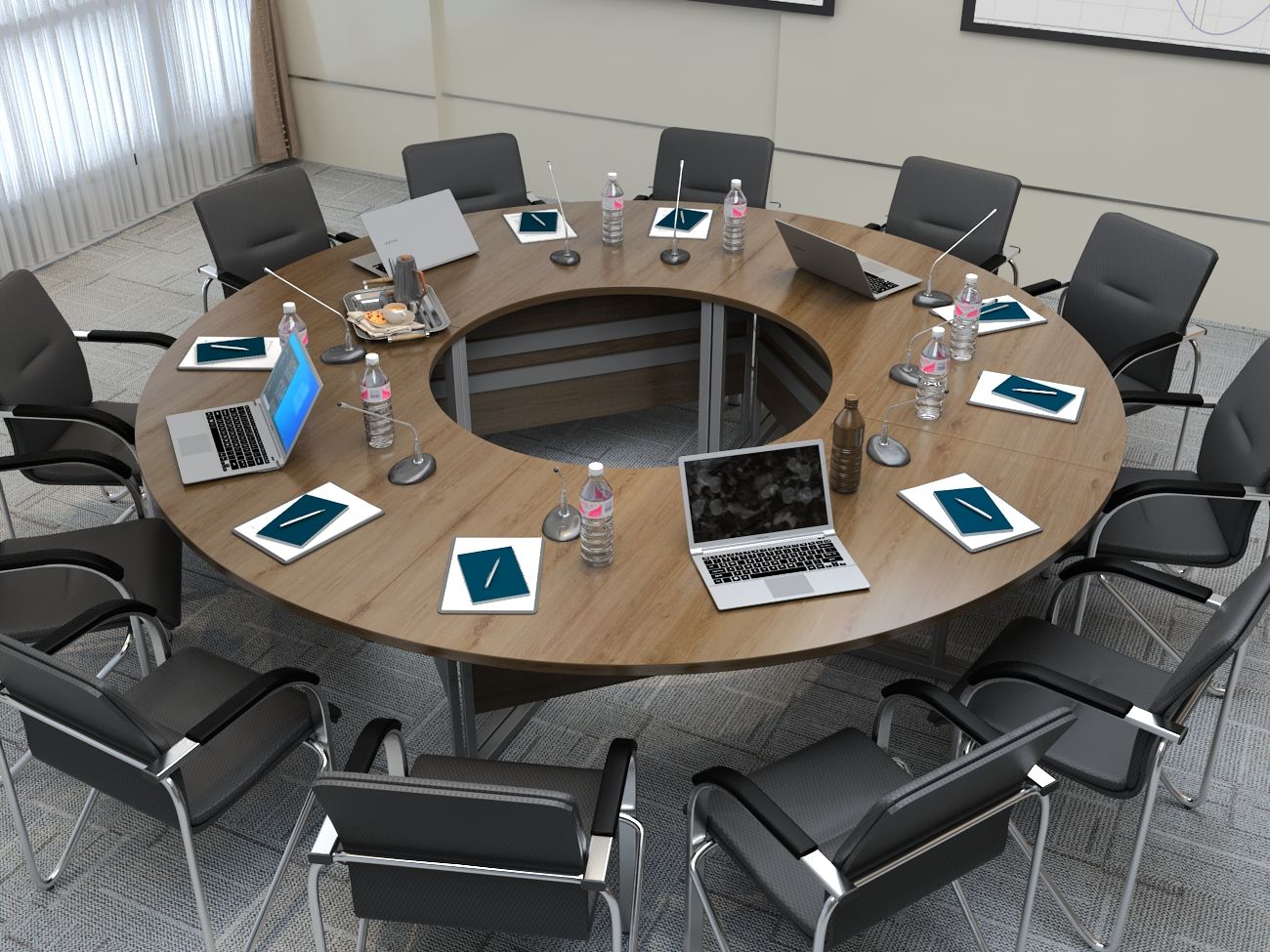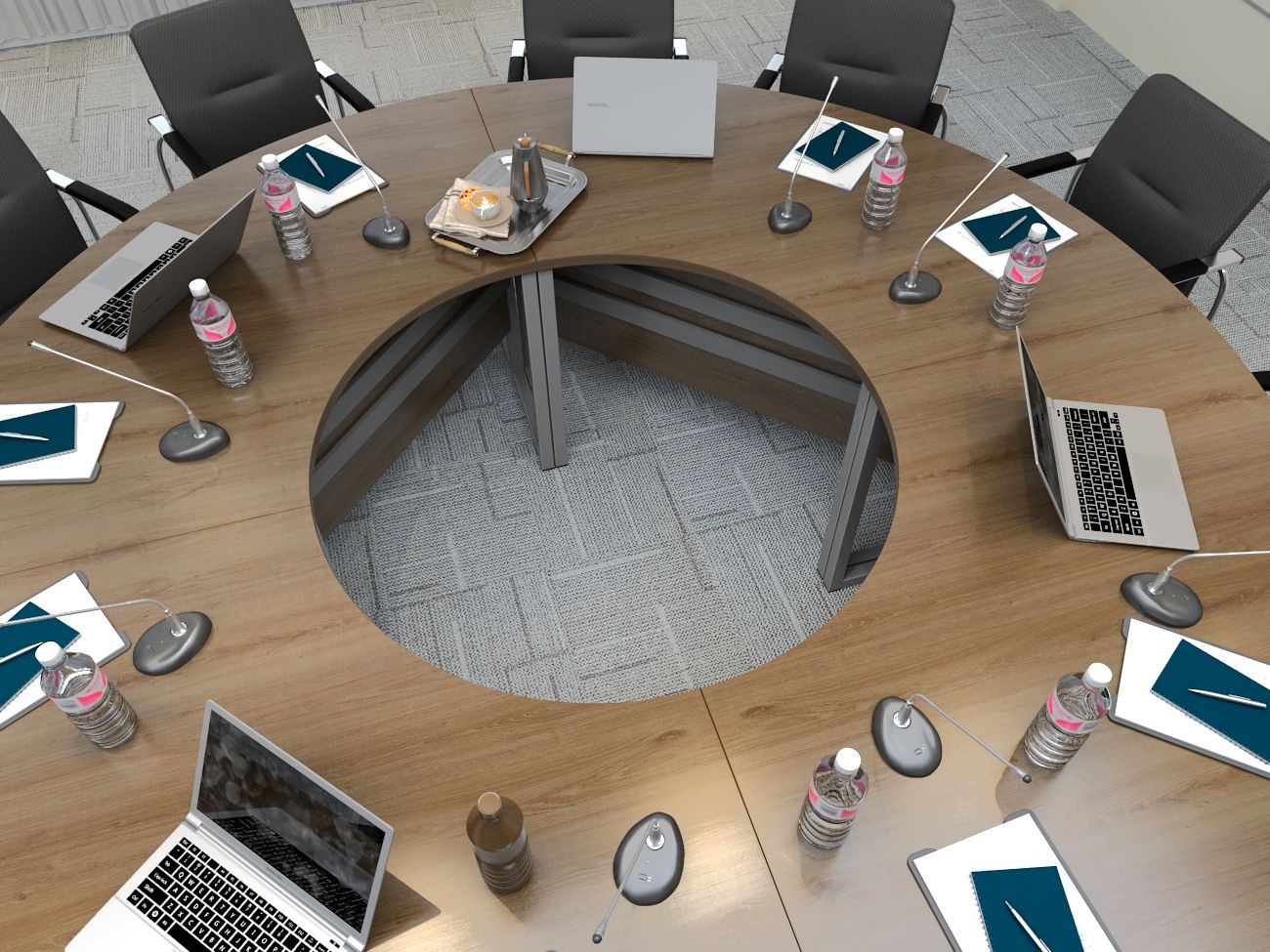 Aranżacja w formie litery C. Stół posiada modułową konstrukcje więc można zmienić aranżacje na inną lub złożyć dany moduł co ułatwia także transport, montaż oraz dostosowanie układu do indywidualnych potrzeb przestrzeni.