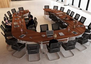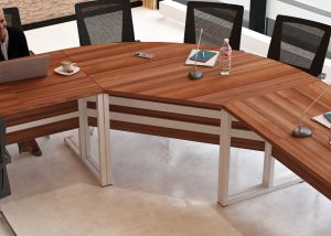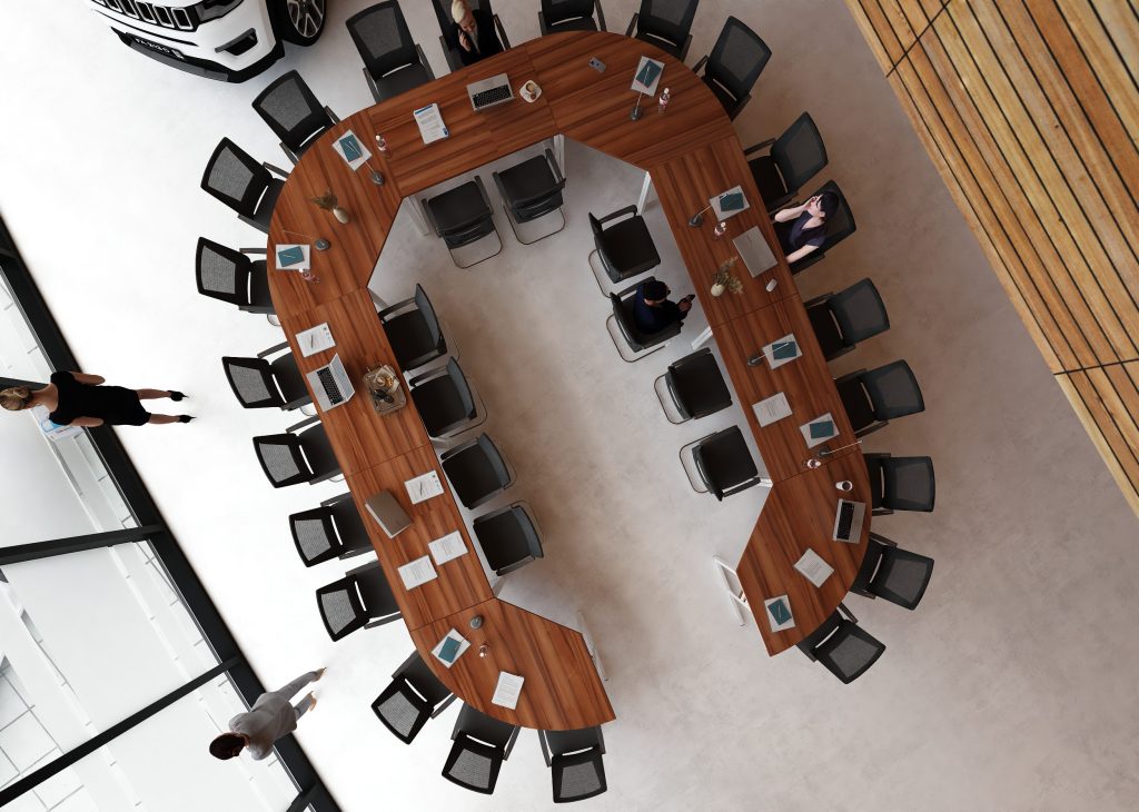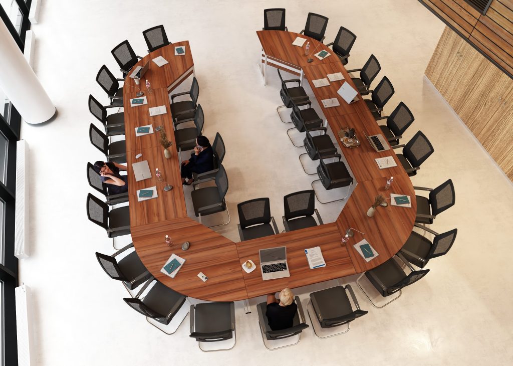 Aranżacja w formie litery C. Stół posiada modułową konstrukcje więc można zmienić aranżacje na inną lub złożyć dany moduł co ułatwia także transport, montaż oraz dostosowanie układu do indywidualnych potrzeb przestrzeni.