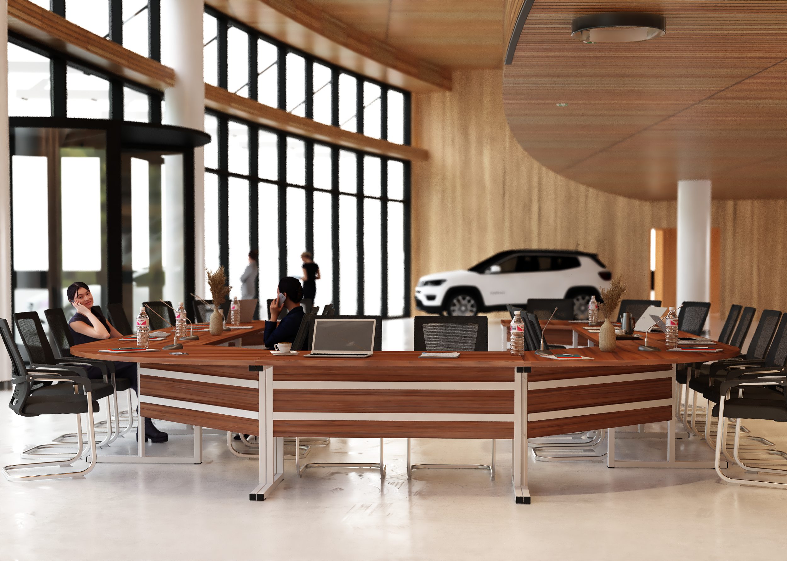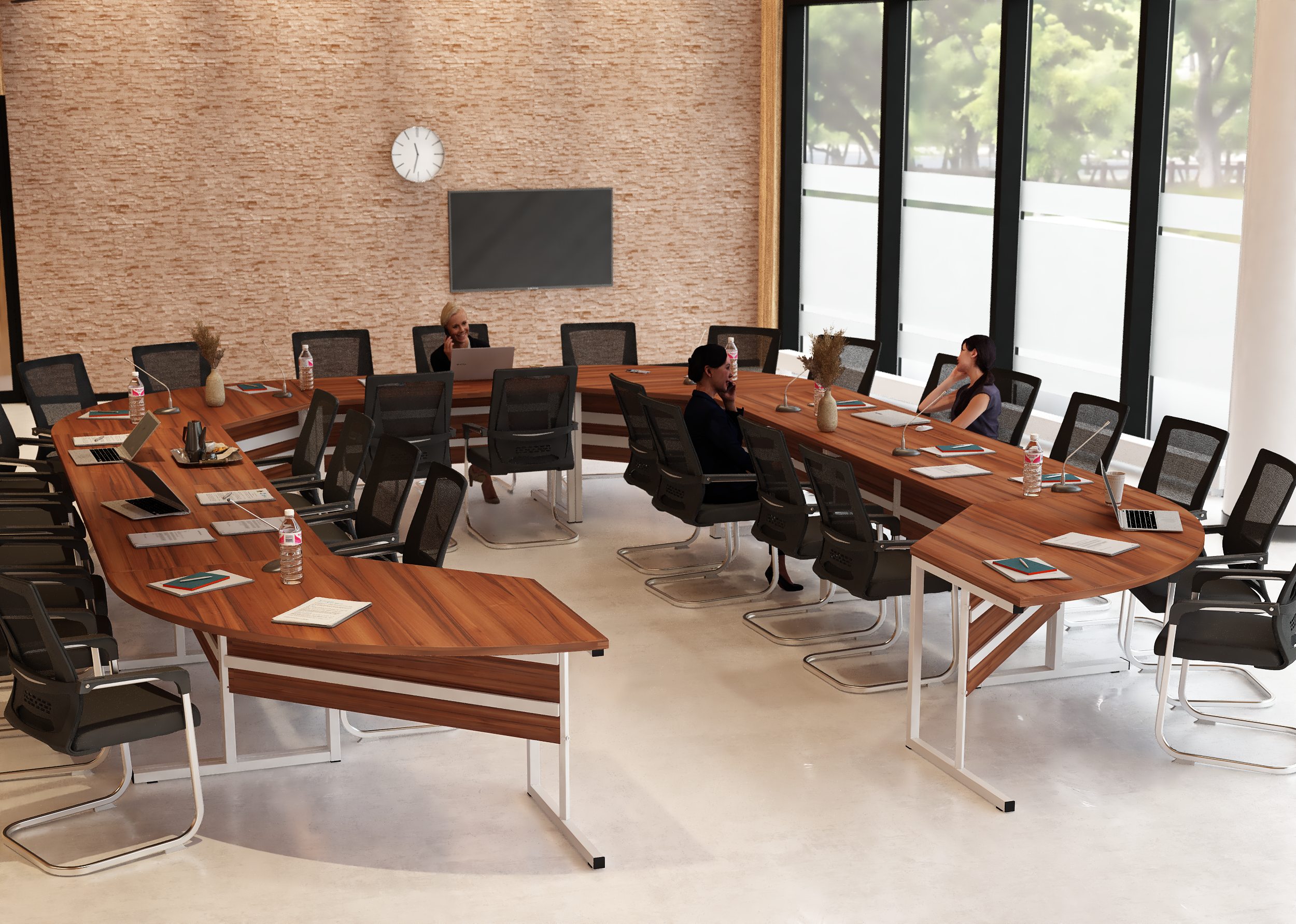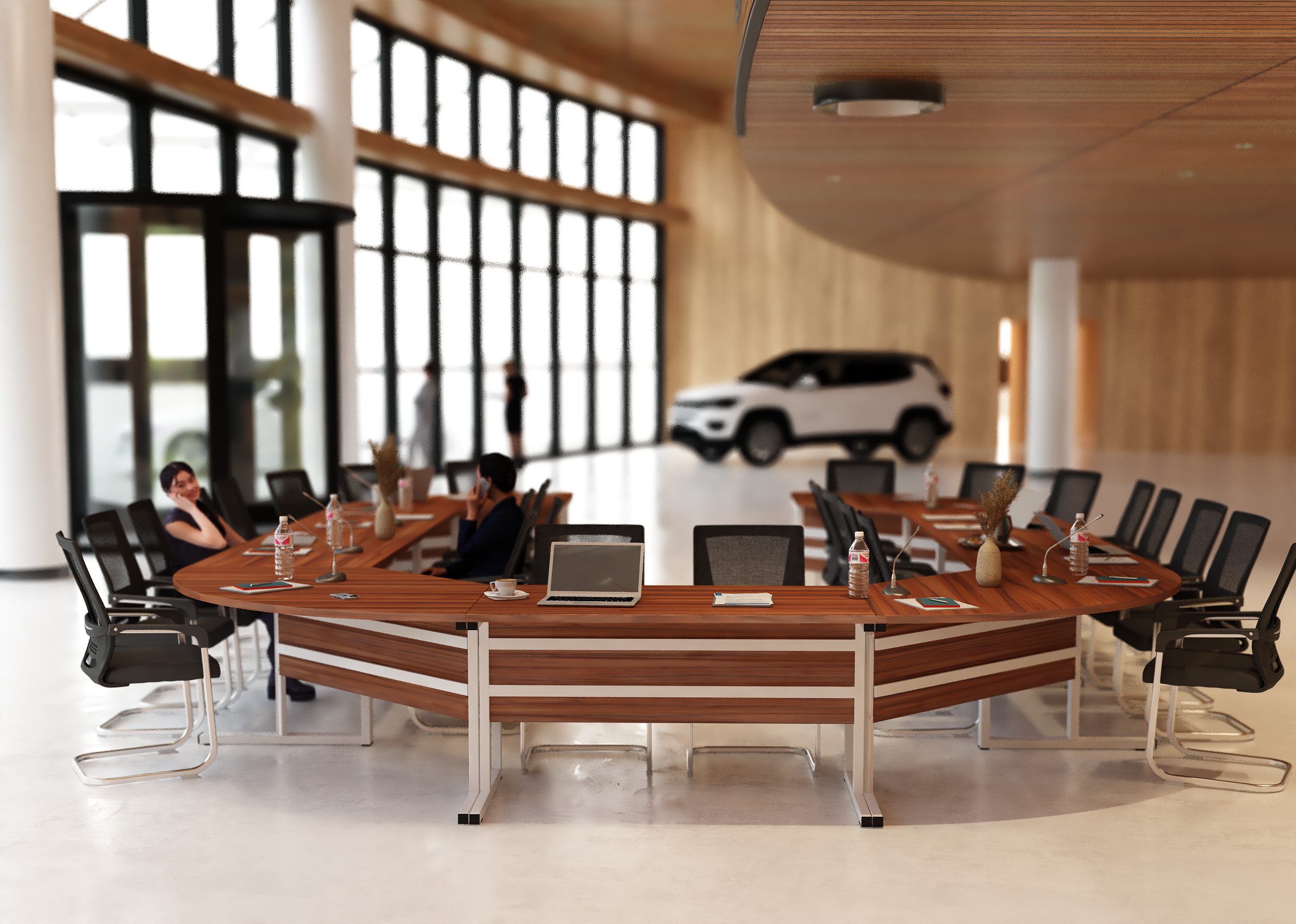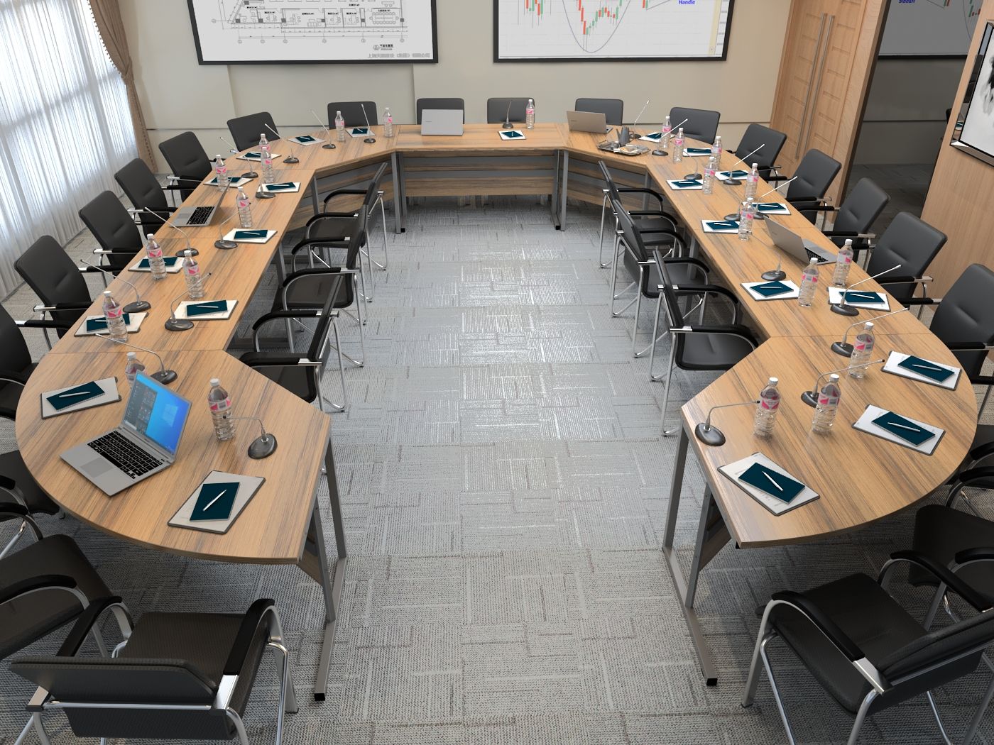 Aranżacja w formie litery C. Stół posiada modułową konstrukcje więc można zmienić aranżacje na inną lub złożyć dany moduł co ułatwia także transport, montaż oraz dostosowanie układu do indywidualnych potrzeb przestrzeni.