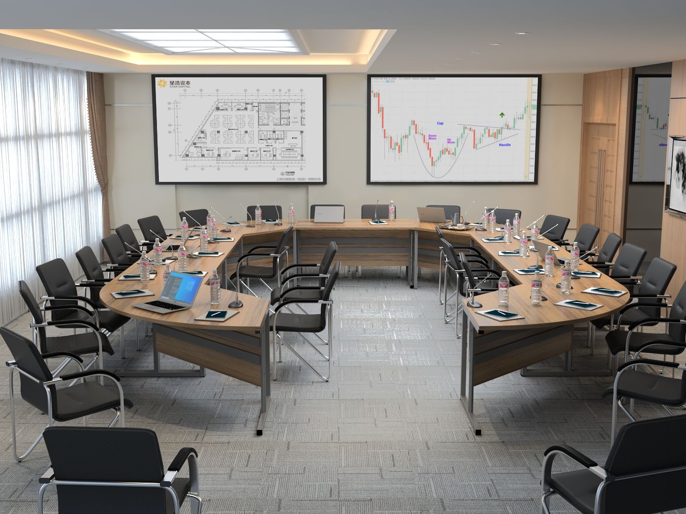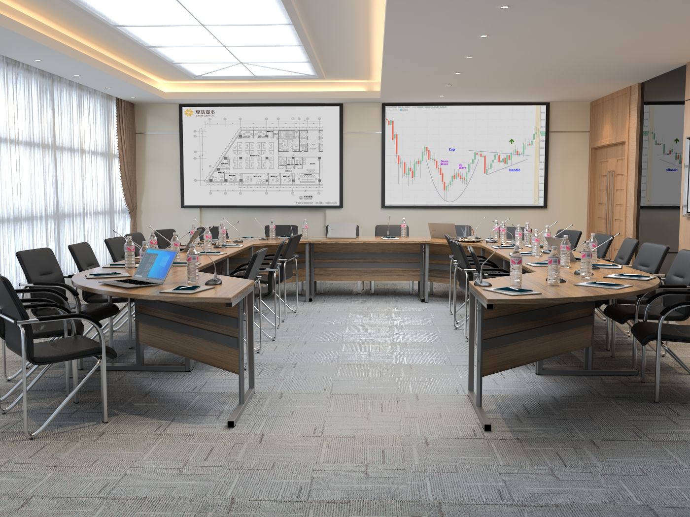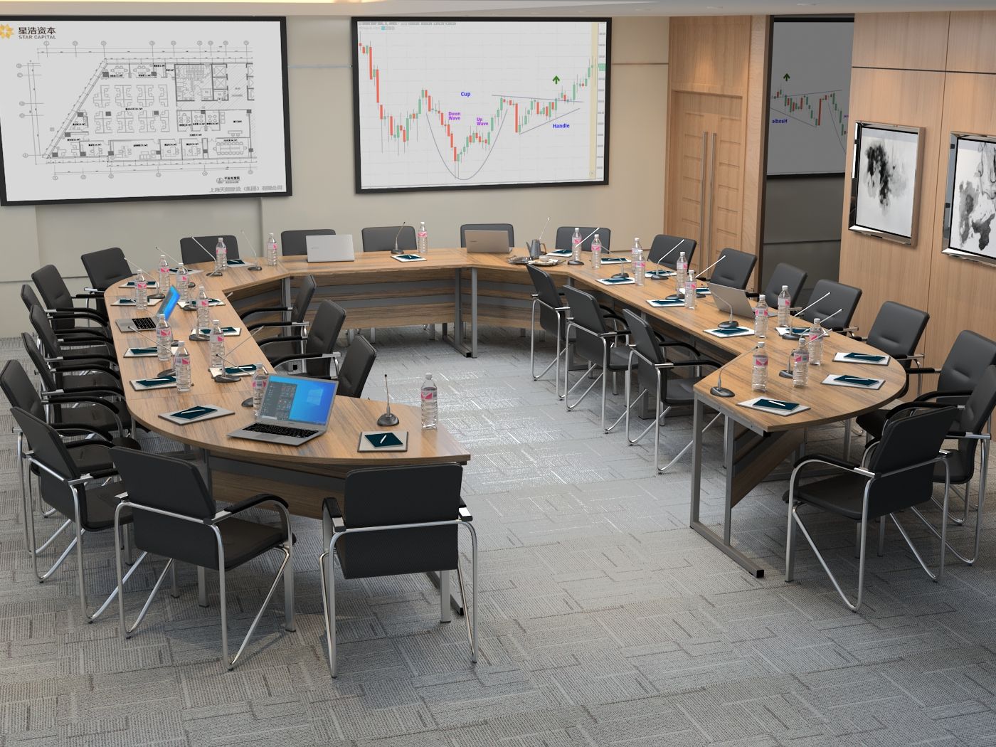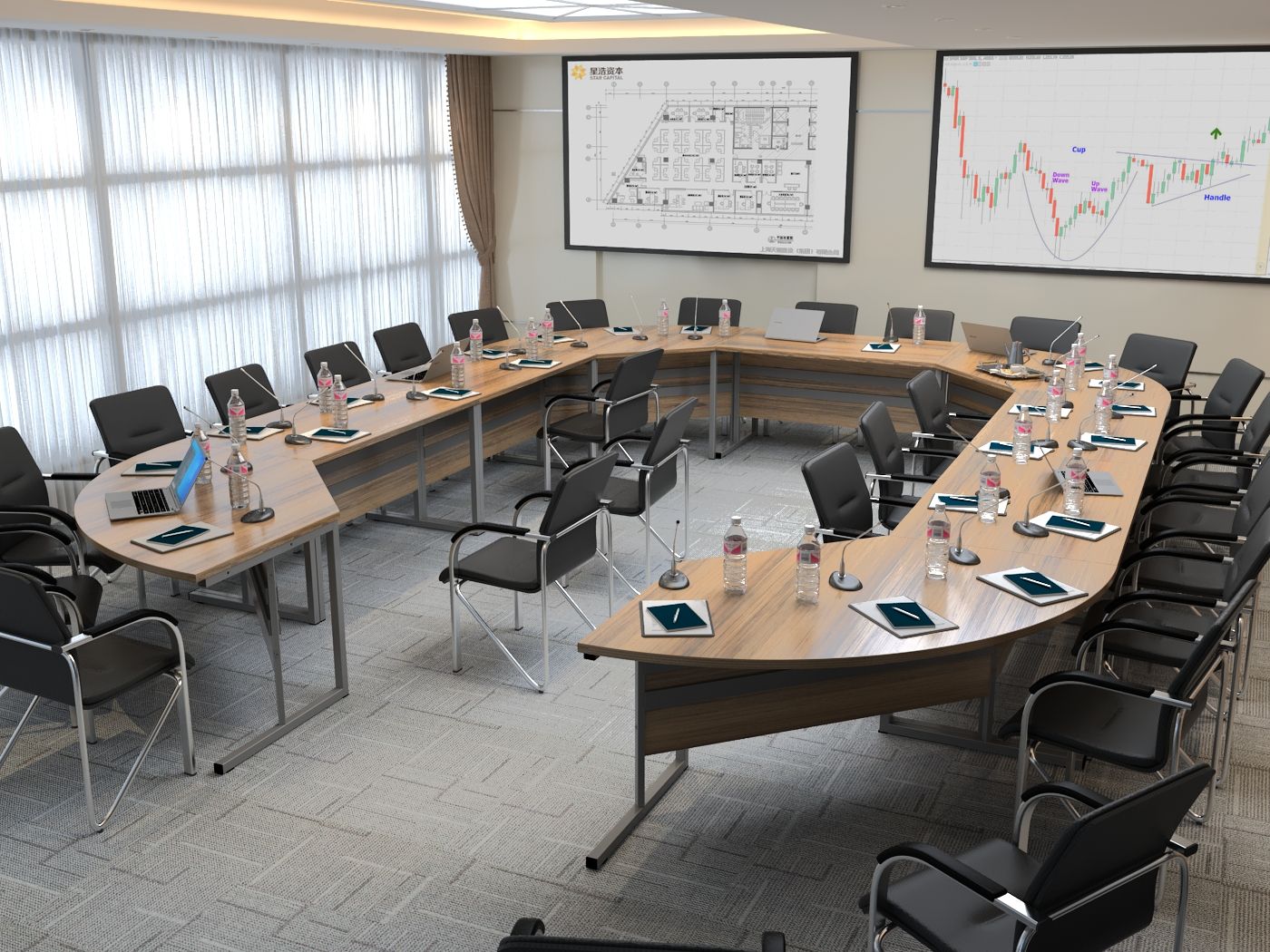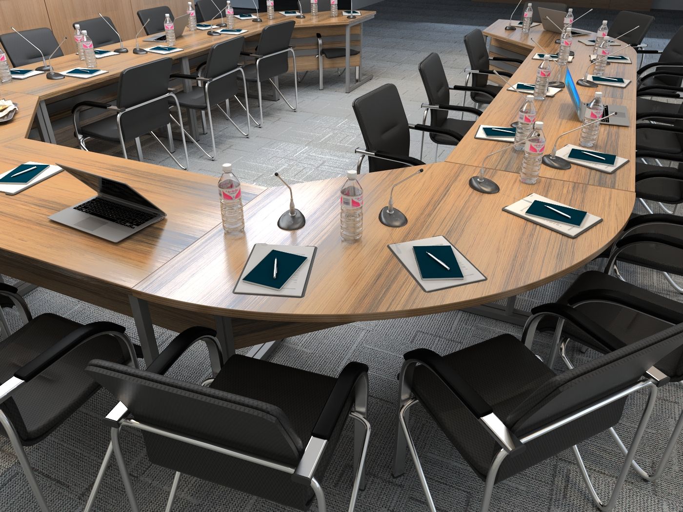 Aranżacja w formie litery C. Stół posiada modułową konstrukcje więc można zmienić aranżacje na inną lub złożyć dany moduł co ułatwia także transport, montaż oraz dostosowanie układu do indywidualnych potrzeb przestrzeni.