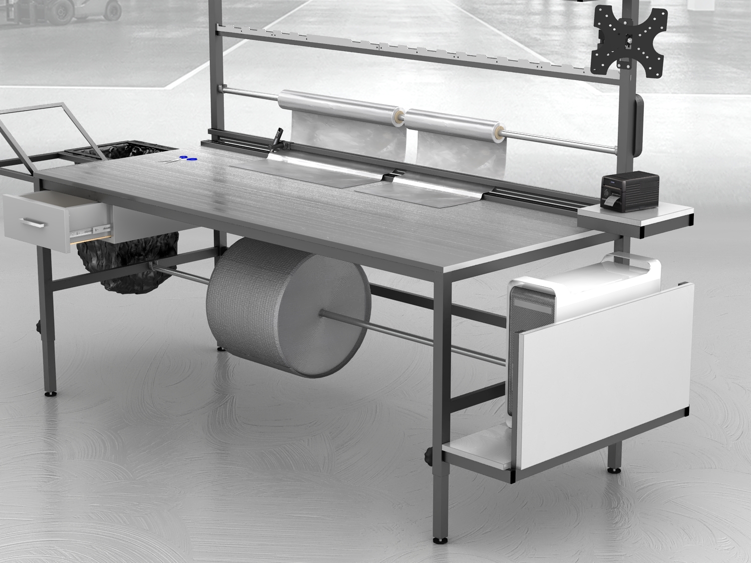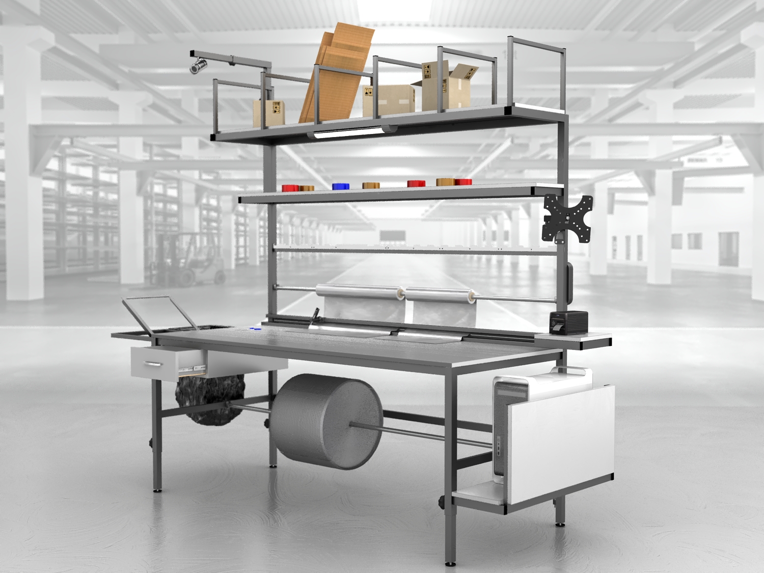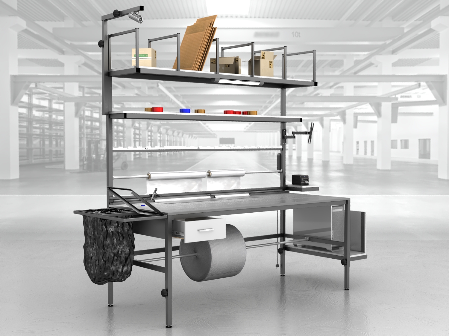 Stół do pakowania paczek to niezastąpione rozwiązanie dla firm poszukujących dobrego, ergonomicznego i funkcjonalnego stanowiska. Nasze stoły pakowe, produkowane są w Polsce, wyróżniają się spawaną solidną konstrukcją, podzieloną dwie części – stół oraz nadstawkę w celu ułatwienia transportu.
