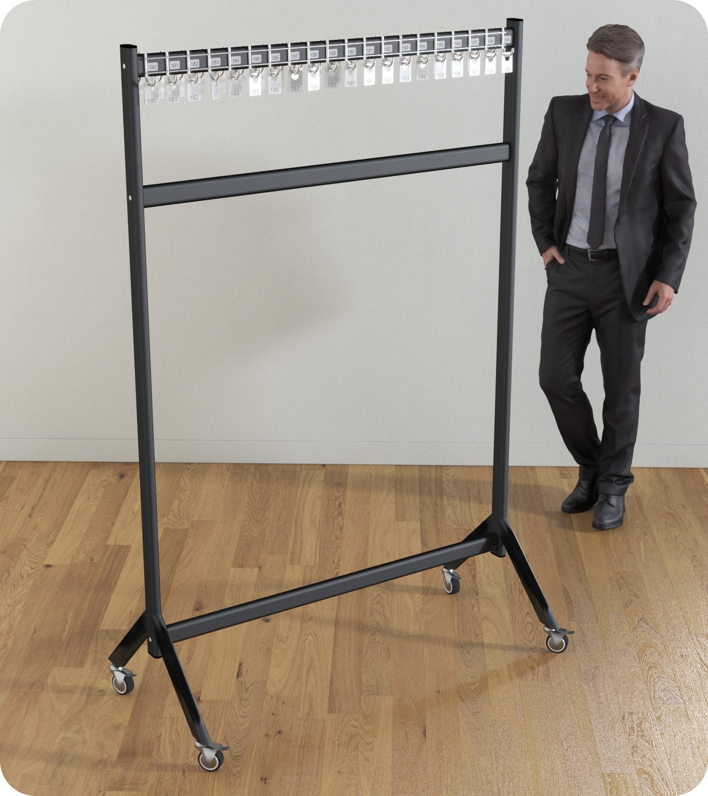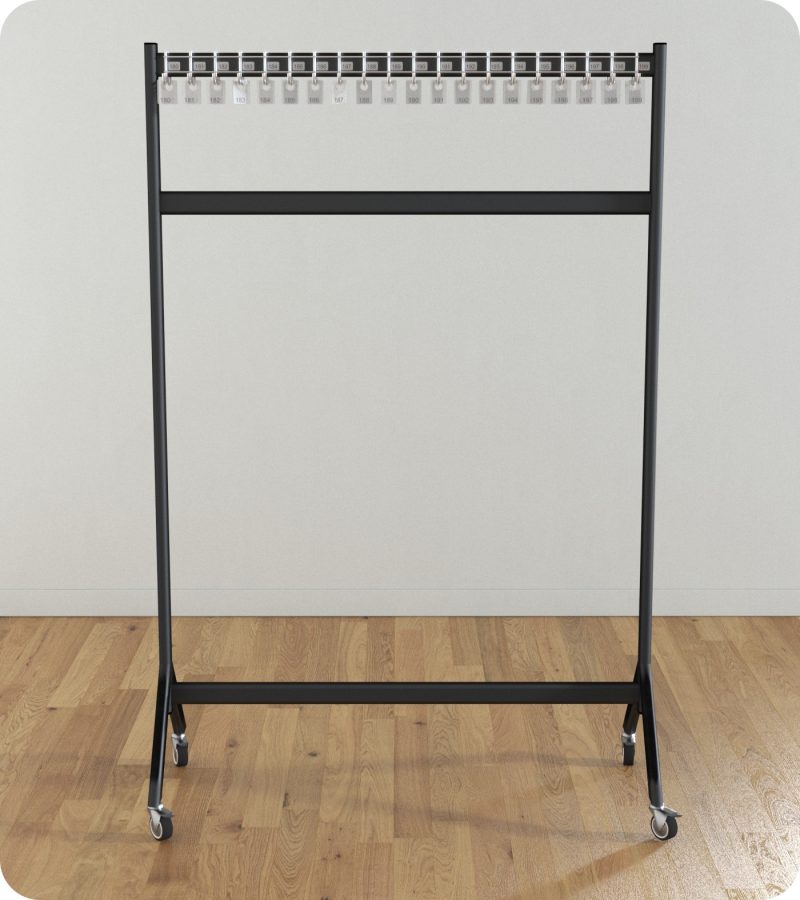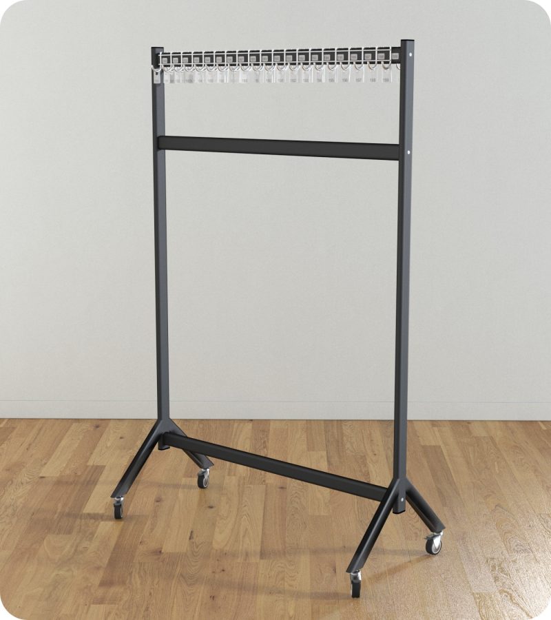 - Warianty mobilne i stacjonarne: Wieszak dostępny jest w dwóch wariantach – mobilnym i stacjonarnym. To pozwala na elastyczne rozmieszczenie w zależności od potrzeb.