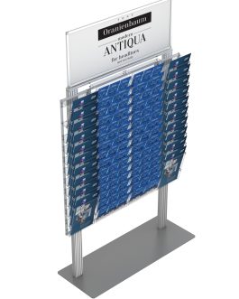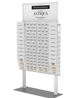 - - Anodowane aluminium stelaż aluminiowy. - Kieszenie odpinane mocowane na spineczki, umożliwiające dopięcie lub odpięcie w razie potrzeby od stelaża. - Stabilna podstawa. - 20 kieszeni A4 pionowo. - 24 kieszenie A4 Poziomo - A5 i DL Pionowo - Ramka na 700x350 na logo lub plakat - Wysokość 193cm z ramką. - Polski produkt
