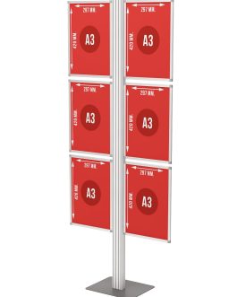 - - Anodowane aluminium stelaż aluminiowy. - Ramki A3 odpinane mocowane na spineczki, umożliwiające dopięcie lub odpięcie w razie potrzeby od stelaża. - Stabilna podstawa. - 6 ramek plakatowych A3 297 x 420mm - Polski produkt.