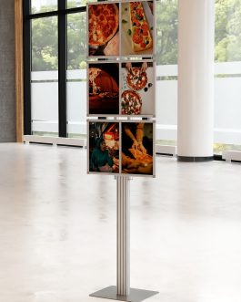 - - Anodowane aluminium stelaż aluminiowy. - Ramki A3 odpinane mocowane na spineczki, umożliwiające dopięcie lub odpięcie w razie potrzeby od stelaża. - Stabilna podstawa. - Ramka A3 297 x 420mm - 2 kieszenie na ulotki A4 poziomo na ulotki A4 A5 i DL - Wysokość 160cm - Polski produkt.