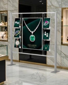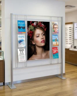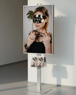 - - Anodowane aluminium stelaż aluminiowy. - Ramka odpinana mocowana na spineczki, umożliwiające dopięcie lub odpięcie w razie potrzeby od stelaża. - Stabilna podstawa. - Ramka plakatowa 2x B1. - Ulotki A4 poziomo, A5 i D pionowo - Wysokość 170cm. - Składany stelaż. - Polski produkt.