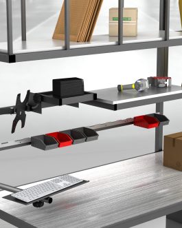 - Specyfikacja stołu ze zdjęcia: - Rolki/kule do przesuwania ciężkich przedmiotów - długość 180cm - głębokość 80cm - wysokość blatu roboczego 90cm - wysokość 215cm - 2x półka górna - nóż - półka na drukarkę kodów kreskowych - przegrody na kartony przesuwane - pojemniki na odpady - Rolka górna - Rolka dolna - Mocowane VESA na monitor - Nóż - Półka boczna…